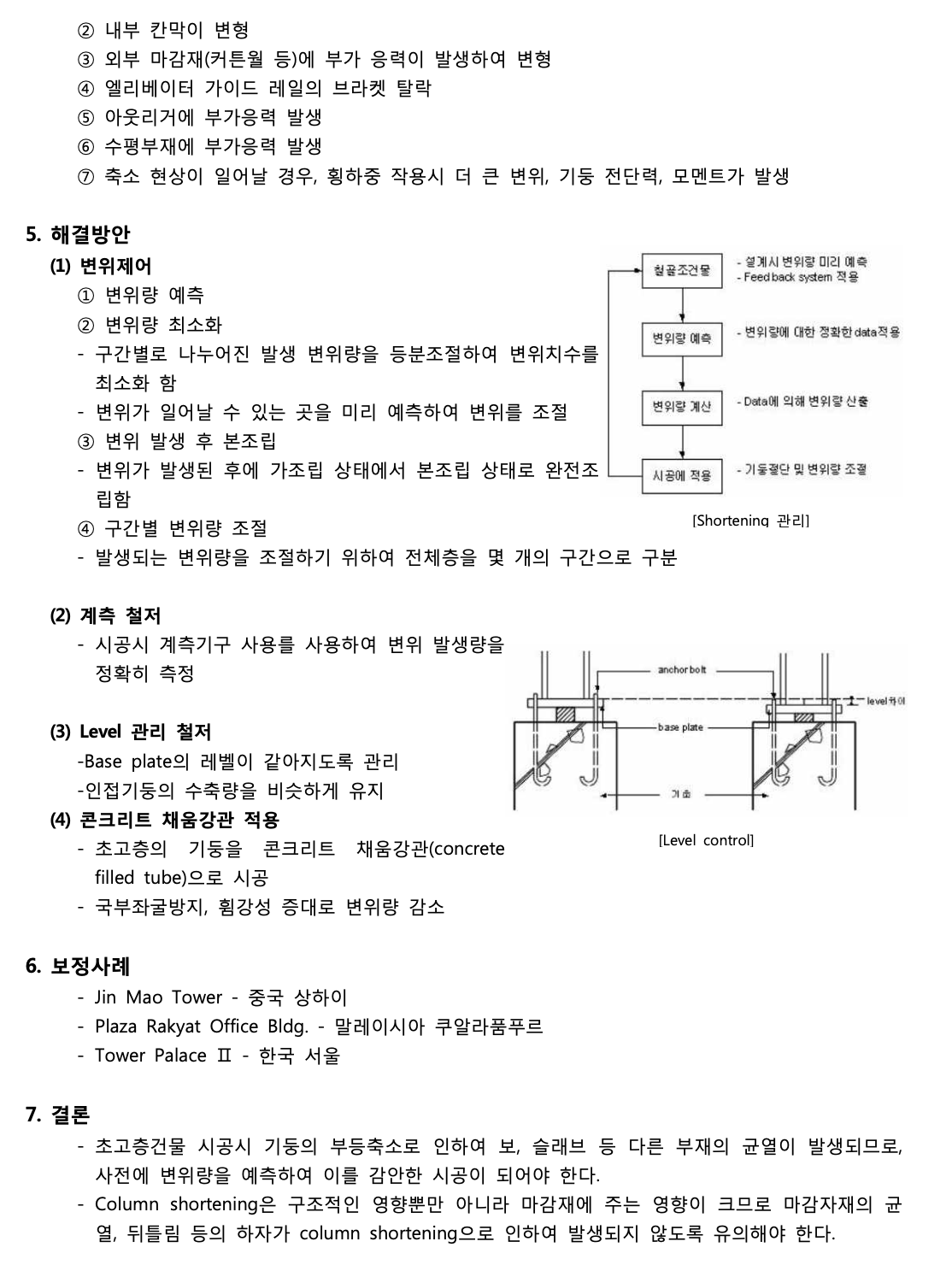 - 슬래브 타설 전에 발생할 축소량 슬래브 설치 전에 발생한 축소량은 수평부재에 부가하중을 유발하지 않으며 시공시 슬래브 레벨을 맞추는 과정에서 보정이 이루어진다. 슬래브 타설시 거푸집의 높이를 설계위치까지 조절하면 보정할 수 있다.
