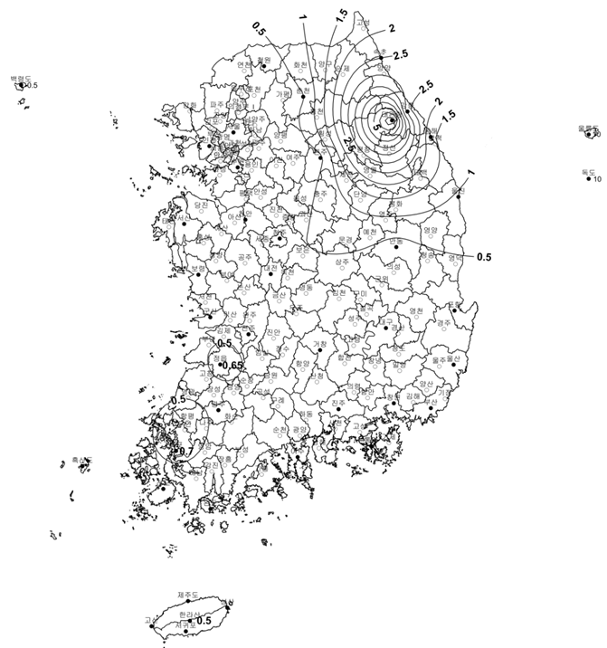 - 지붕적설하중을 산정하기 위한 지상적설하중은 기본지상적설하중 그림에 따른다. 이때 지역적 기후와 지형에 따라 국부적인 변화를 초래할 수 있다는 점을 고려해야 한다. 지상 적설하중이 3.0 이하인 지역의 고지대나 산간지방 같은 특정한 지형조건에서는 그림의 값을 1.5배 하여 기본지상적설하중으로 한다.