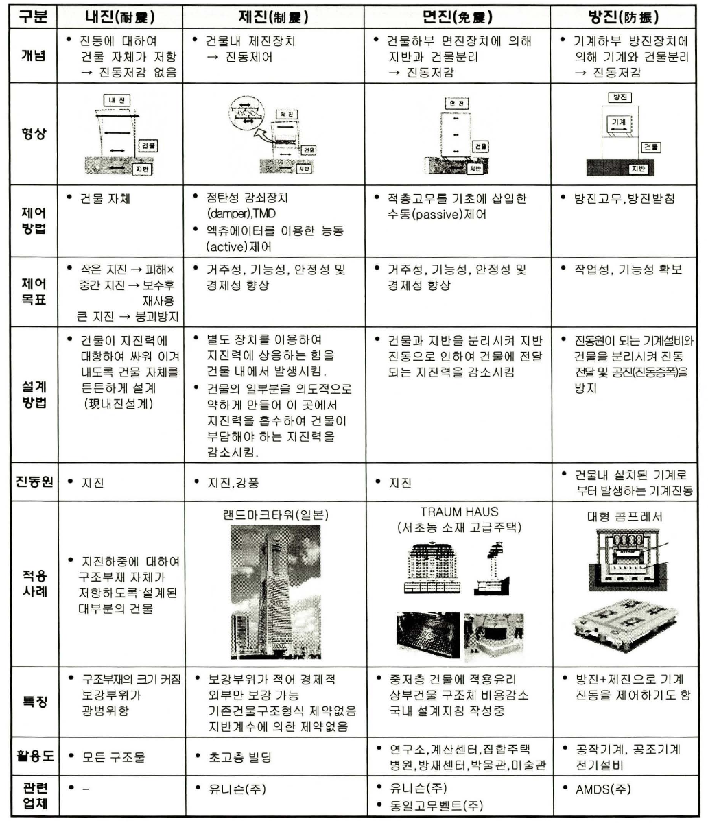 구조물과 지반을 분리시켜 지반진동으로 인한 지진력이 직접 구조물로 전단되는 양을 감소시킨다. 건물의 기초하부나 중간층에 면진층을 설치하여 지진력을 저감시킨다 건물의 장주기화를 위해 적층고무, 베어링 등 면진장치 설치 동시에 지진에너지를 흡수하기 위해 탄성댐퍼와 오일댐퍼 설치 적층고무 자체에 에너지 흡수력이 있는 고감쇠 고무를 이용하기도 함.