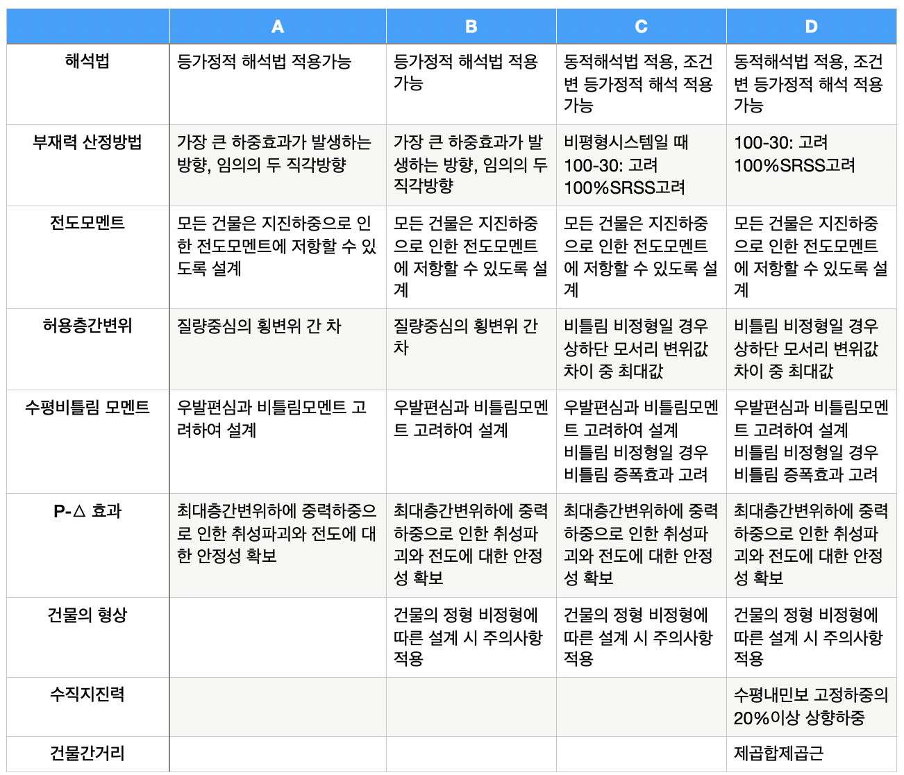 - 해석법 : 동적해석법 적용, 조견별 등가정적 해석 적용 가능, 추가내용은 내진설계범주별 해석법 참조