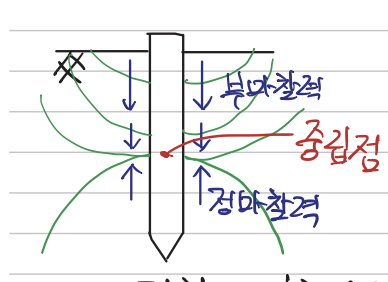 부마찰력이 정마찰력으로 변하는 위치 말뚝의 침하량과 주변지반의 침하량이 같은 지점으로 부마찰력이 정마찰력으로 변화하게 되며 말뚝의 압축력이 최대가된다.