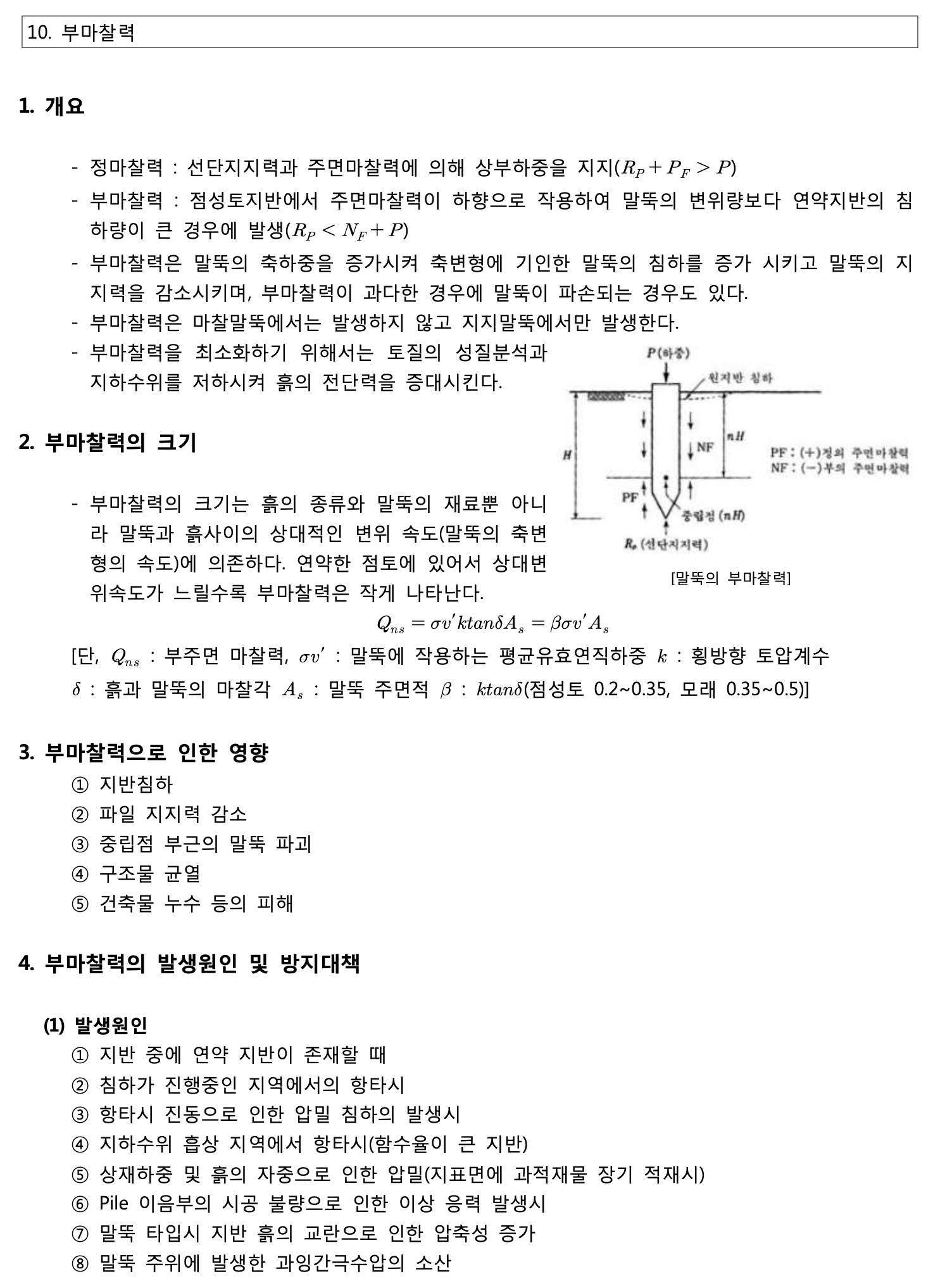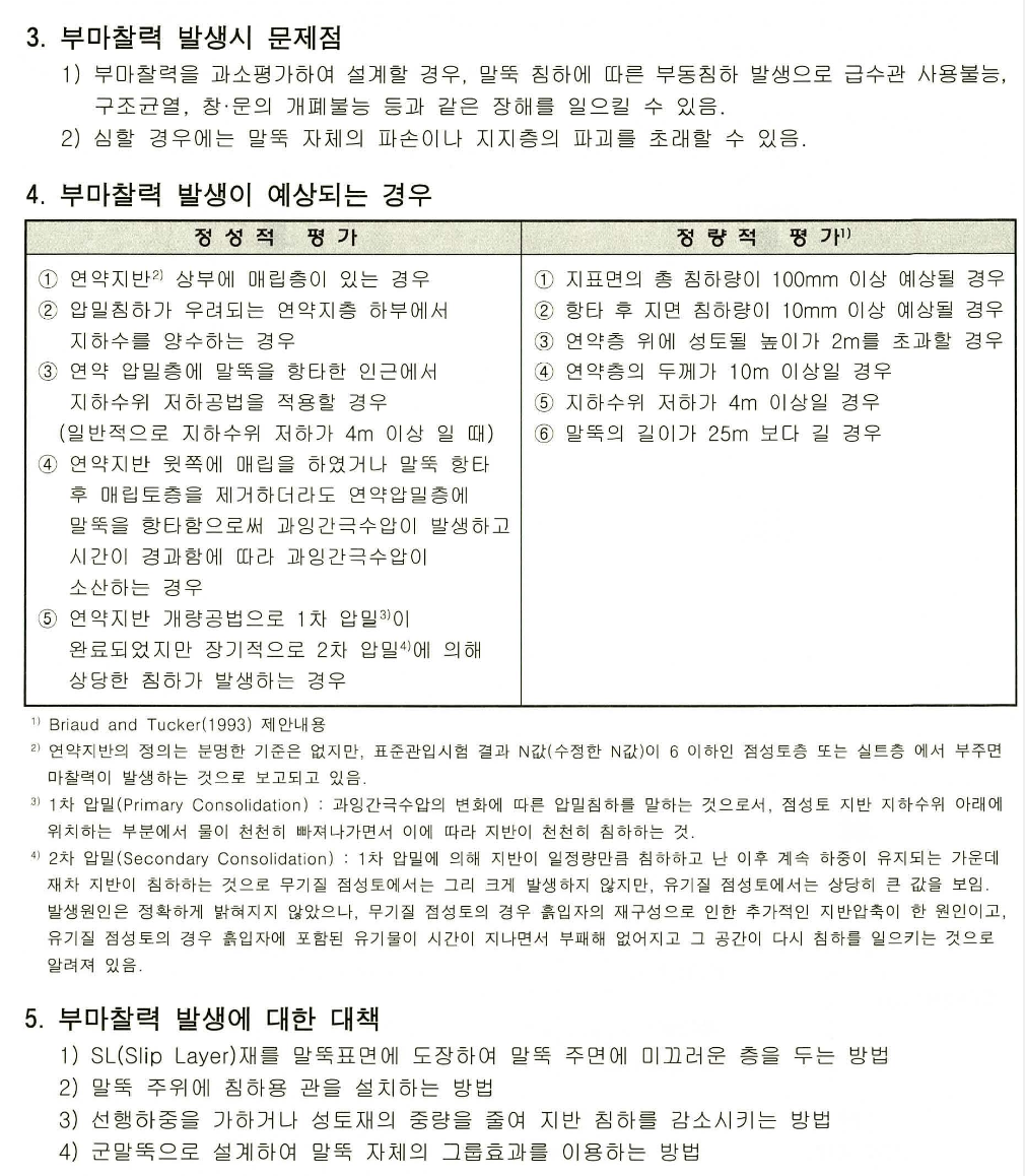 - 기준 지반침하가 생기는 지역 및 그 가능성이 있는 지역으로 15m 이상에 걸쳐 압밀층 및 그 영향을 받는 층을 관통하여 타설된 지지말뚝의 설계에 있어서는 일반하중에 대한 검토를 행하는 외에 말뚝주면에 하향으로 작용하는 부마찰력에 대한 말뚝 내력의 안정성을 검토하여야 한다.