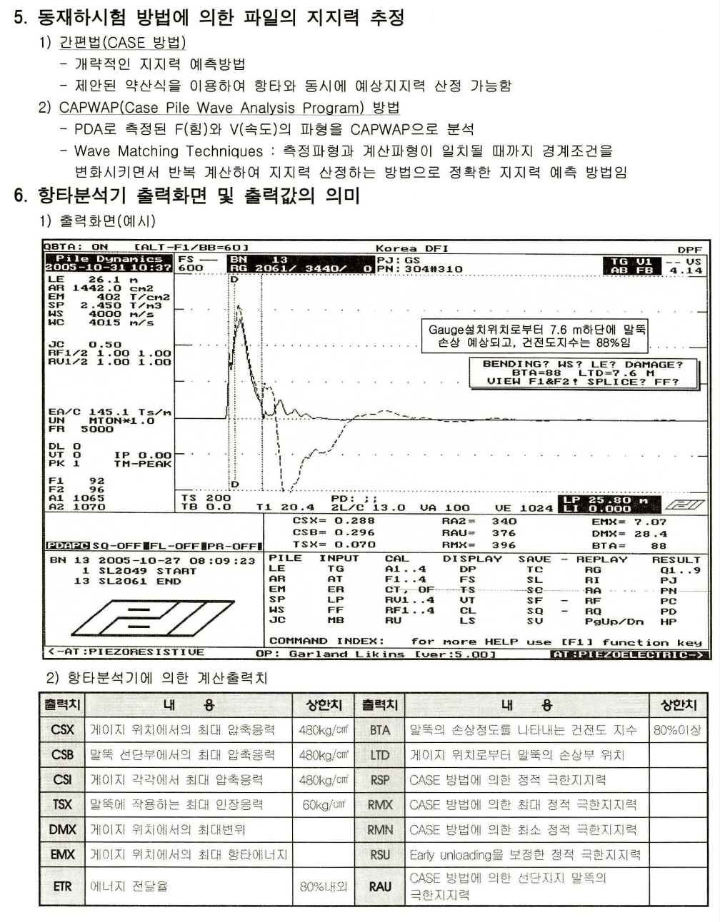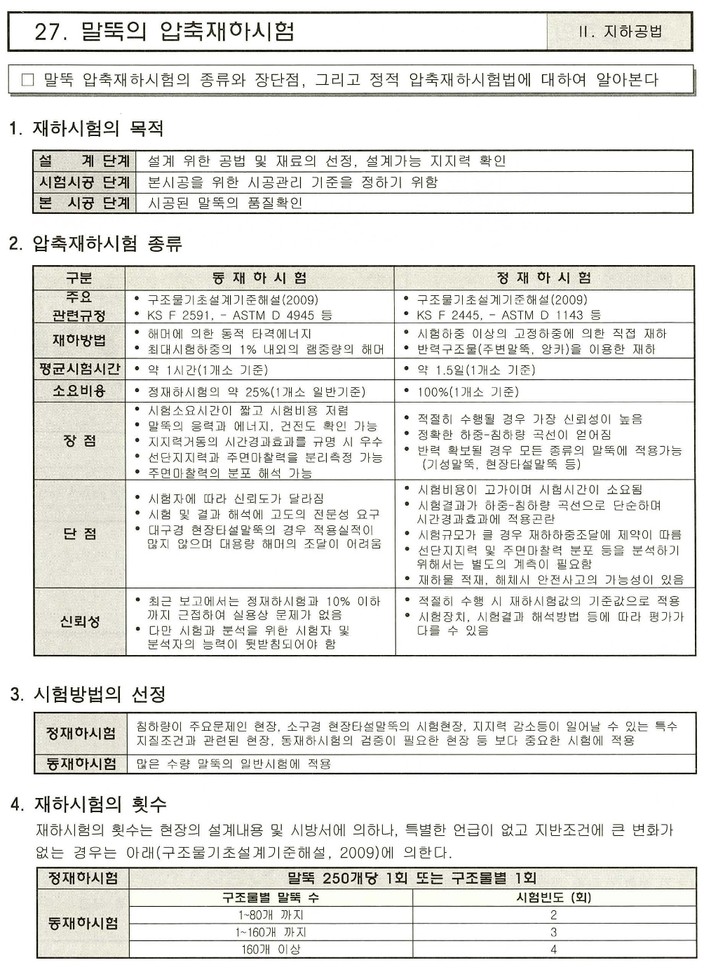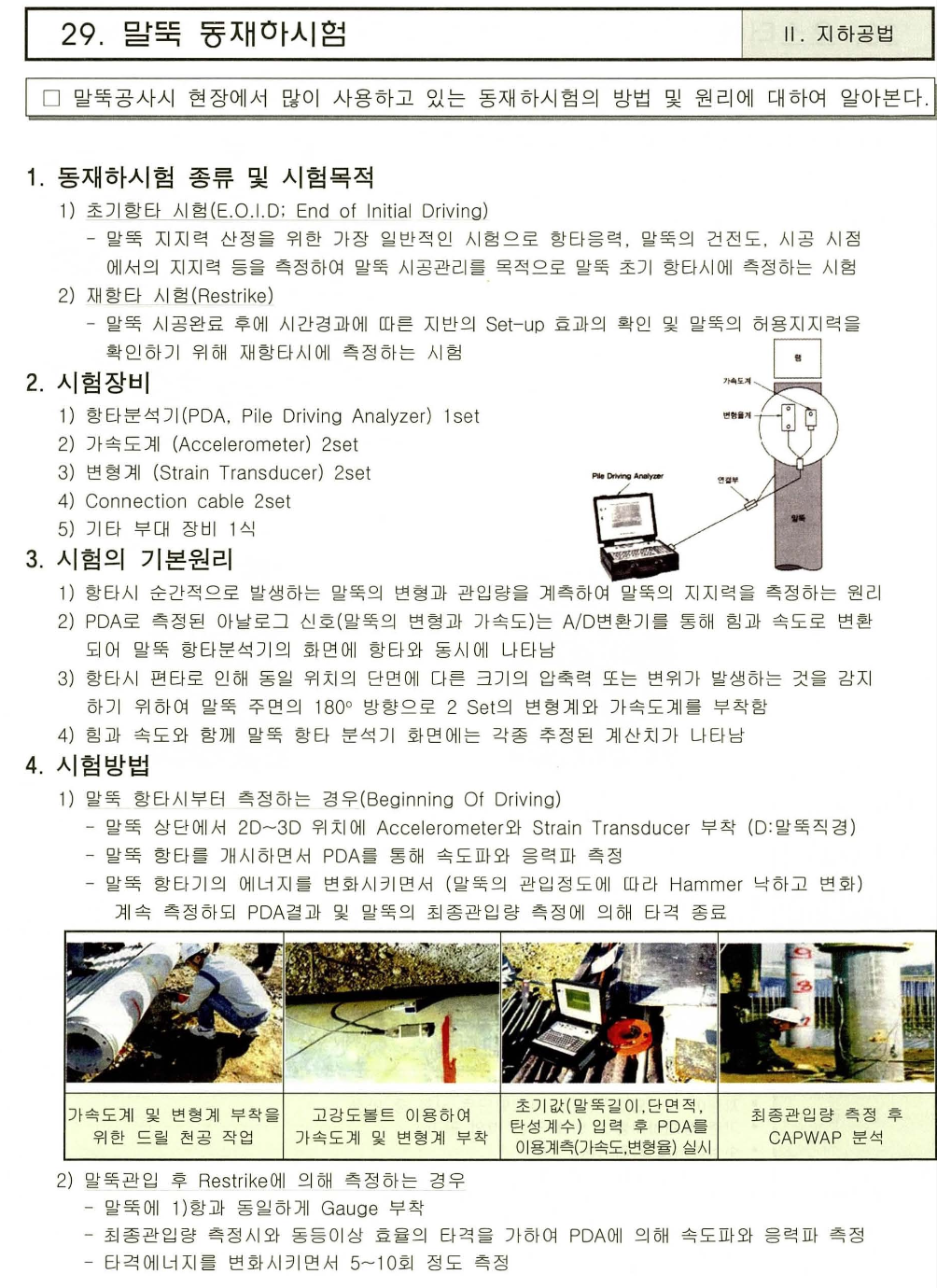 - 목적 : 시공장비의 성능확인, 장비의 적합성 판정, 지반조건 확인, 말뚝의 건전성 판정, 지지력 확인의 목적