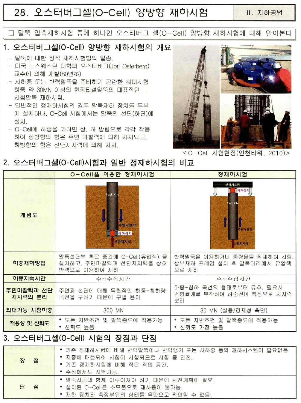 압축재하, 인발재하, 횡방향재하시험 실험방법 : 정재하시험 동재하시험 양방향재하실험(설계지지력이 큰 현장타설말뚝)