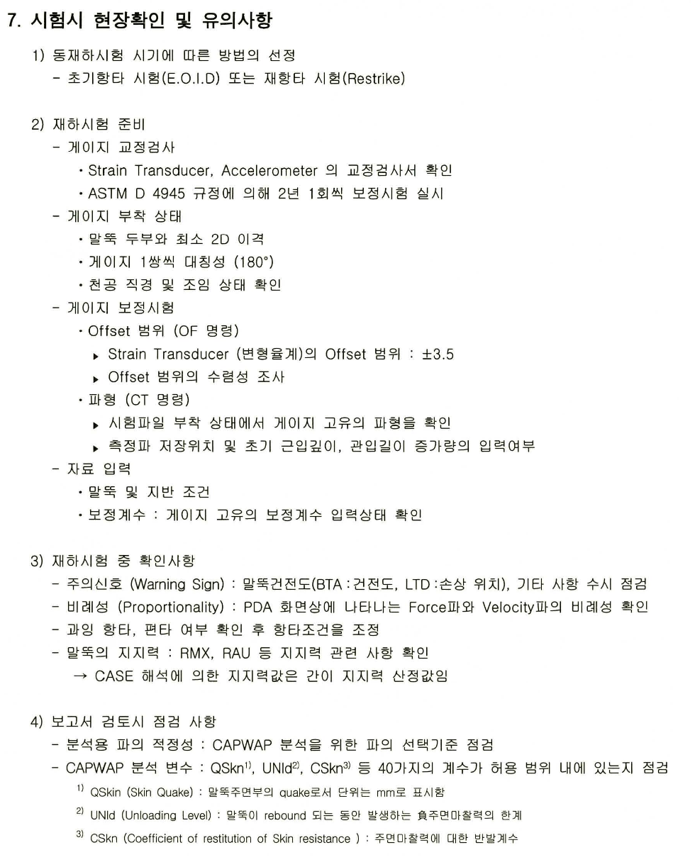 - 수량 : 전체 말뚝 개수의 1%이상 실시 (지반조건에 큰 변화가 없는 경우)