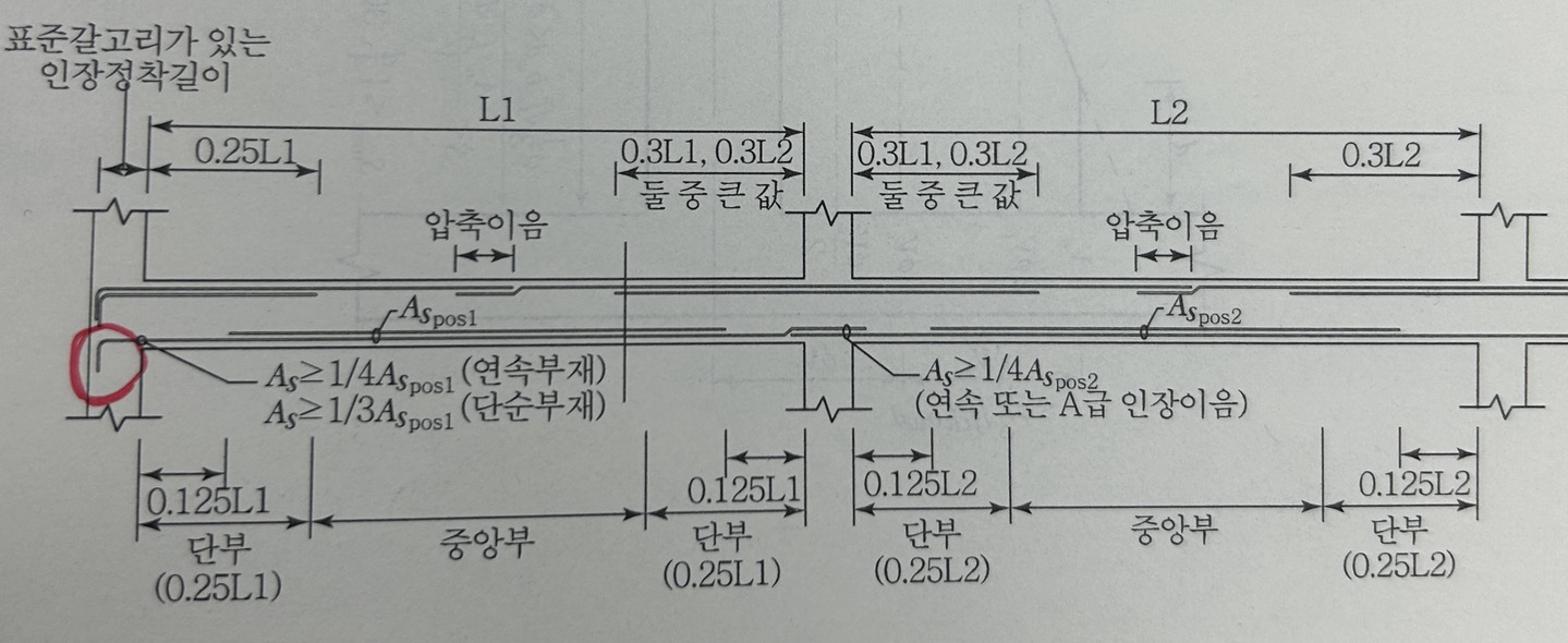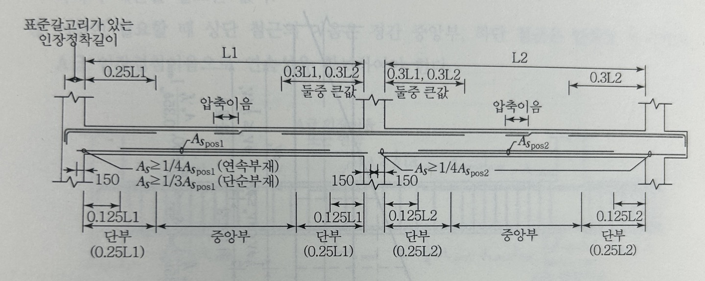 - 연속부 받침부 정철근량은 최대정모멘트 철근량의 1/4