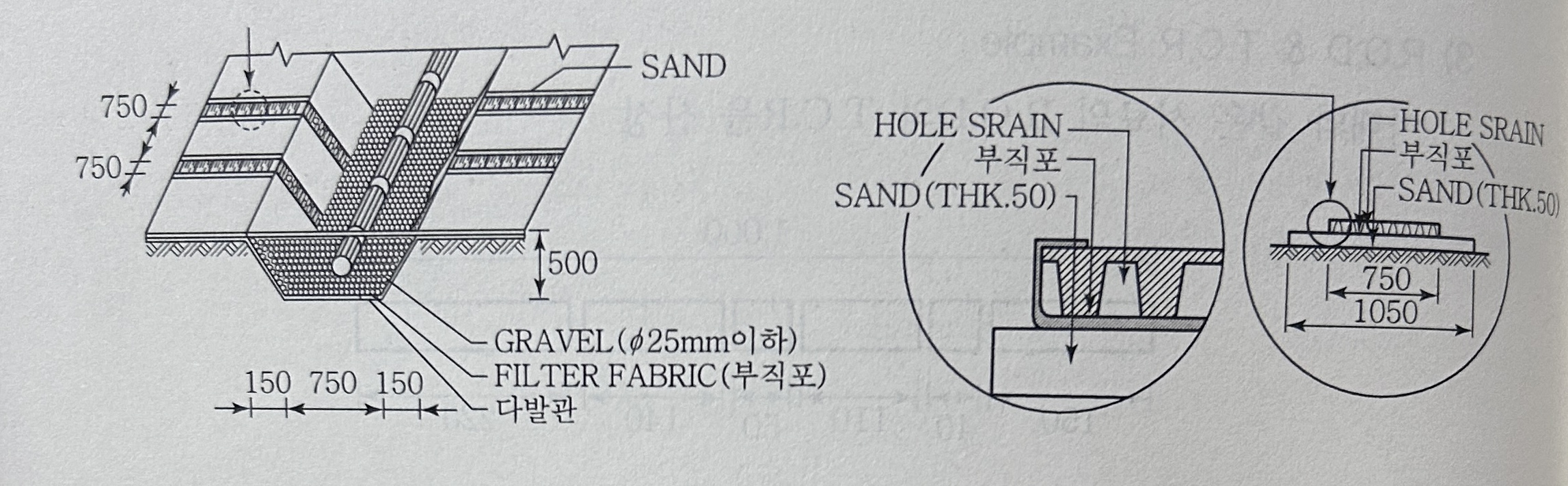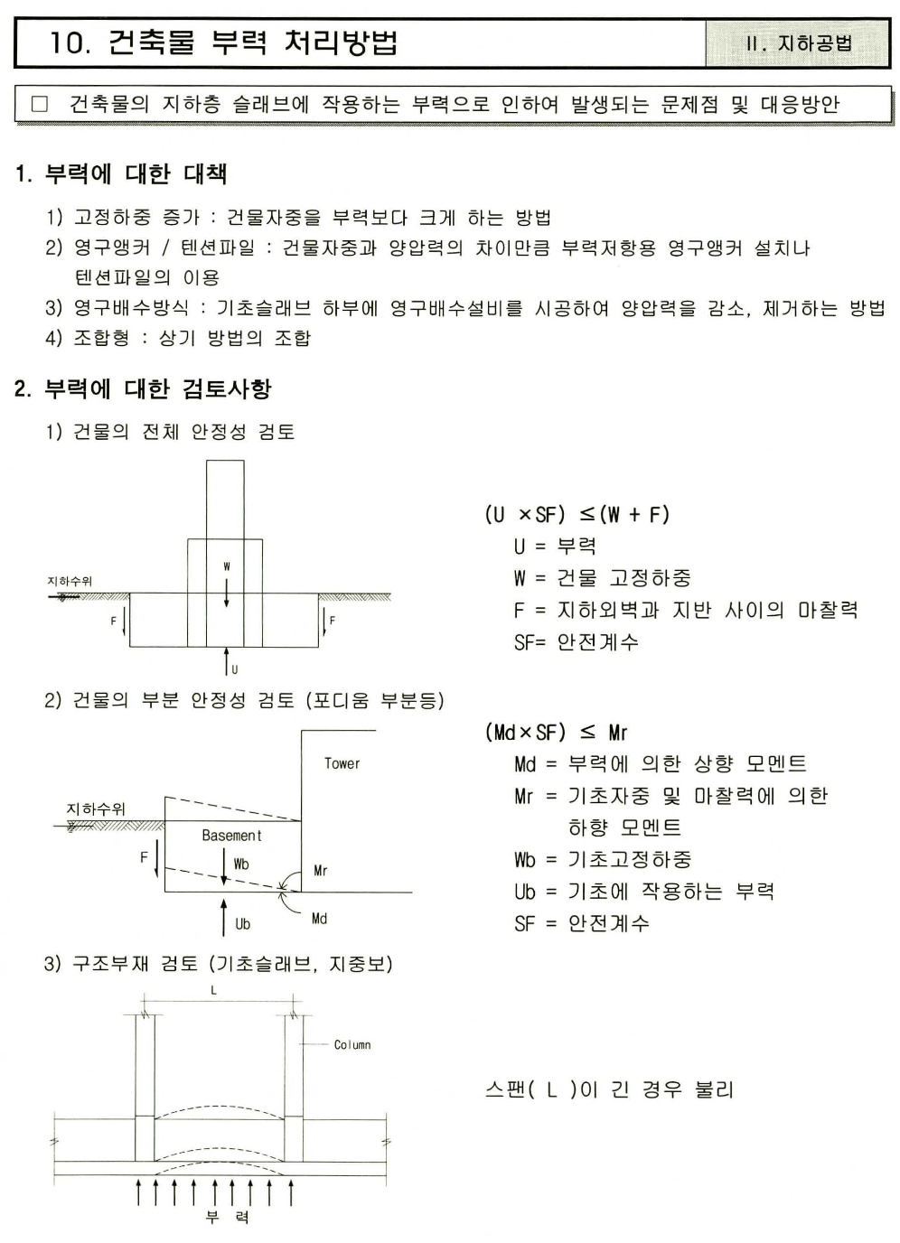 - 배수층이 막힐 경우 지하수에 의한 수압이 기초 및 바닥슬래브에 부휨모멘트력을 발생시키므로, 최소한의 부력을 고려하여 설계하는 것이 바람직하다.