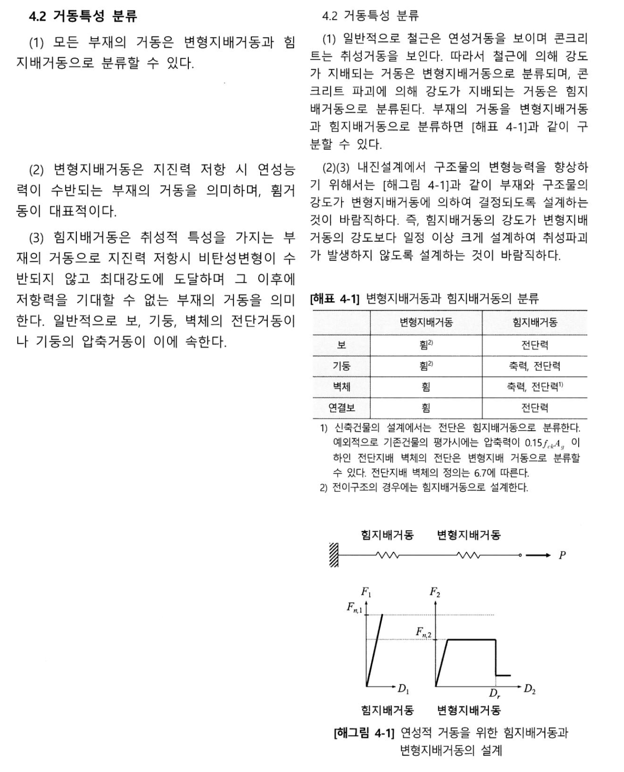- 기둥은 전단보강 상세, 전단력 및 축력비를 고려하여 예상되는 거동에 따라 변형지배와 힘지배로 분류
