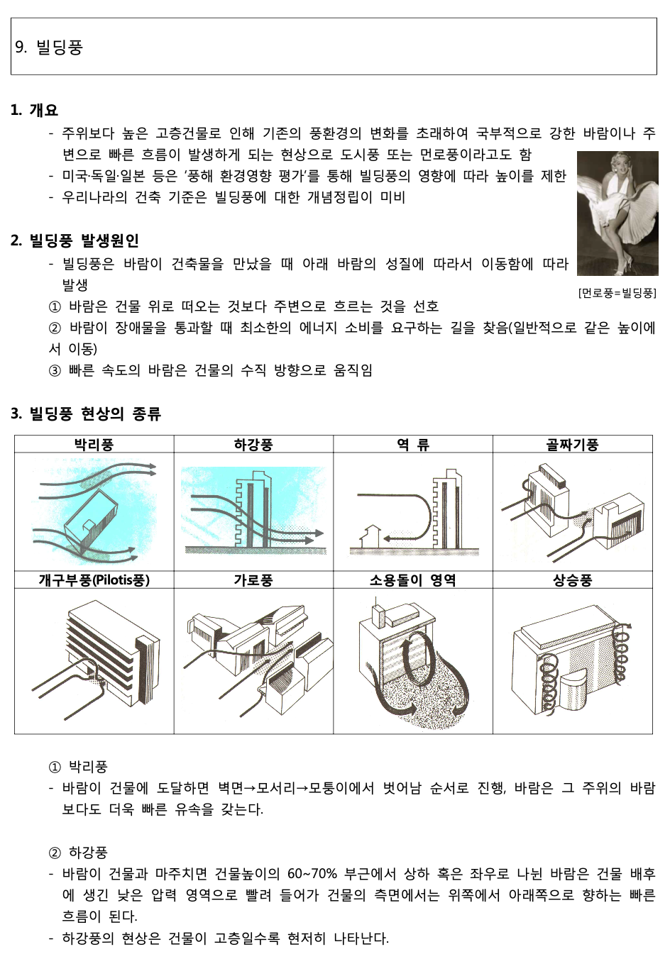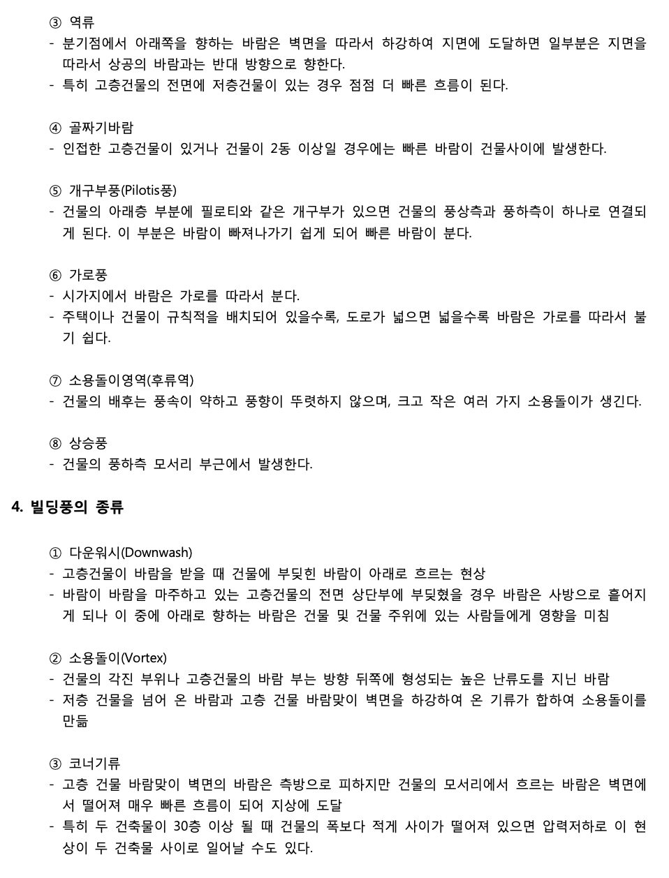 - 하강풍 : 고층부의 바람이 건물과 부딪쳐 지면방향으로 발생하는 바람