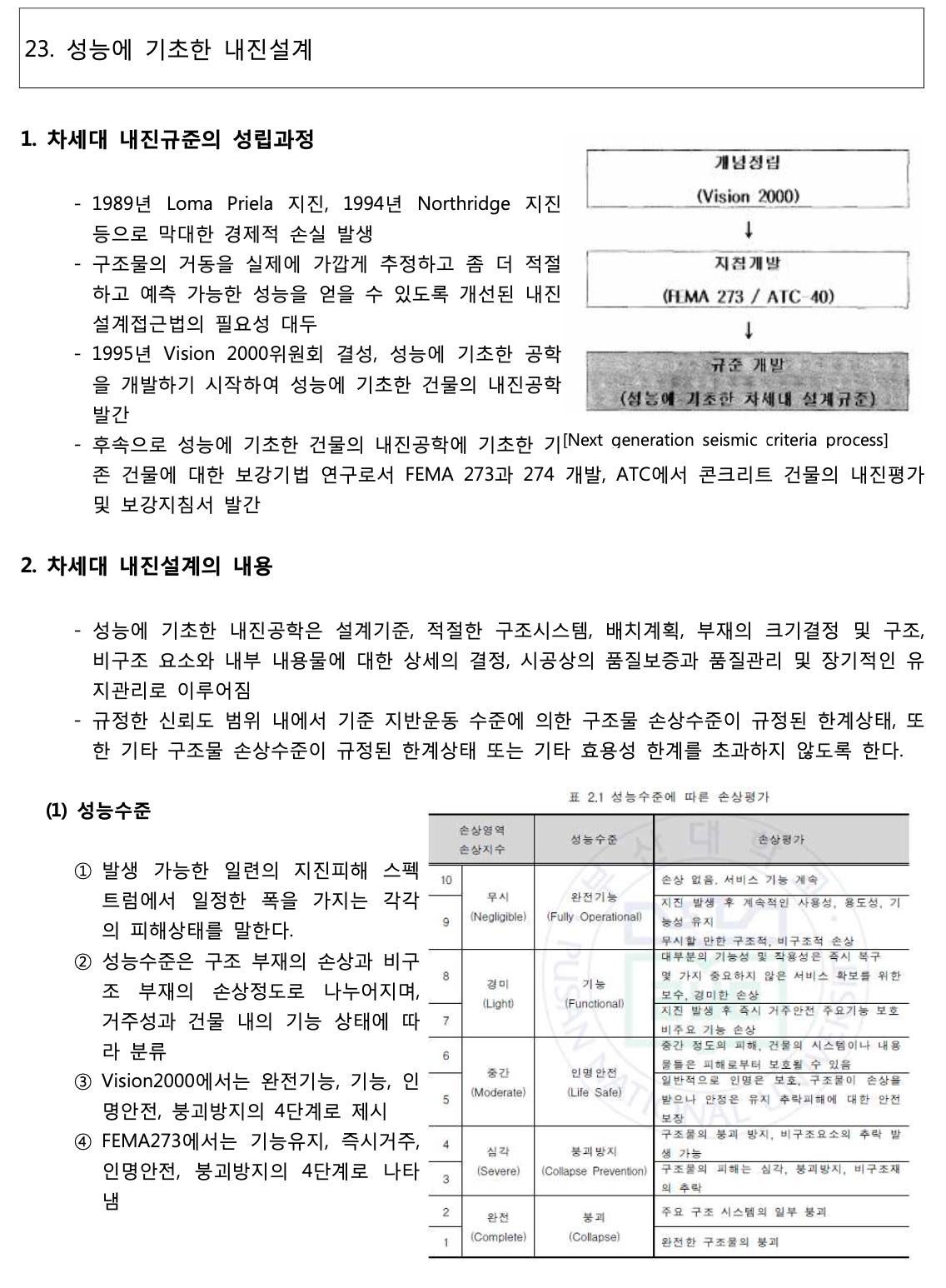 - 목표 성능 설정: 구조물의 사용 목적, 예상되는 하중, 허용 가능한 피해 정도 등을 고려하여 구체적인 성능 목표를 설정합니다.