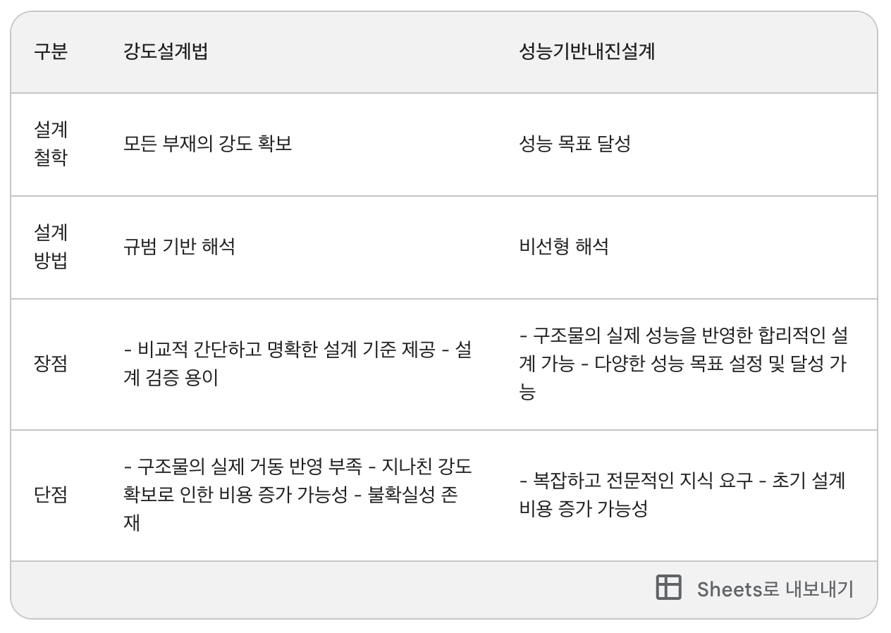 성능설계법은 단순히 강도 기준만으로 설계하는 기존 방식과 달리, 구조물의 안전성과 기능성을 명확하게 정의하고, 이를 달성하기 위한 성능 목표를 설정하여 설계하는 방법입니다. 핵심 특징: