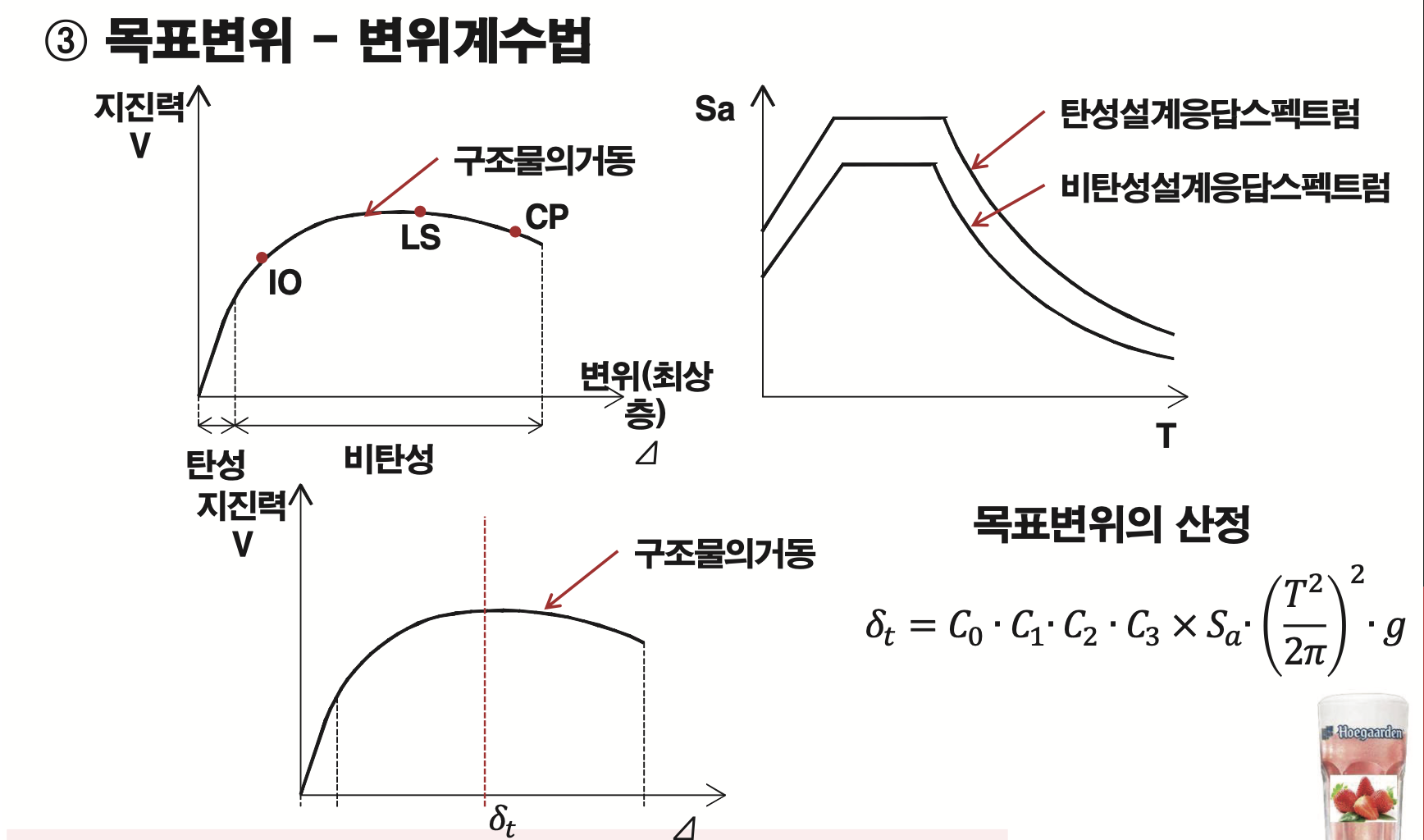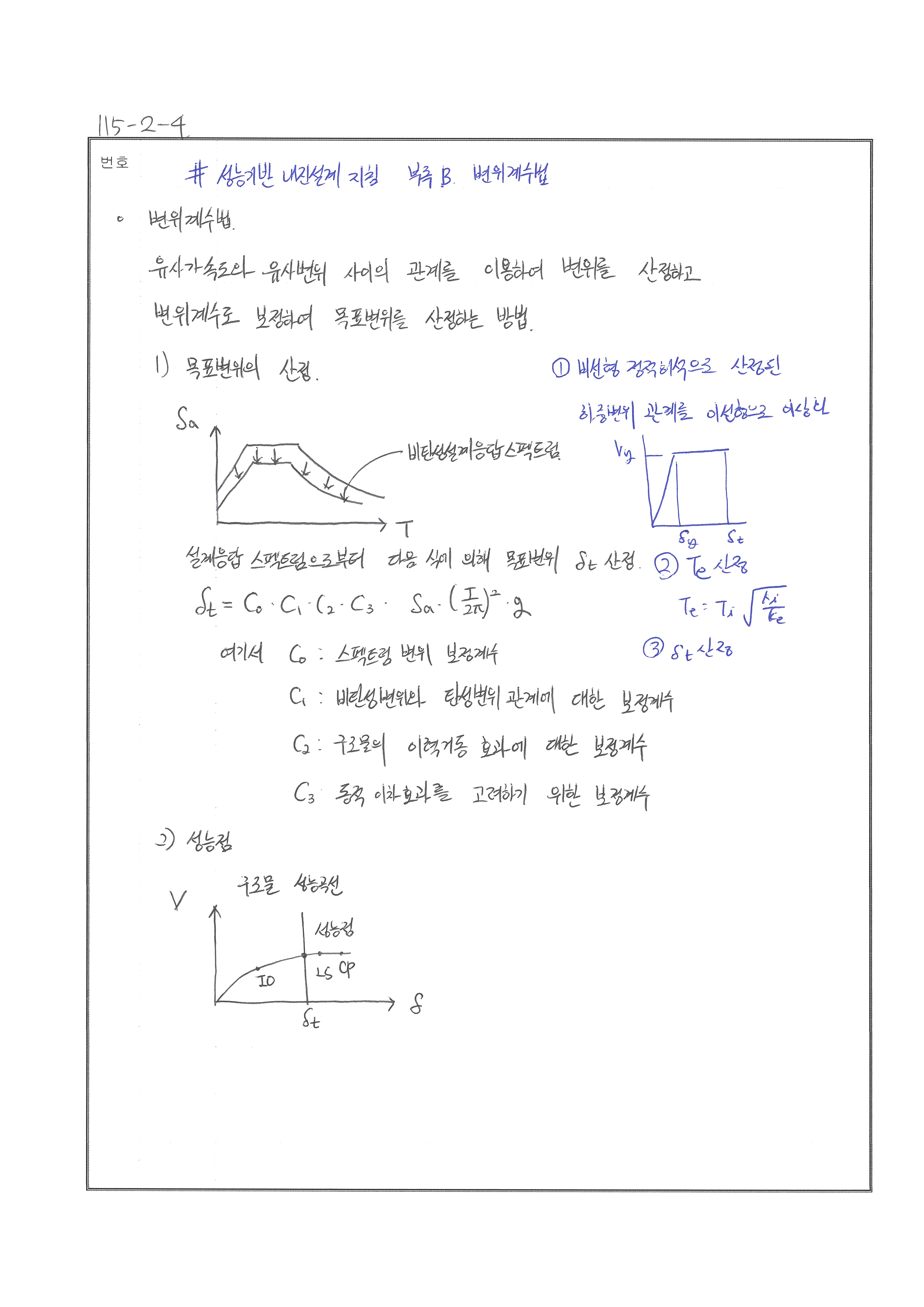 : 스펙트럼 변위 보정계수 : 탄성거동에서 비탄성거동량을 산정하기 위한 계수 : 이력거동에 대한 효과를 고려한 보정계수 : 동적 2차효과 보정계수 : 건축물의 유효주기 : 유효주기에 해당하는 설계응답스펙트럼 응답가속도