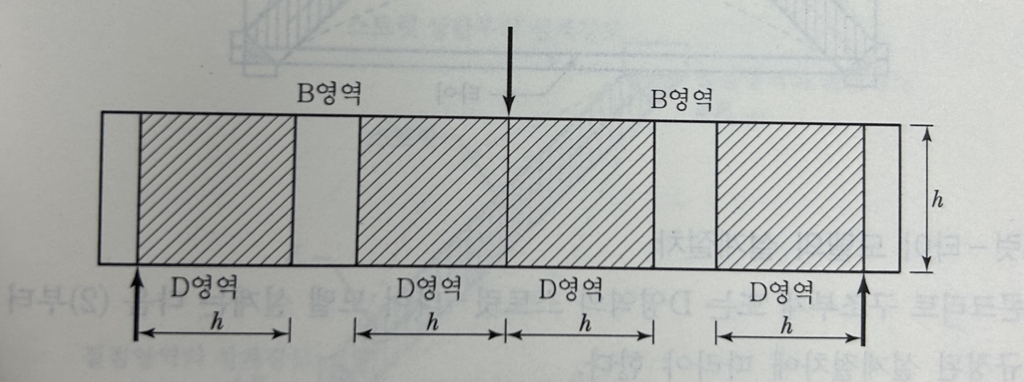 - D 영역 집중하중에 의한 하중 불연속부, 단면이 급변하는 기하학적 불연속부, 그리고 보 이론의 평면유지원리가 적용되지 않는 영역