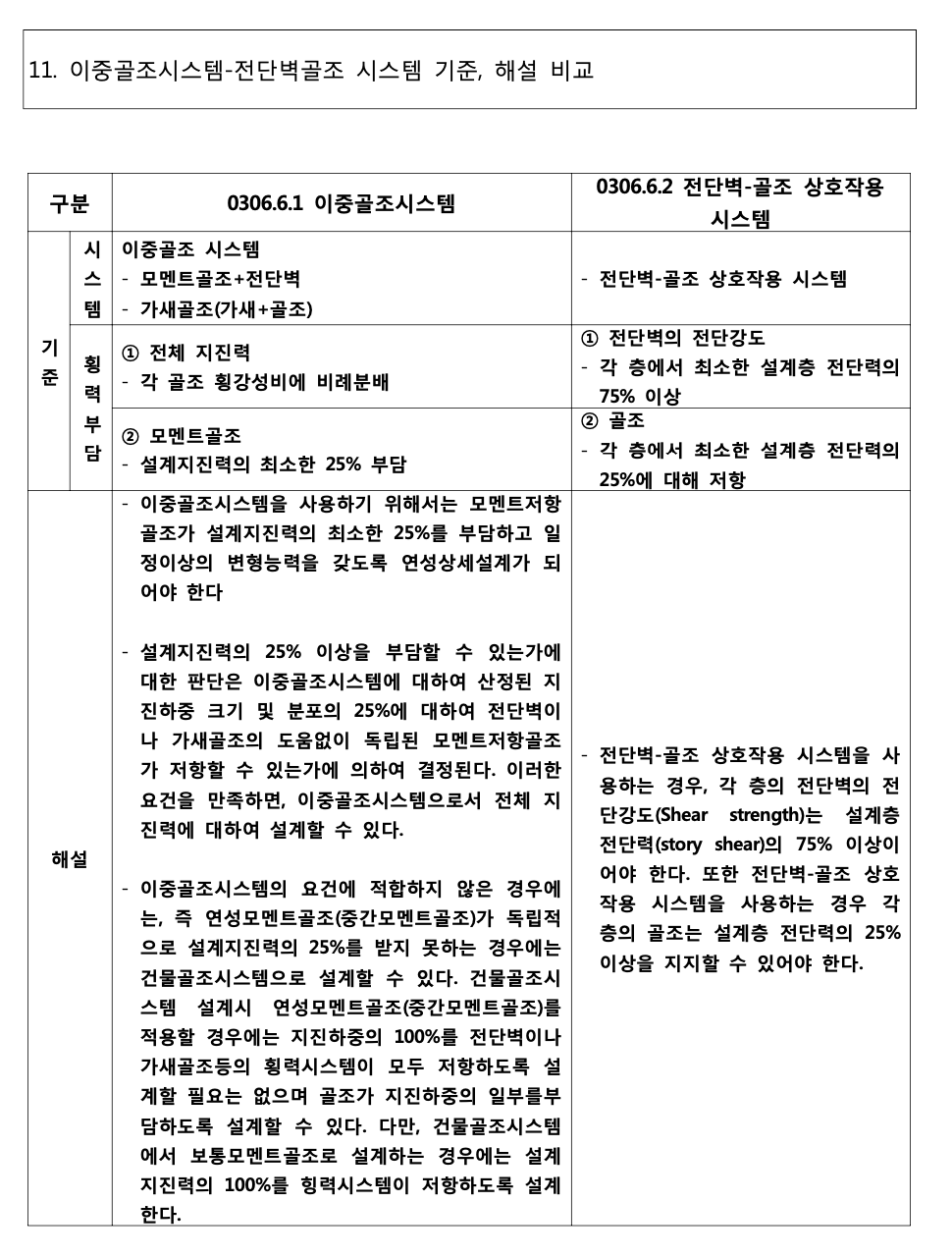 - 다만, 건물골조시스템에서 보통 모멘트 골조로 설계하는 경우는 설계지진력의 100%를 횡력저항시스템이 저항하도록 설계되어야한다.