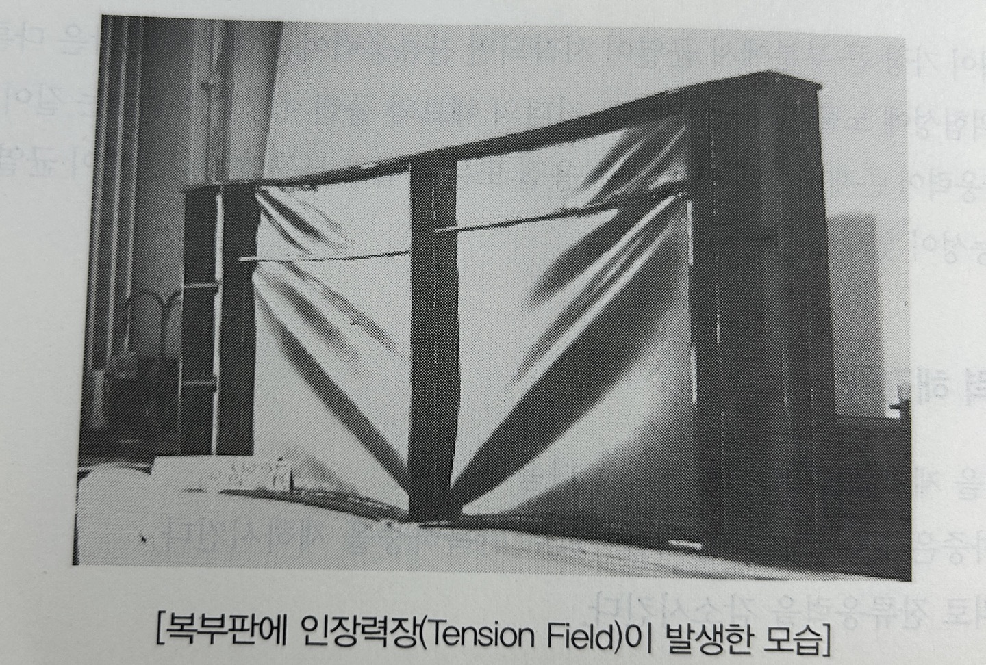 - 판형 거더의 상.하 플랜지와 복부판의 수직보강재로 둘러싸인 Panel 부분에 큰 전단력이 작용하는 경우 발생한다. 즉, 복부판에 전단응력이 크게 발생되어 전단좌굴 후에도 바로 파괴되지 않는데 판형의 상.하 플랜지와 복부판의 수직보강재는 각각 Pratt Truss 의 현재와 수직재로 작용하여 약 45º 방향으로 주름이 생기면서 인장응력이 작용하는 인장력장이 발생되기 때문이다. 인장력장은 Truss의 사재로 작용하며 보 작용의 전단력 이외의 추가적인 전단력에 저항할 수 있다.