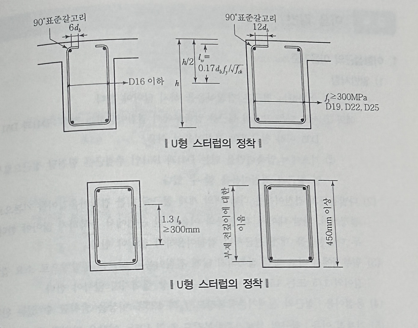 - U자형 Stirrup 은 하단 인장 철근을 감싸는 형태를 이루어야 하고, 이때 stirrup은 인장응력을 받으므로, 충분히 항복강도를 발휘하도록 정착길이가 확보되어야 한다.