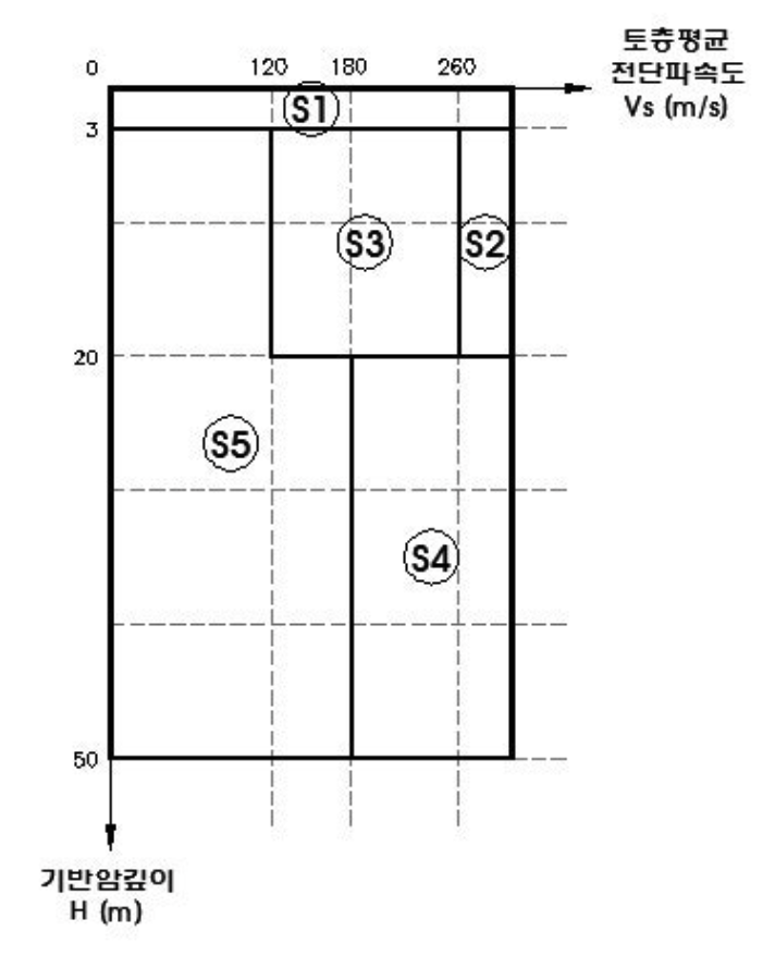 - 기반암깊이에 상관없이 전단파속도가 120m/s 미만이면 S5 적용
