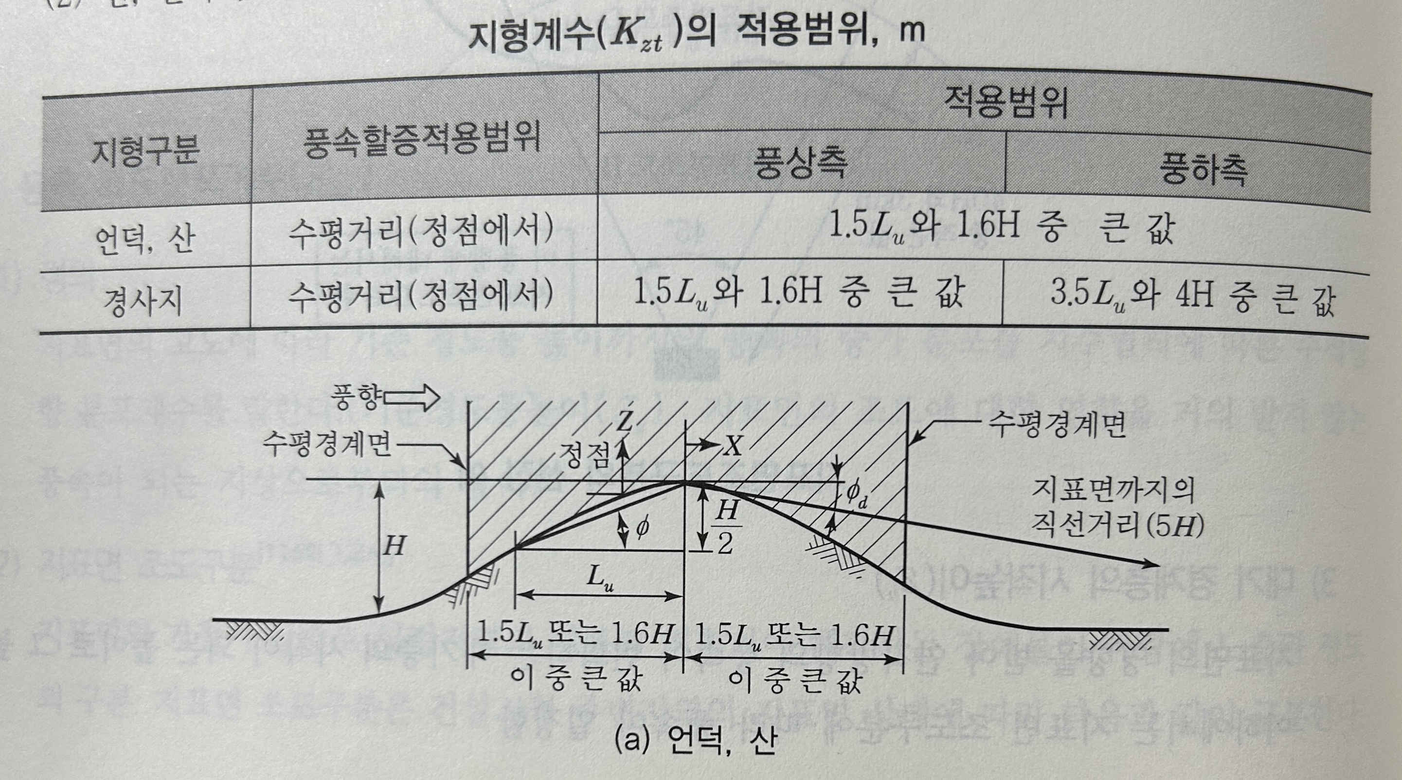 START 서브노트 문제: 지형계수 정답: 지형계수 언덕 및 산 경사지의 정점 부근에서 풍속이 증가하므로 이에 따른 정점 부근의 풍속을 증가시키는 계수 경사, 산 및 언덕의 영향이 없는 지역 → 1.0 산, 언덕 및 경사지 정상 부근의 풍속할증이 필요한 부분 END