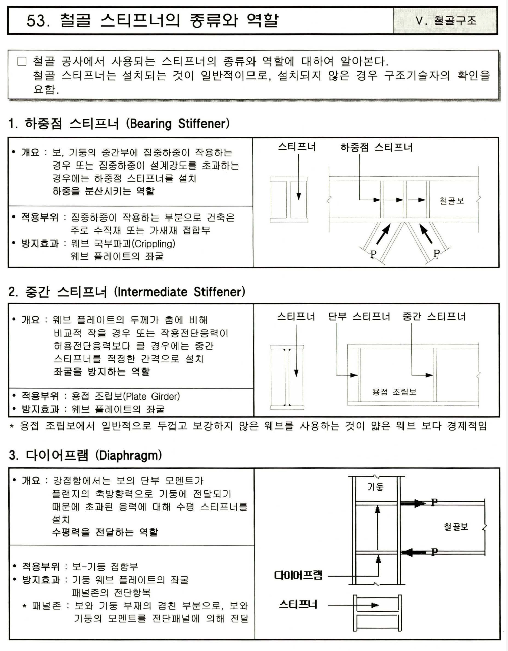 스티프너는 철골 구조물의 플랜지와 웹 사이에 설치되는 보강재입니다. 스티프너는 철골 구조물의 강성, 안정성, 전단 성능을 향상시킨다.