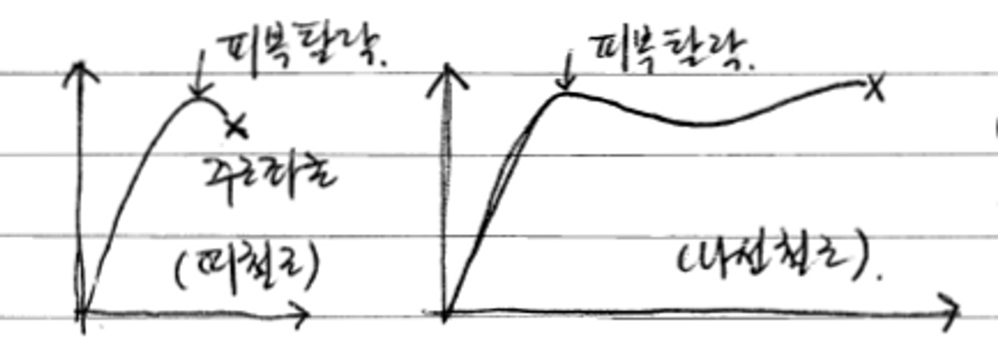 기둥의 파괴과정 → 과하중 → 피복탈락 → 주근좌굴 → 콘크리트 파괴(취성) 이를 막기 위해 띠철근을 촘촘히 감아서 기둥 주근의 좌굴을 방지한다.