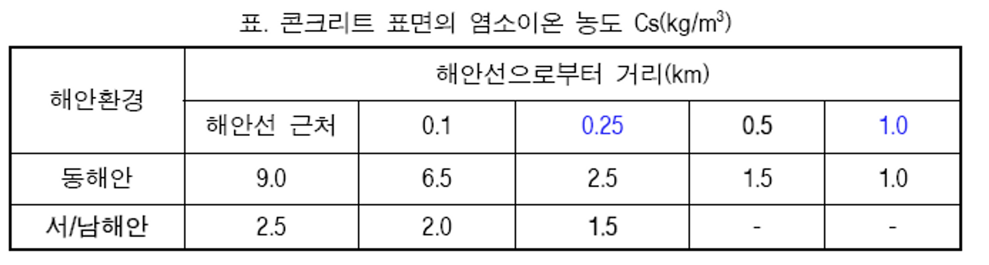 | 염화물상태 | 해안가 근처(공기중 염화물) | 염화물을 함유한물에 계속 노출 | 해수에 침지된 경우 | 건습이 반복되는해수에 노출 |
