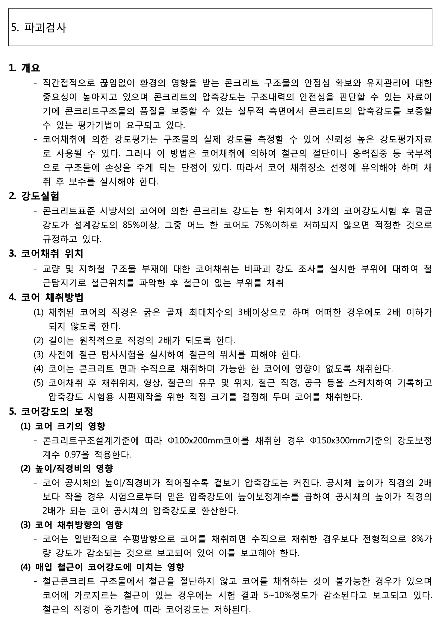 - 코어채취 후 채취위치, 형상, 철근의 유뮤 및 위치, 철근 직경, 공극 등을 스케치하며 기록하고 압축강도 시험용 시편제작을 위한 적정 크기를 결정해 두며 코어를 채취한다.