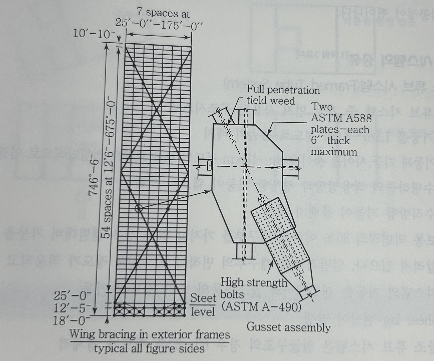 - 브레이스 튜브 시스템은 철골구조의 경우 100층 정도 되는 규모에 경제적인 시스템