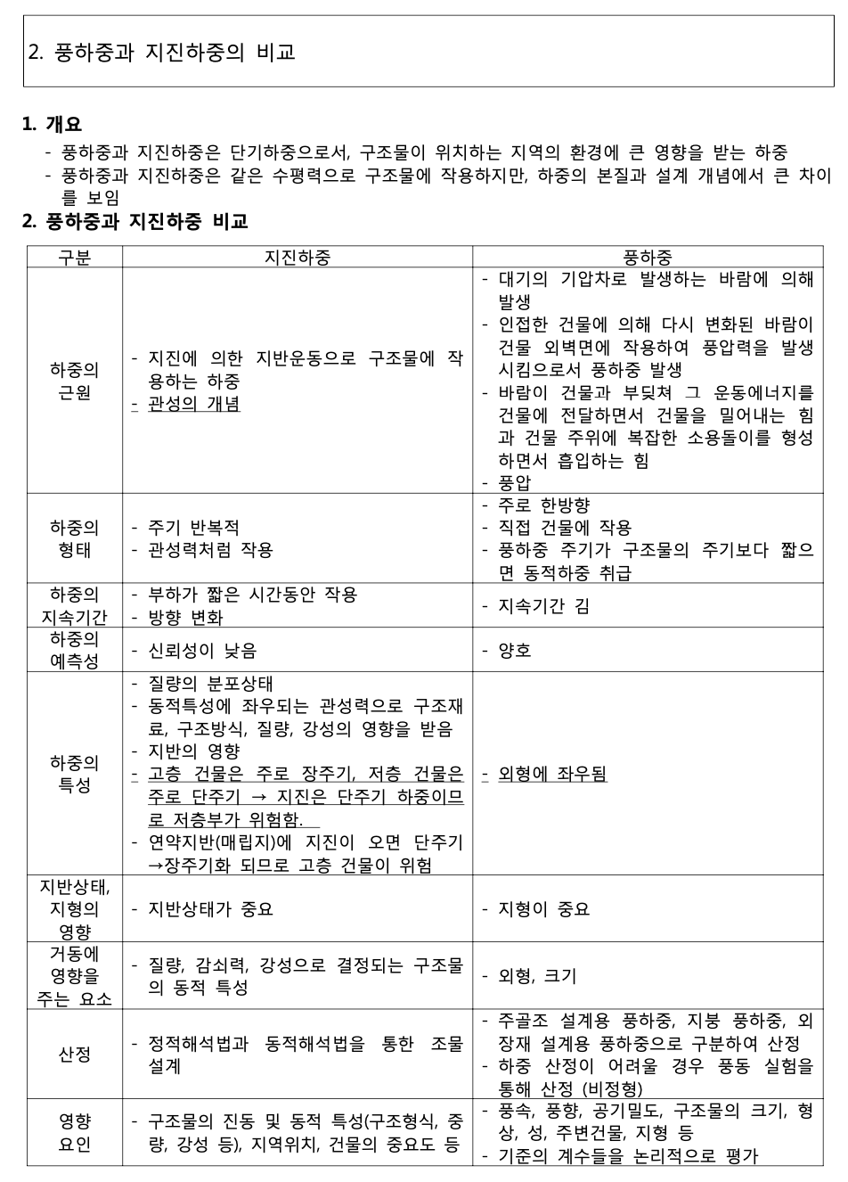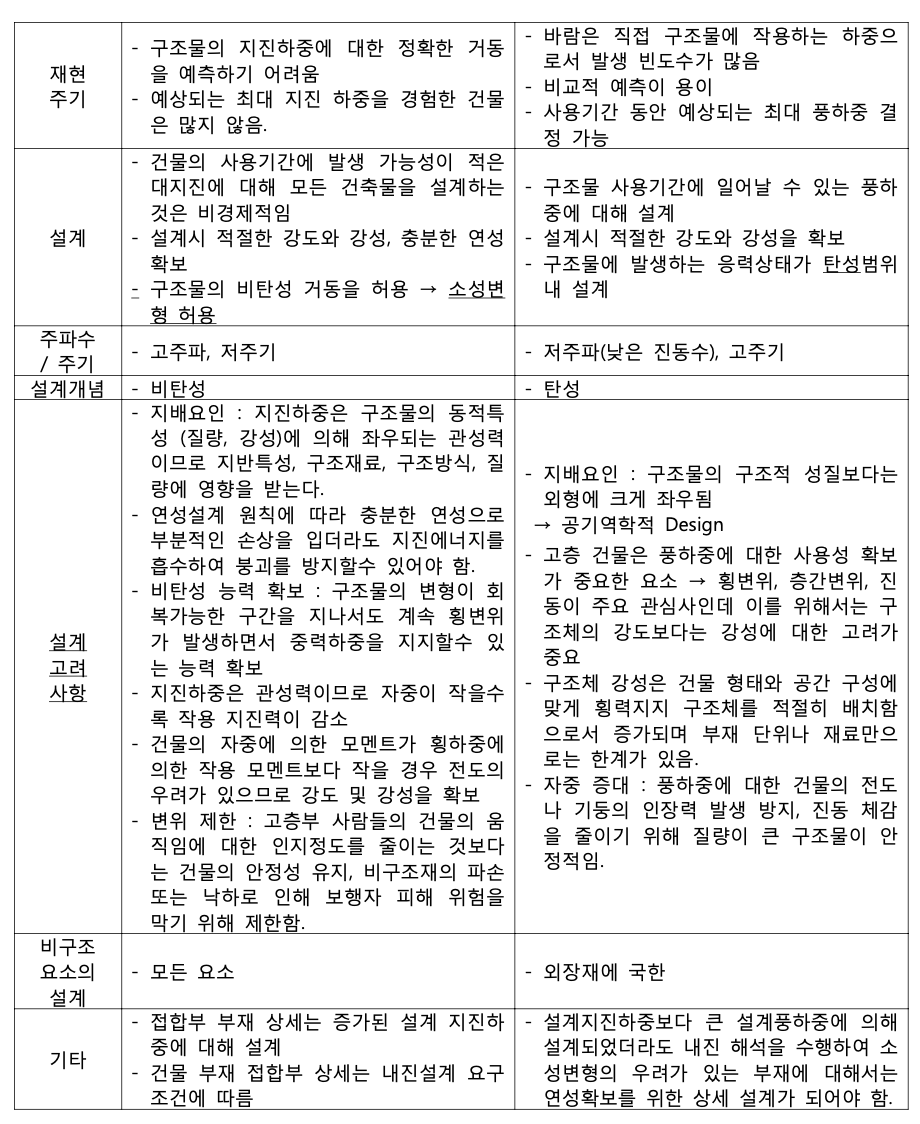 하중의 근원 하중의 형태 하중의 지속기간 하중의 예측성 하중의 특성 지반상태, 지형의 영향 거동에 영향을 주는 요소 하중 산정방법 영향요인 재현주기 설계방법 주파수/주기 설계개념 설계고려사항 비구조요소의 설계 기타