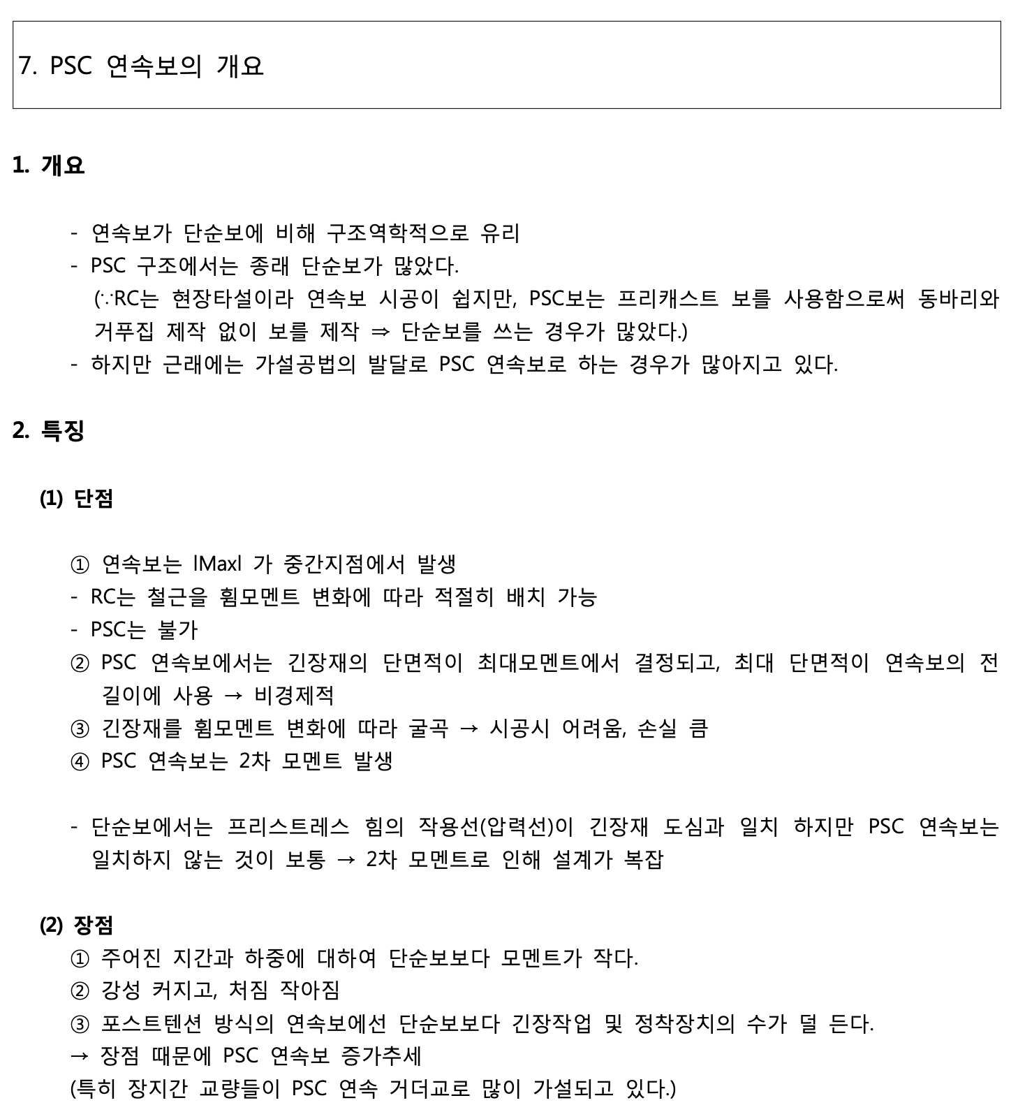 - PSC 연속보는 2차 모멘트가 발생한다. 단순보에서는 프리스트레스 힘의 작용선이 긴장재 도심과 일치하지만 PSC 연속보는 일치하지 않는다. → 2차모멘트로 설계가 복잡