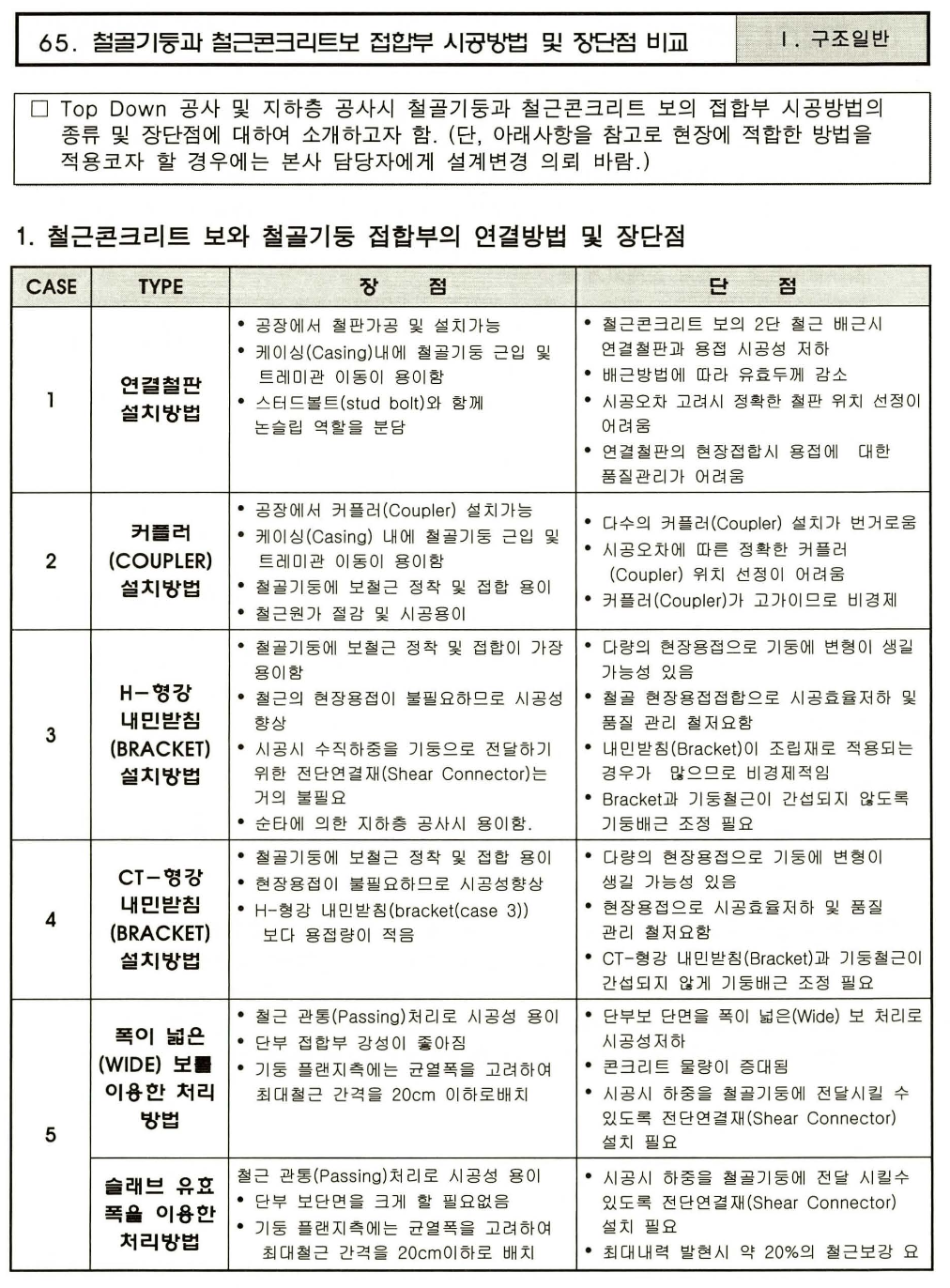 보철근 정착 및 접합이 가장 용이함 철근의 현장용접이 불필요하므로 시공성 향상 전단연결재가 거의 불필요 순타에 의한 지하층 공사시 용이함 다량의 현장용접으로 기둥에 변형이 생길 수22 있다. 철골 현장용접접합으로 시공효율저하 및 품질관리 요함. 브라켓과 기둥철근이 간섭되지 않도록 기둥배근 조정필요 (H형강에서 용접량을 줄이기 위해 CT형강 사용)