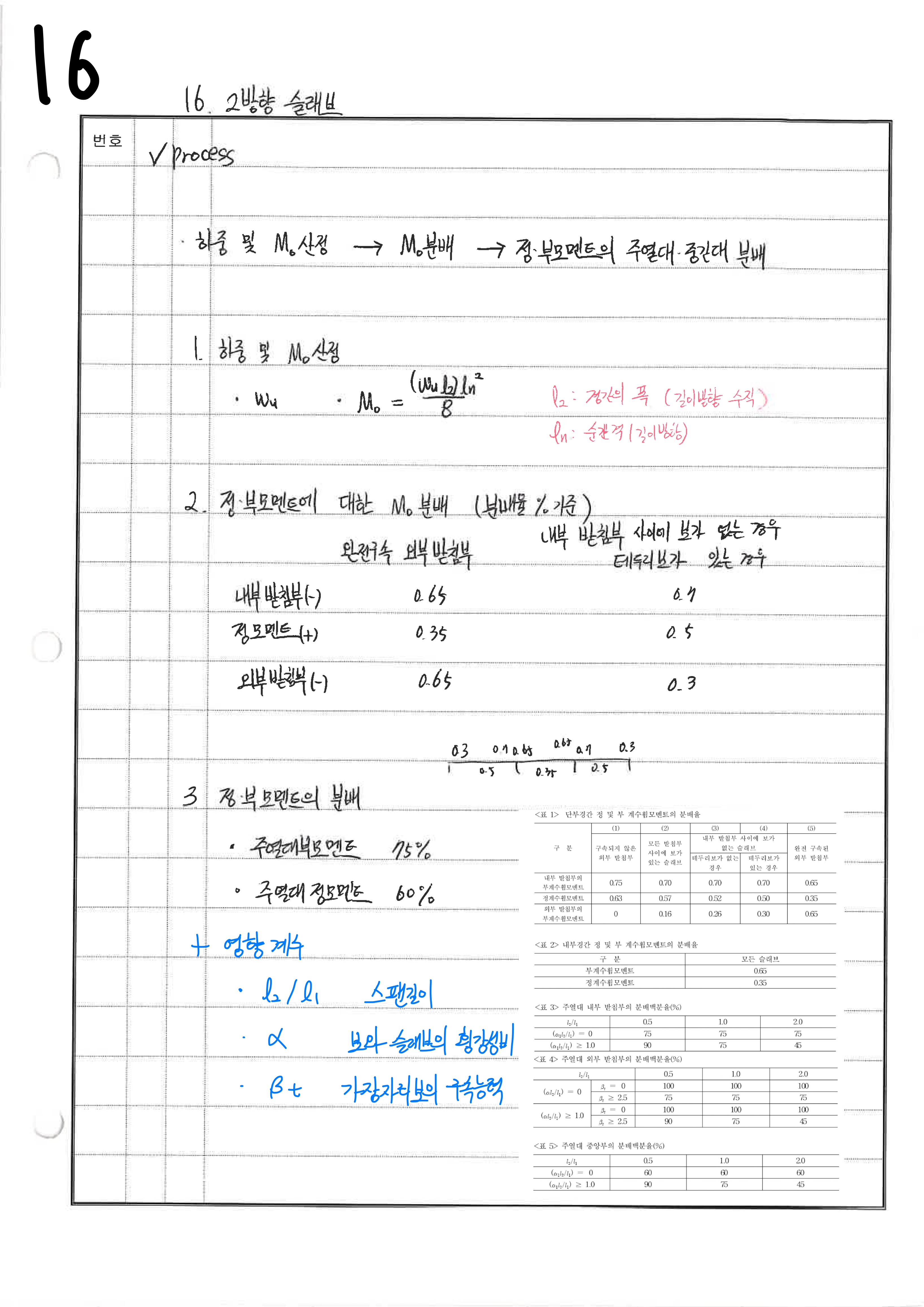- 테두리보 없는 경우 정,부모멘트 분배시 단부 0.26 0.52 0.7