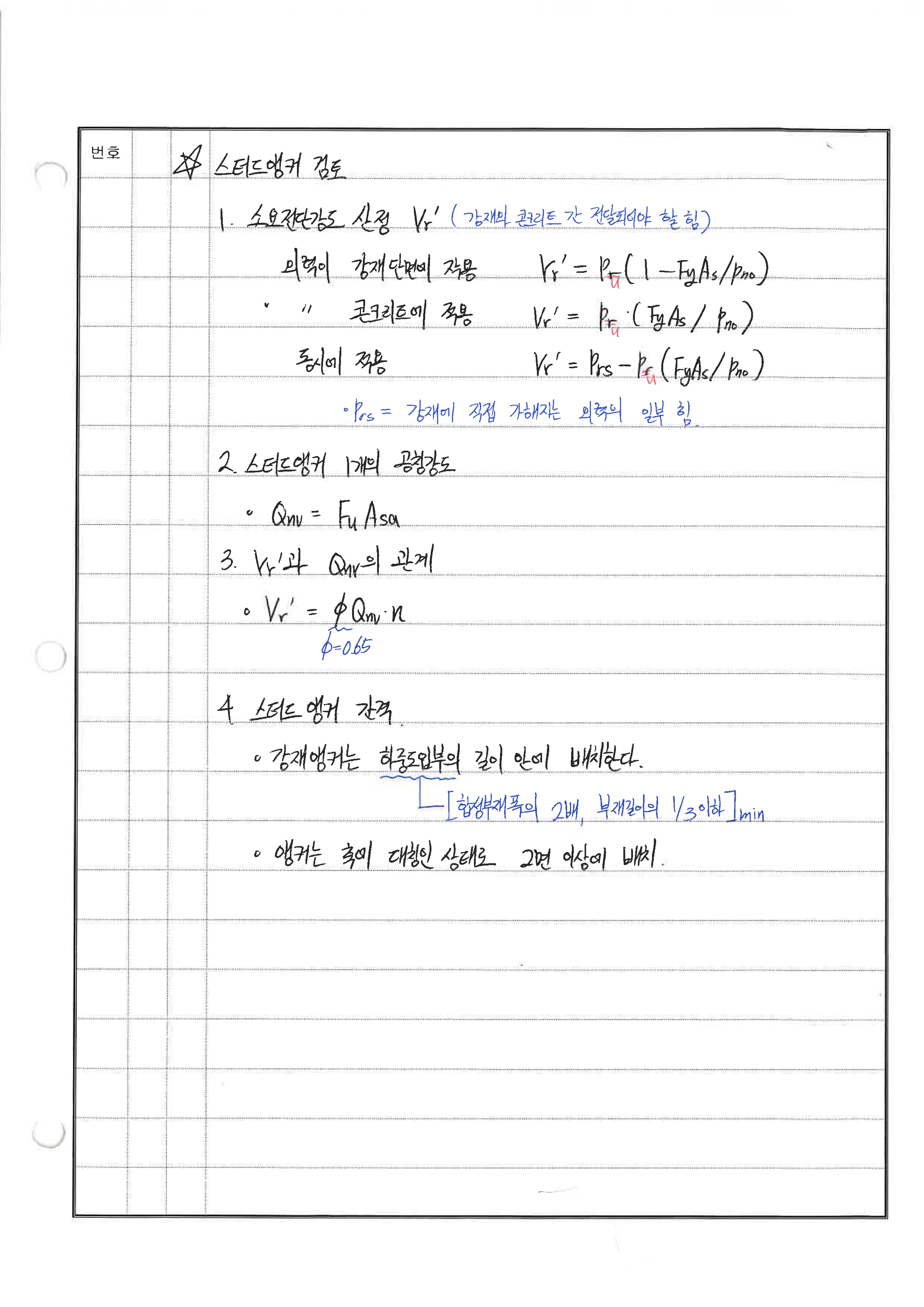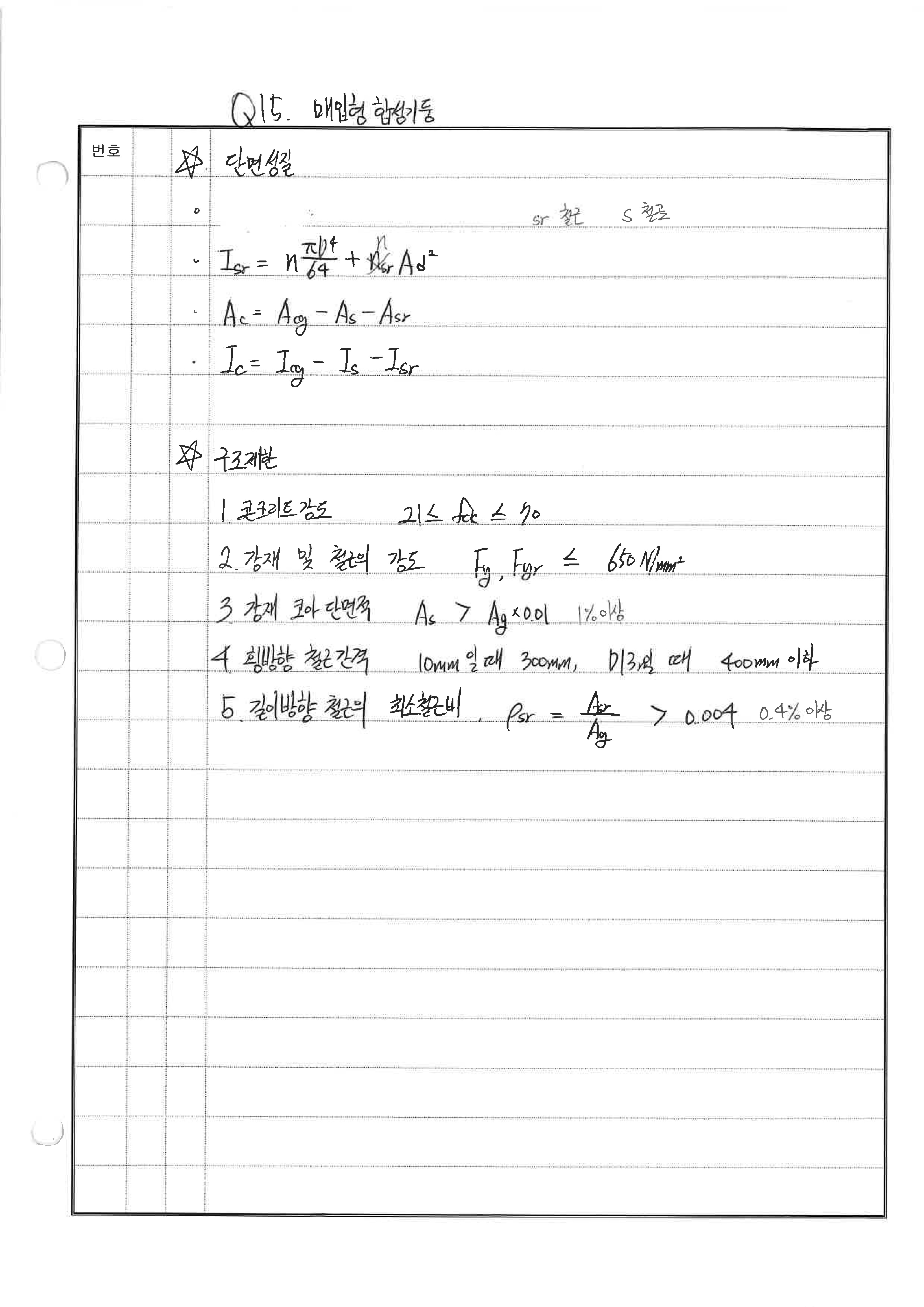 관련문제 table without id file.link as "문제번호", 설명, tags, 중요, 반복도, 풀이 from "(21) 문제모음" Where contains(관련노트,[[S15. 매입형 합성기둥]]) sort 반복도 desc START 서브노트 문제: S15. 매입형 합성기둥 검토 단면성질 구조제한 설계강도 산정 스터드앵커 검토 정답: 매입형합성기둥 관련기준 스터드앵커 최소 간격 : 4d 최대 간격 : 32d END