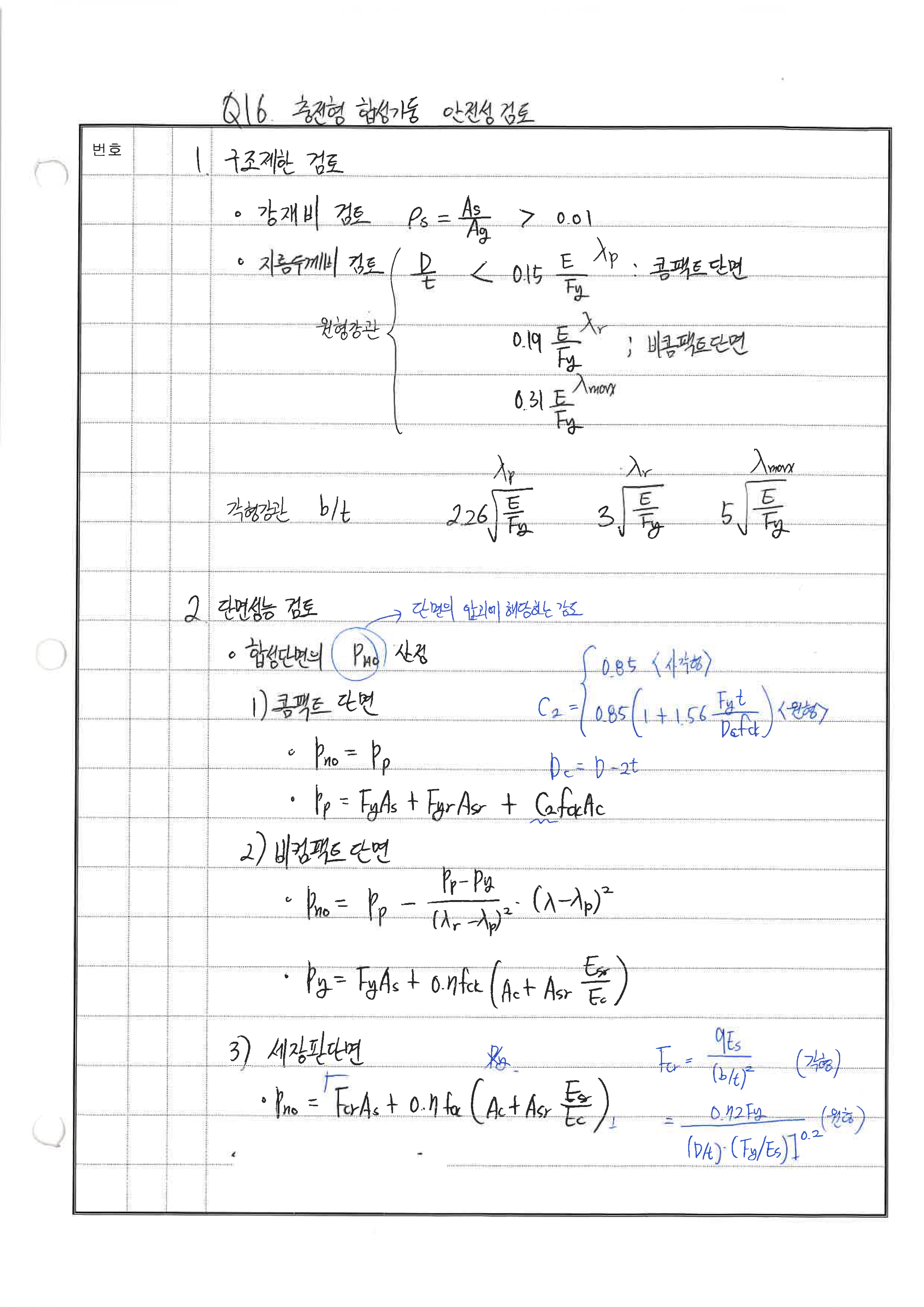 관련문제 table without id file.link as "문제번호", 설명, tags, 중요, 반복도, 풀이 from "(11) 문제모음" Where contains(관련노트,[[S16. 충전형 합성기둥]]) sort 반복도 desc START 서브노트 문제: S16. 충전형 합성기둥 안전성 검토 구조제한 검토 단면성능 검토 정답: END