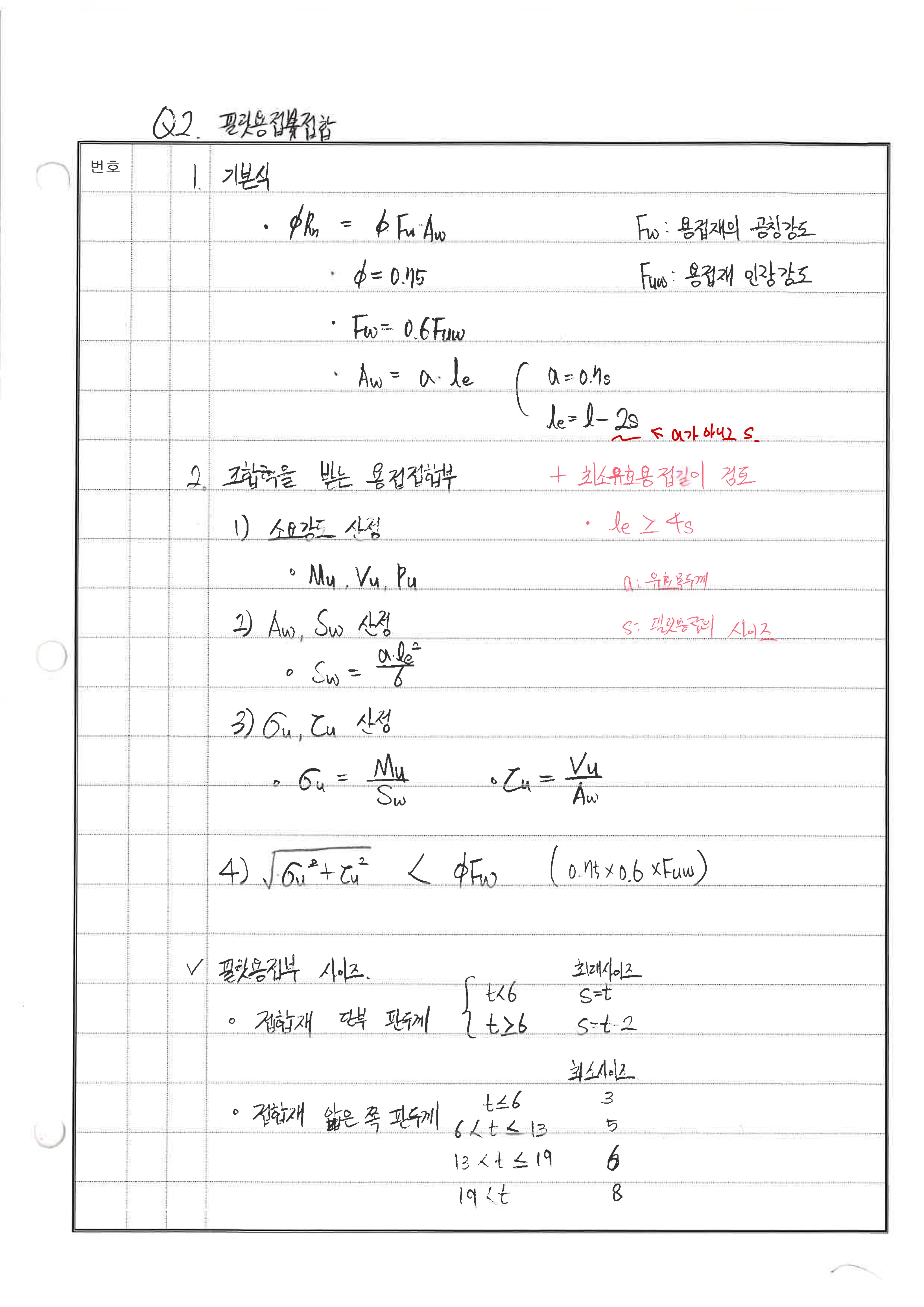 관련문제 table without id file.link as "문제번호", 설명, tags, 중요, 반복도, 풀이 from "(21) 문제모음" Where contains(관련노트,[[S2. 필릿용접 접합]]) sort 반복도 desc START 서브노트 문제: S2. 필릿용접 접합 정답: END 문제유형 볼트와 조합 : 편심하중 : 편심이 발생하지 않는 길이 : 107-4-4