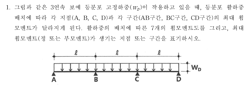 중요::4 풀이::XX 반복도::7 설명::3연속 보에 활하중의 배치에 따른 휨모멘트도 도시 및 최대휨모멘트 산정