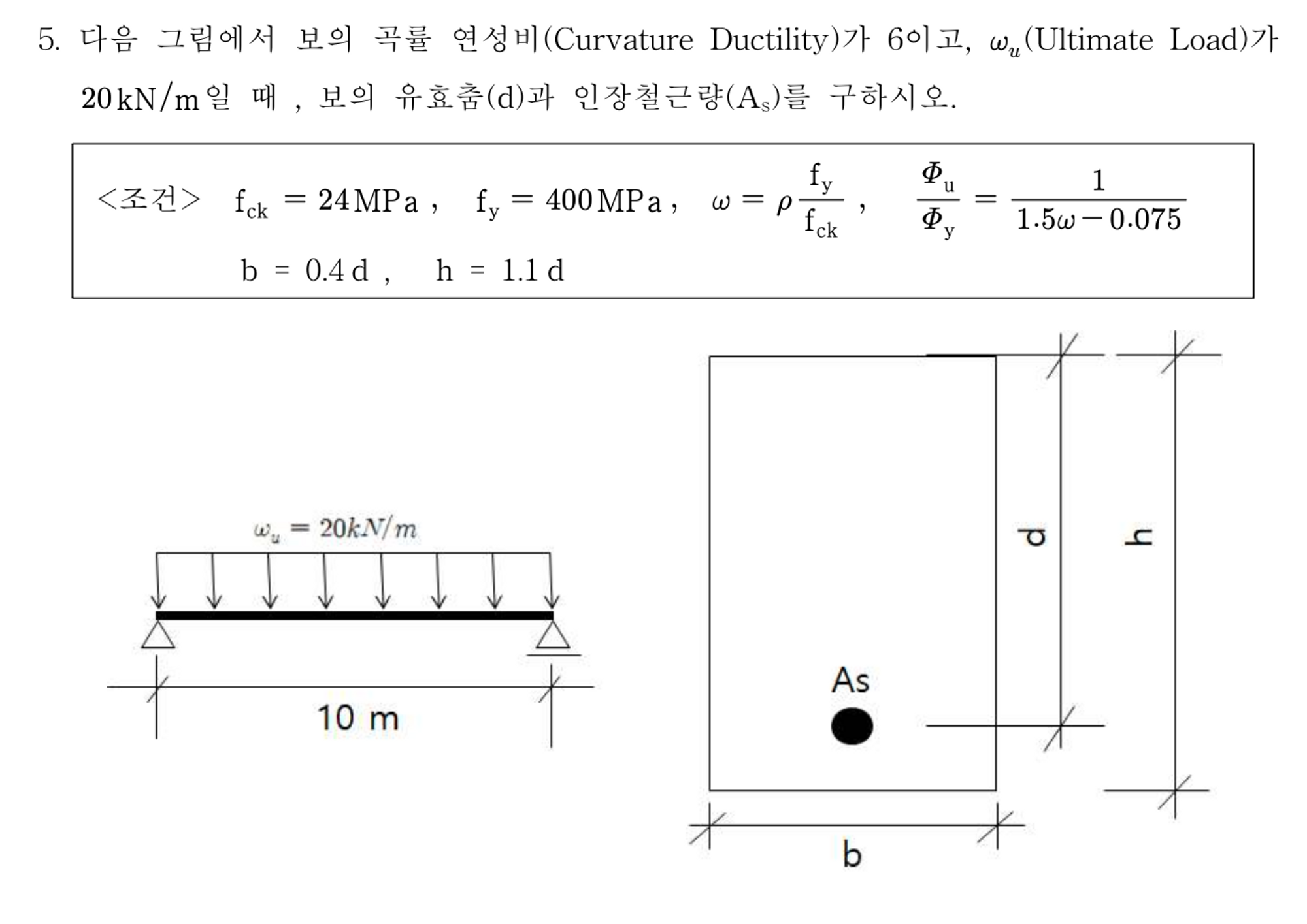 곡률연성비가 주어질 때, 보의 유효춤과 인장철근량 산정