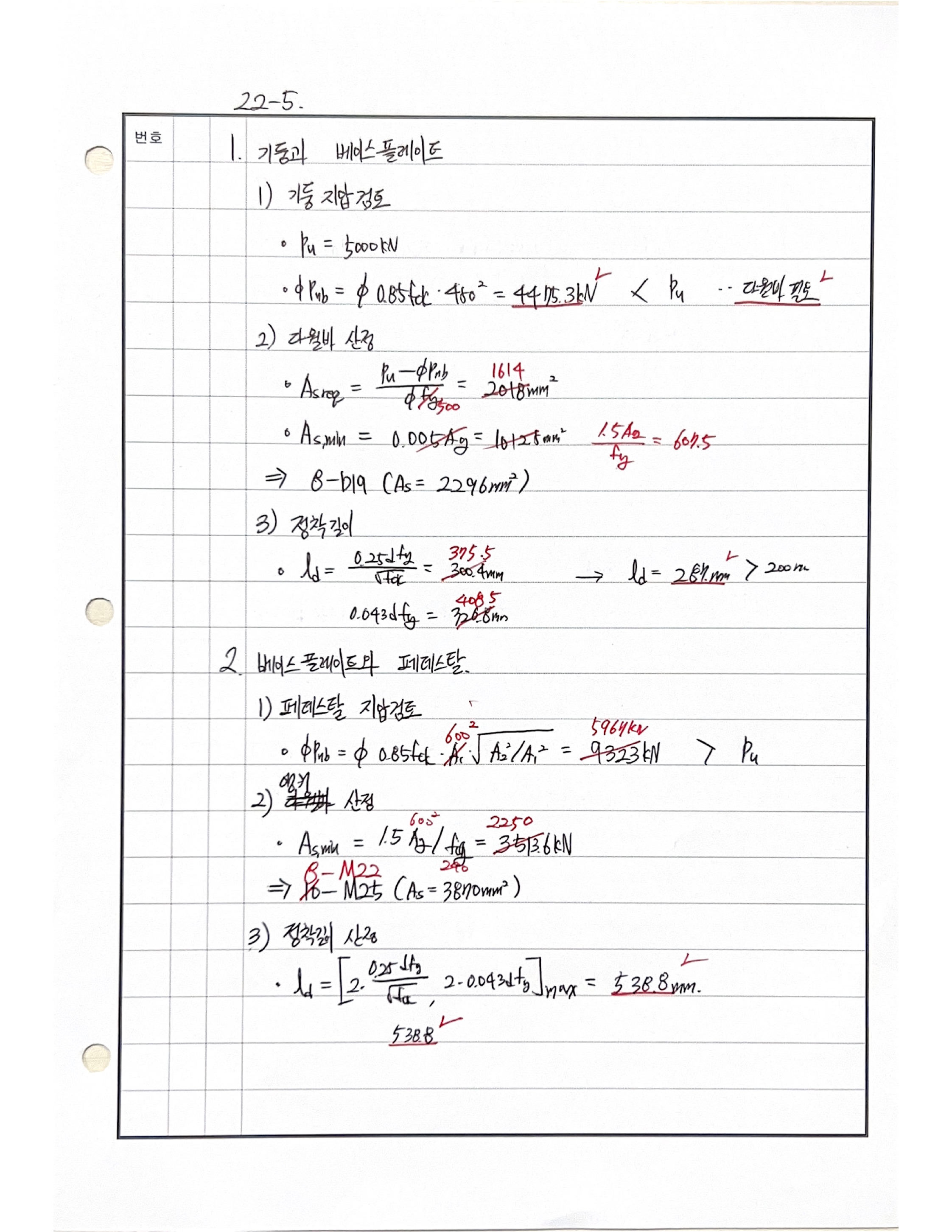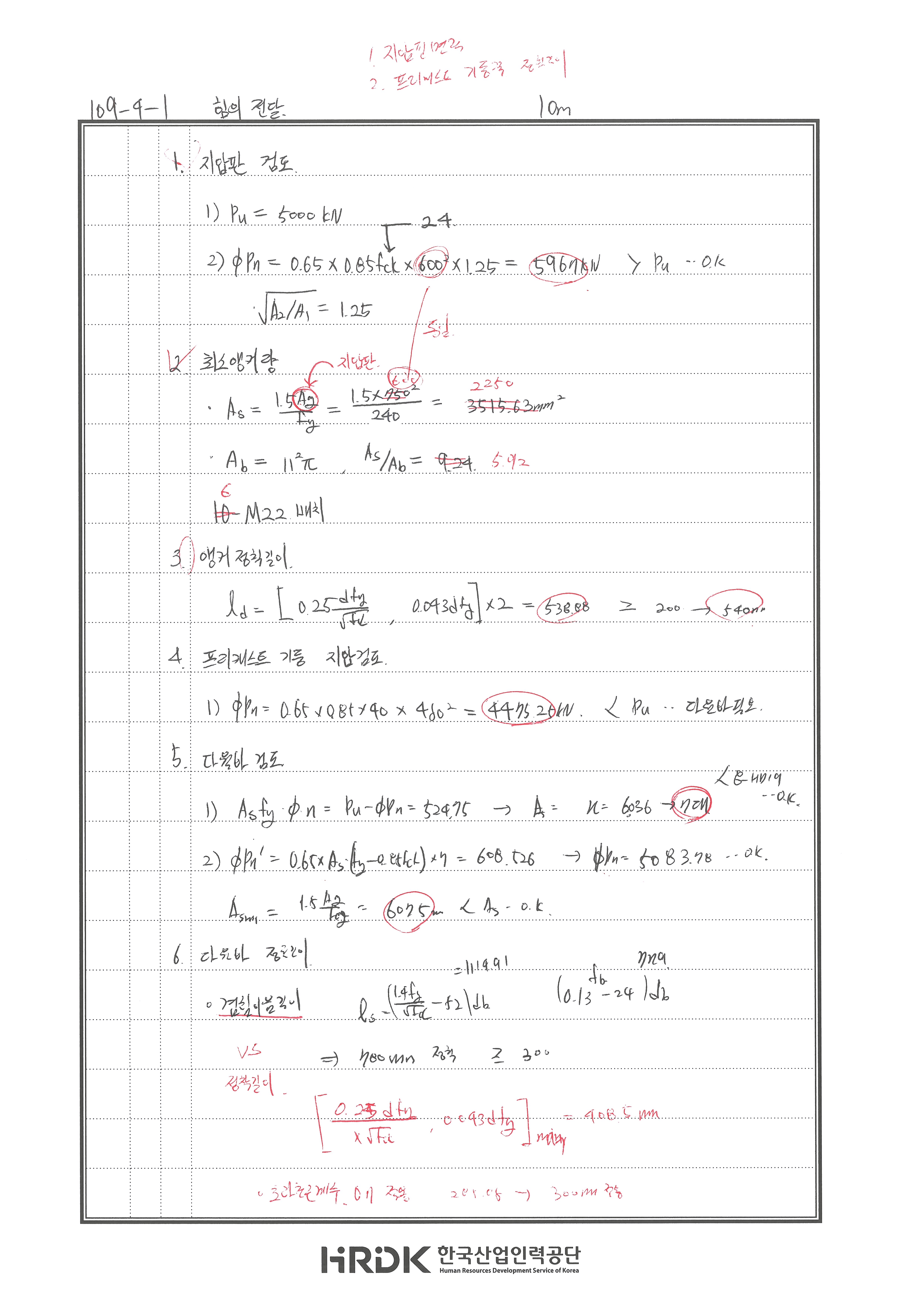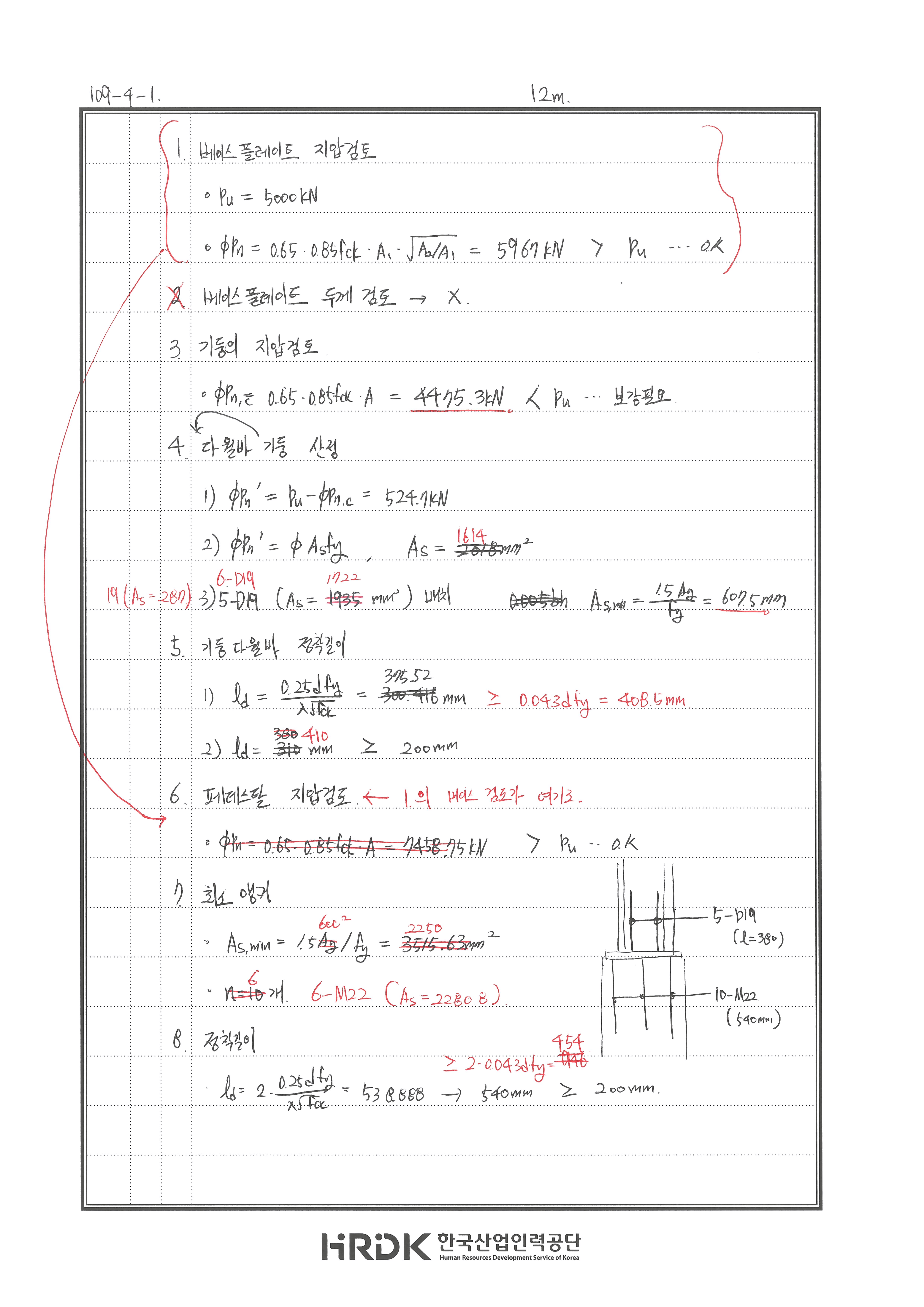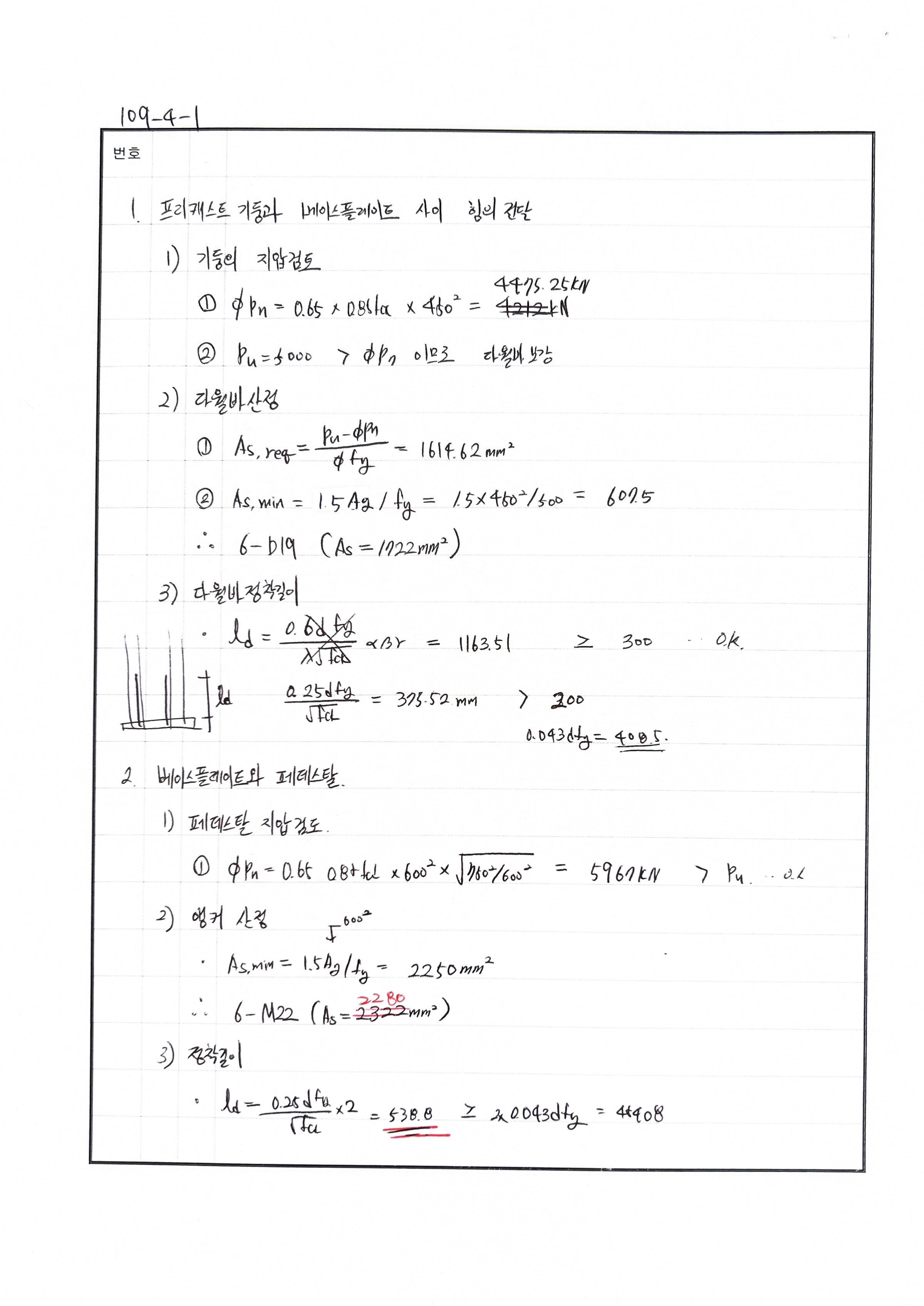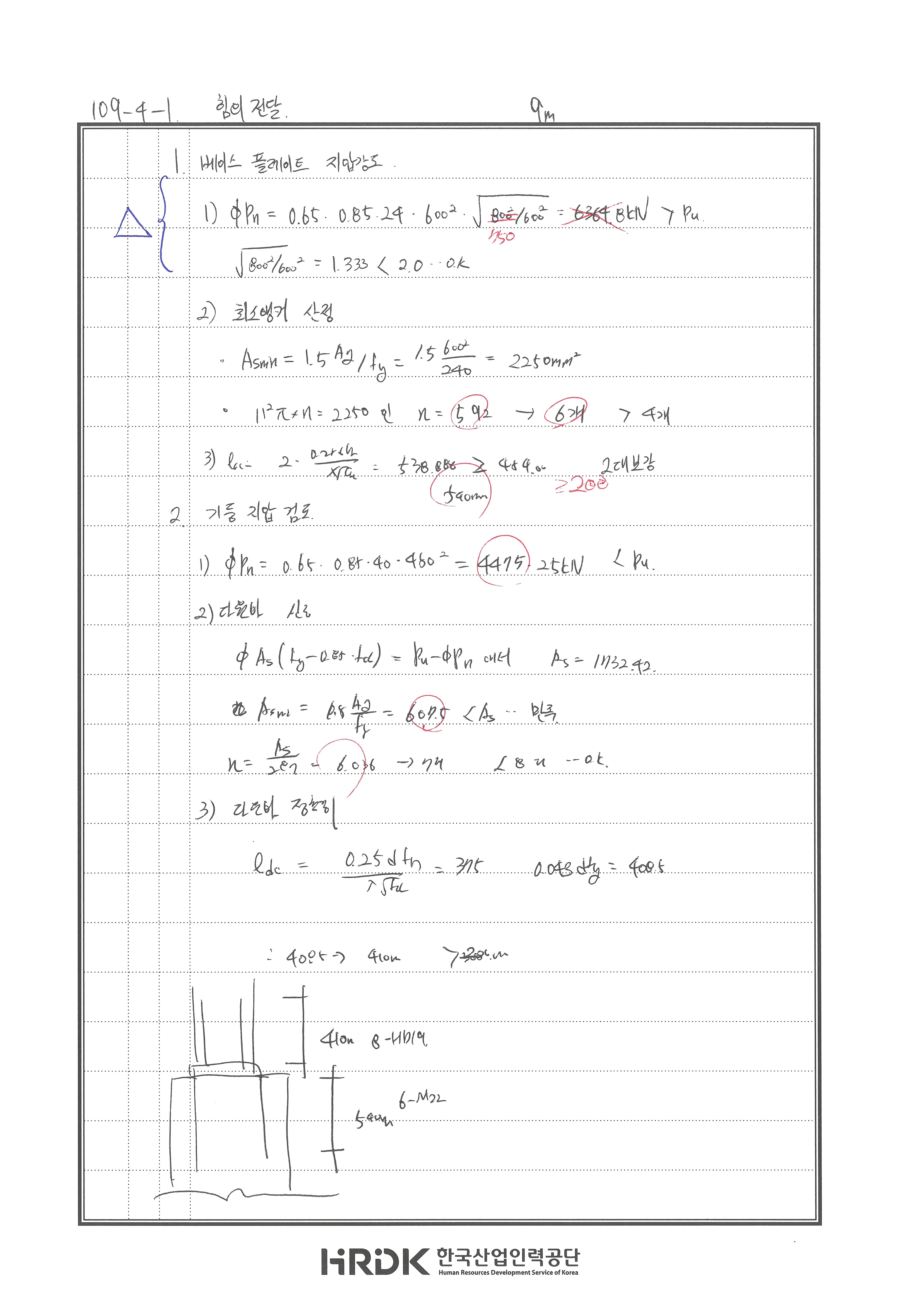 풀이 어렵지 않은 문제입니다. 240719 △ 페데스탈 800으로 계산함.. 도대체 왜? 240717 X 지압판의 앵커 산정 시 지압판 면적으로 산정 프리캐스트 철근은 압축철근 정착길이로 한다. 240704 X 240605 X