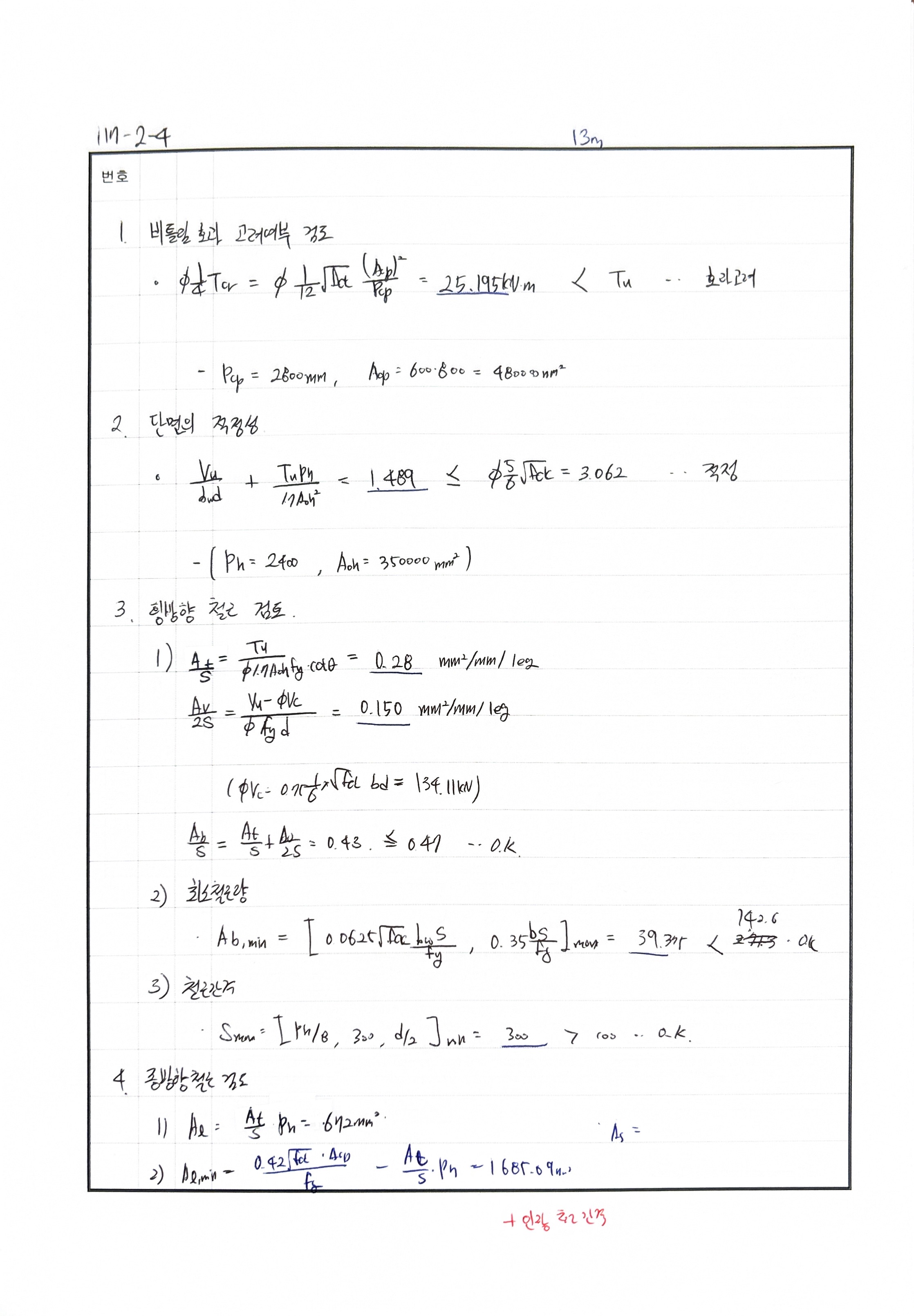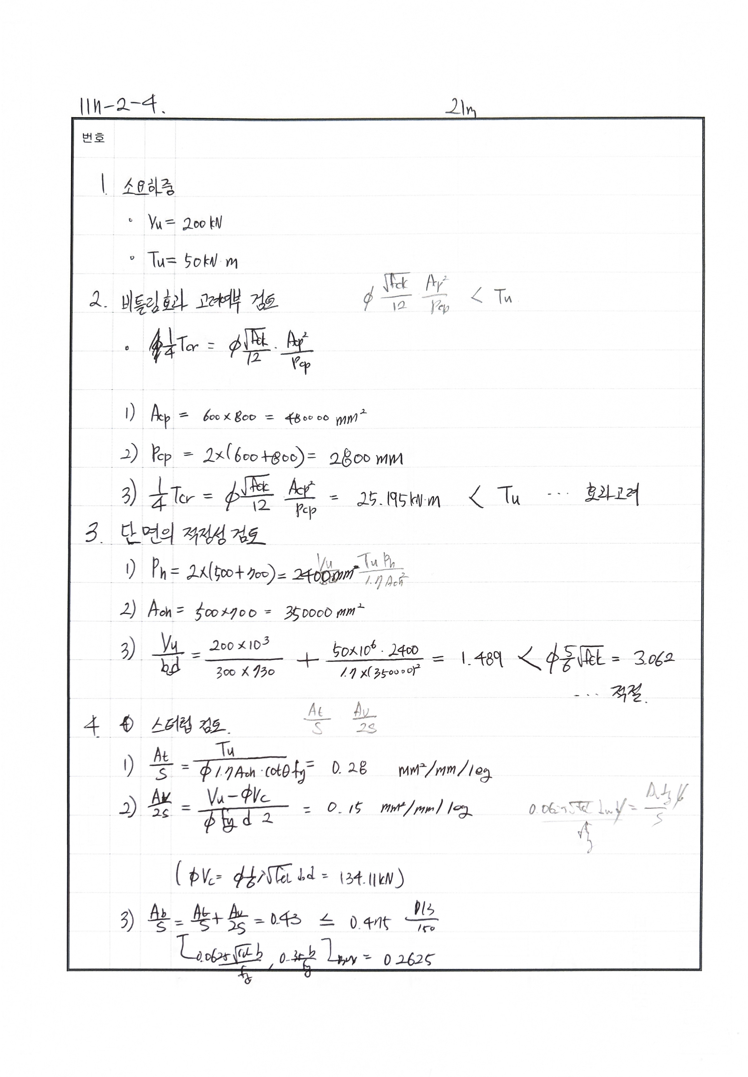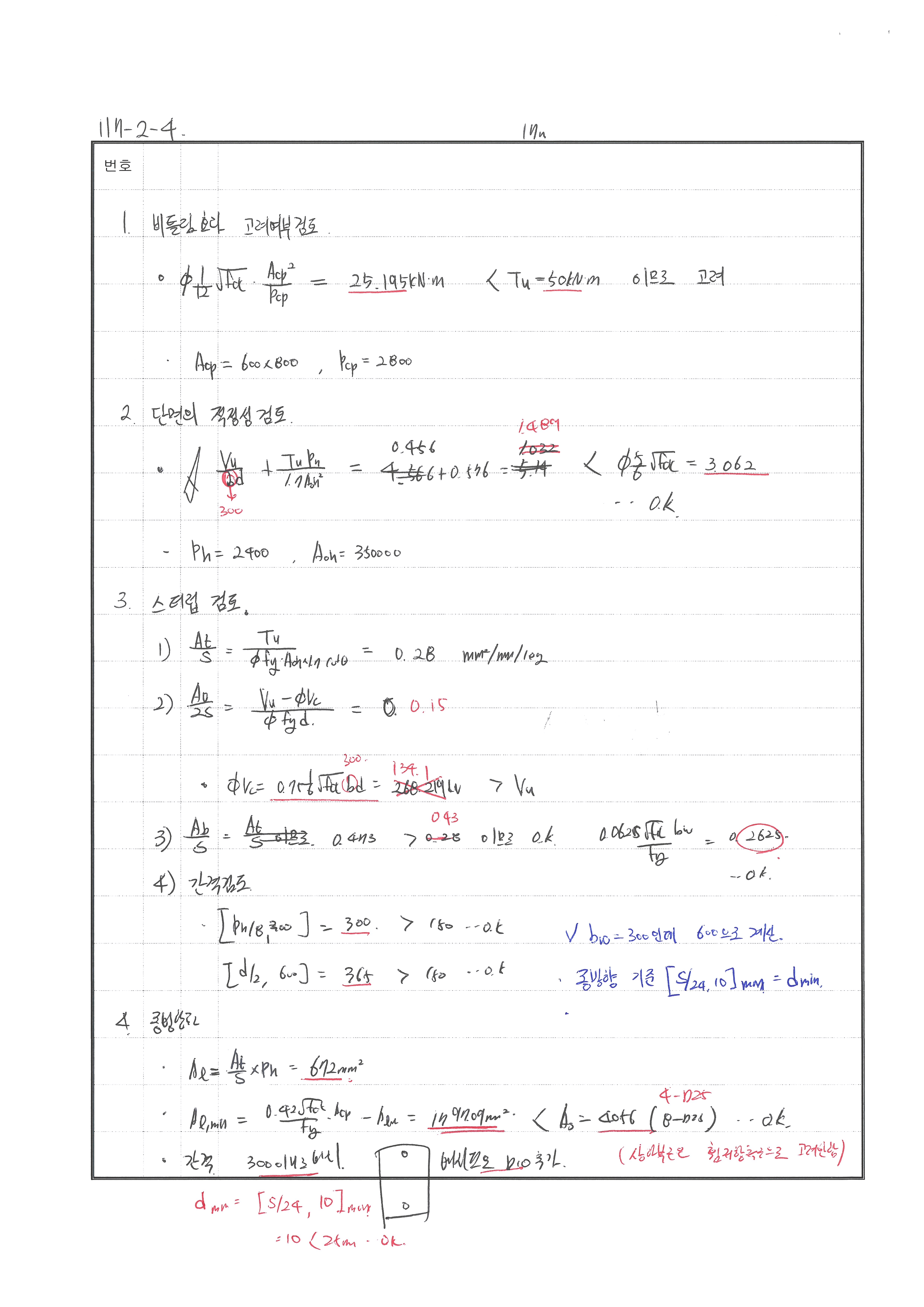 풀이 240716 O 실수 있음 fck 에 27넣어서 계산함.. 240621 △ bw 실수, 종방향 철근 검토 240507 X 비틀림에서 종방향 철근 산정 식 누락 240428 X 단변방향 철근 300초과함. 중간에 배근 추가