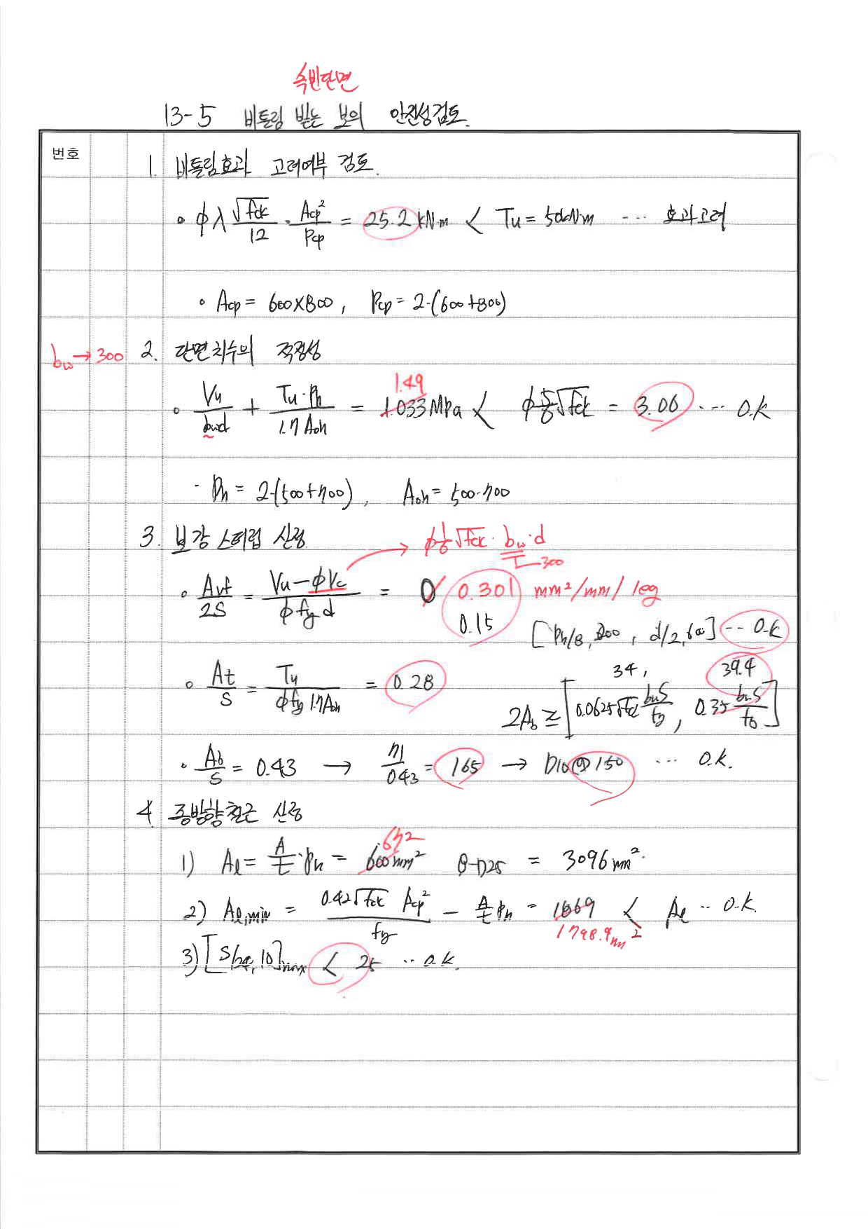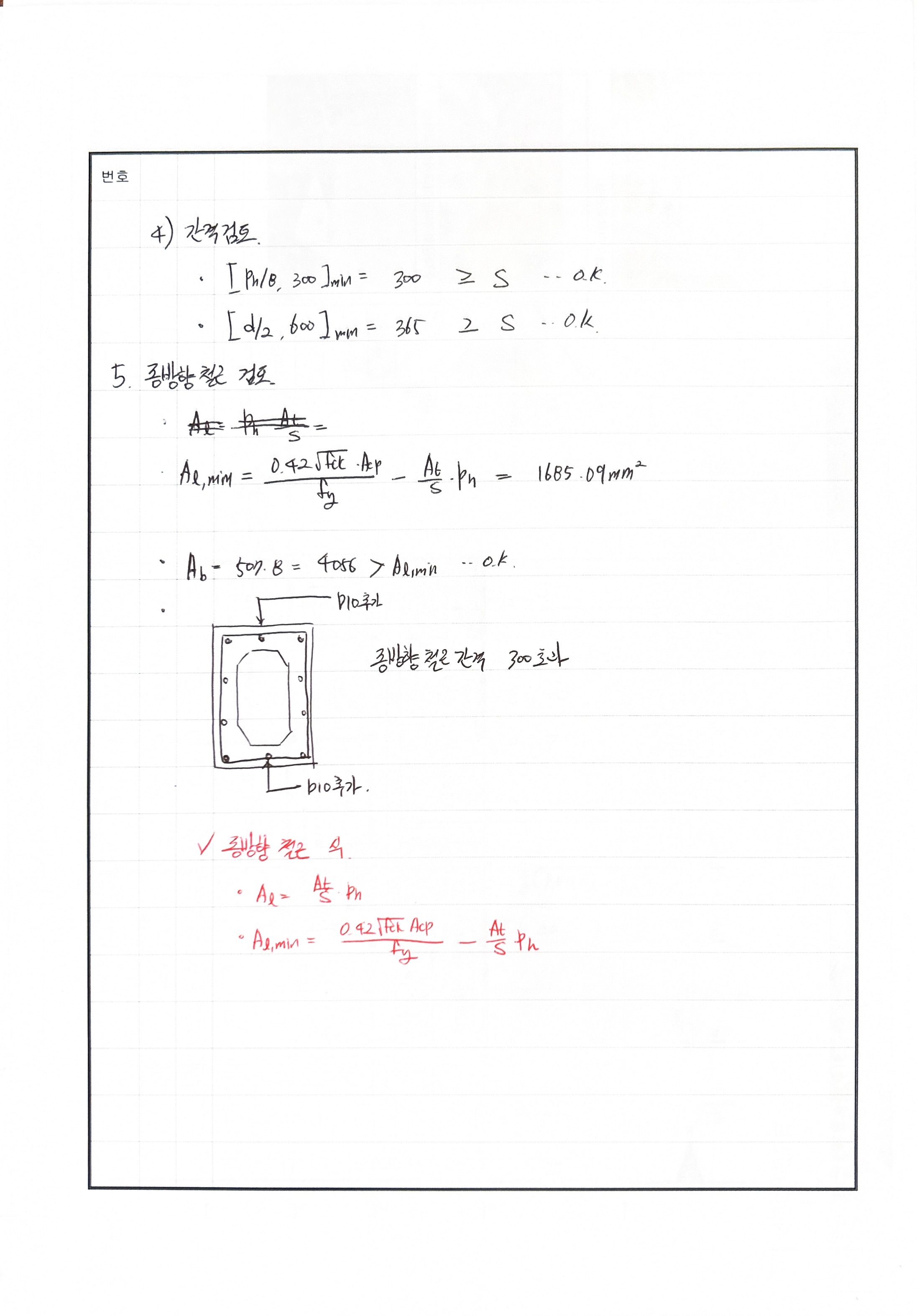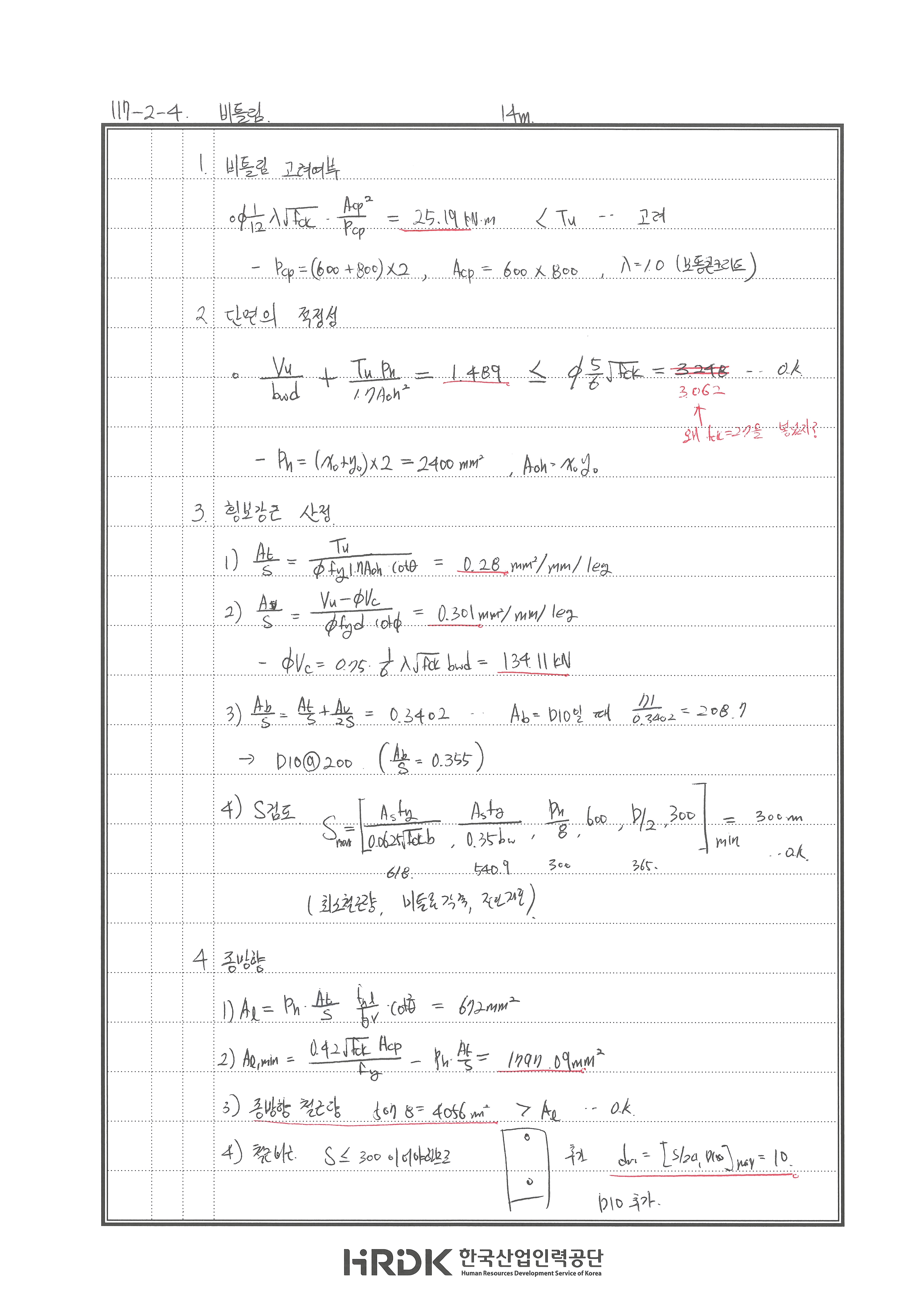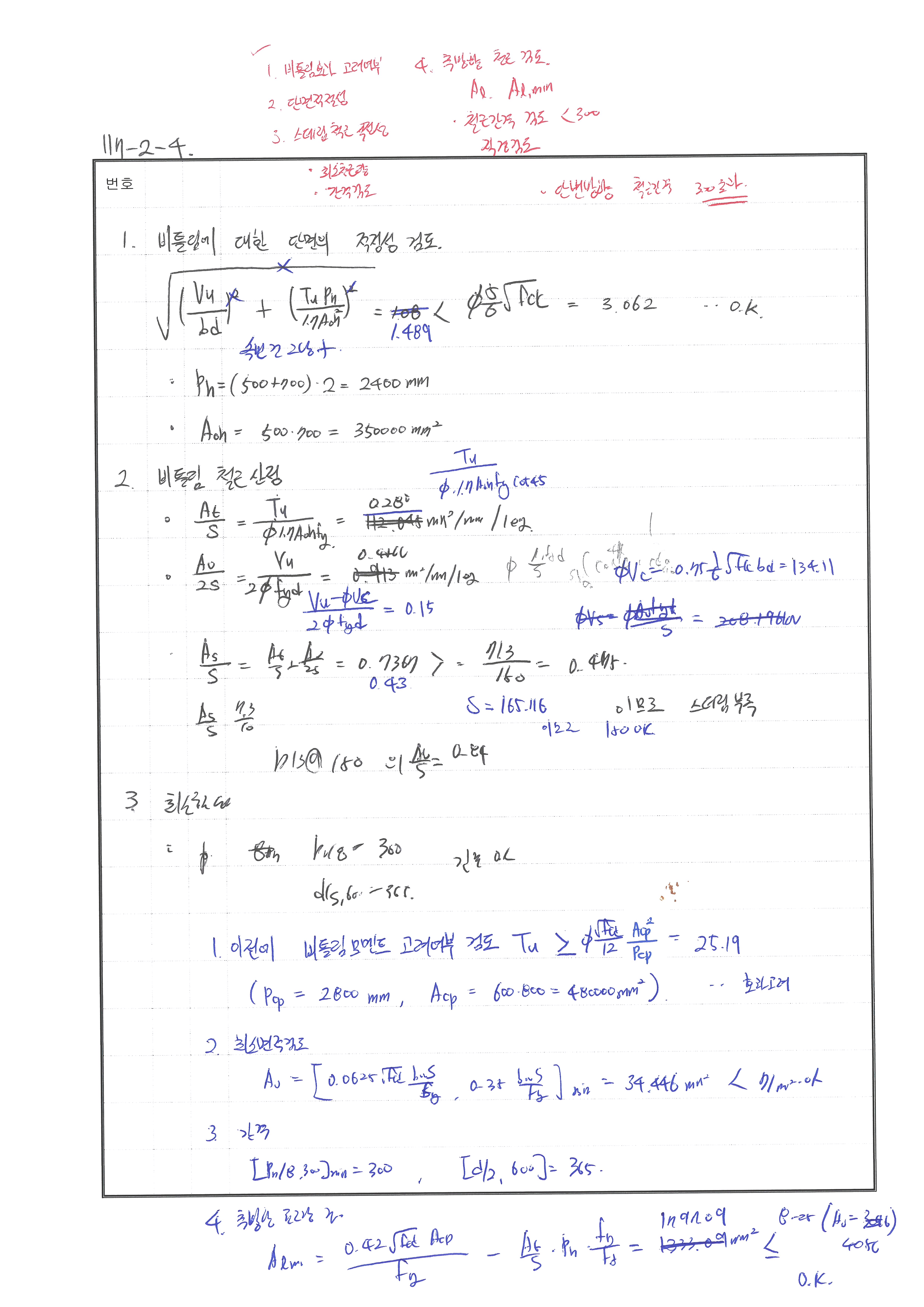 풀이 240716 O 실수 있음 fck 에 27넣어서 계산함.. 240621 △ bw 실수, 종방향 철근 검토 240507 X 비틀림에서 종방향 철근 산정 식 누락 240428 X 단변방향 철근 300초과함. 중간에 배근 추가