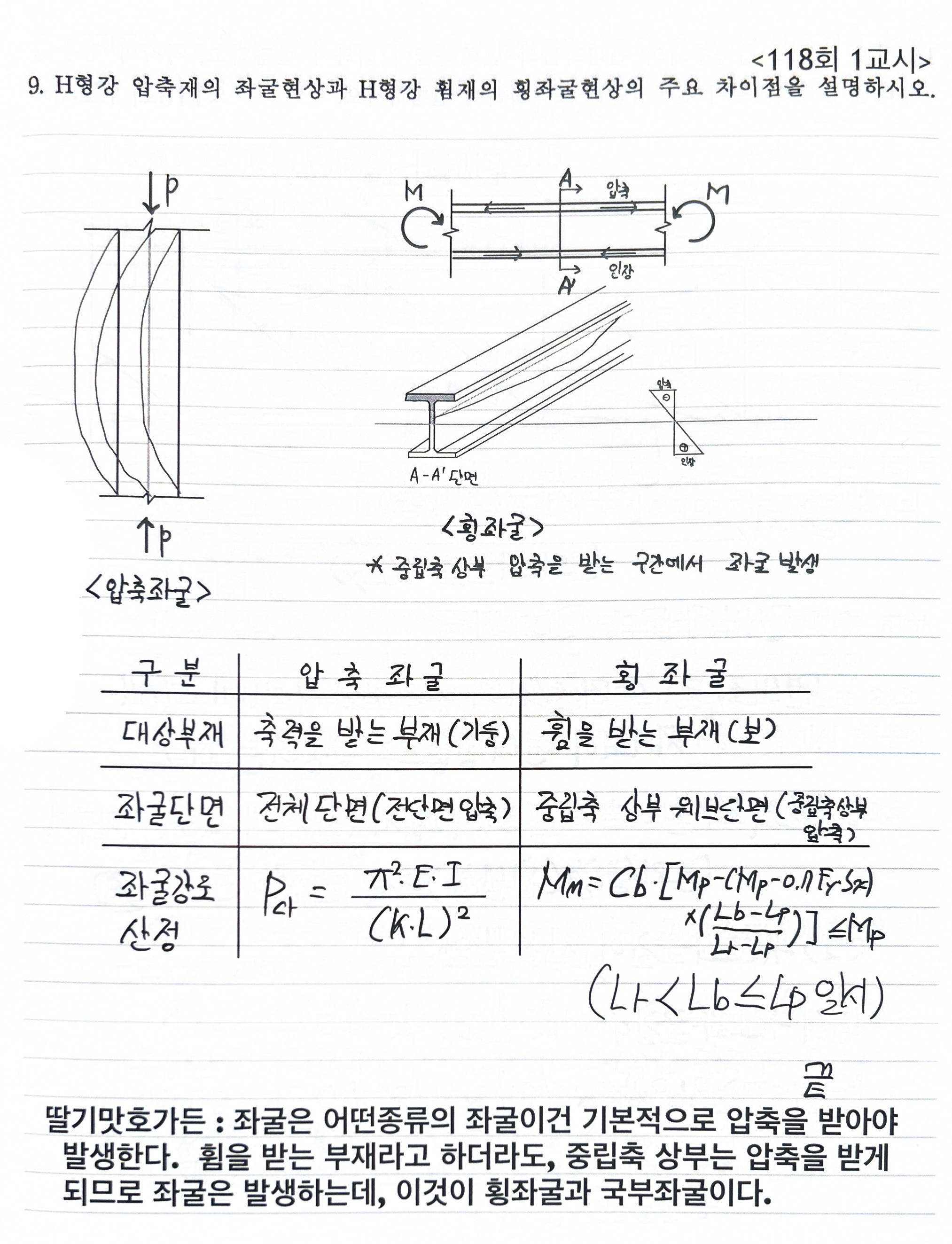 압축부재의 휨좌굴과 휨부재의 횡좌굴현상의 주요 차이점 압축부재는 국부좌굴, 휨좌굴 발생 휨부재는 국부좌굴, 횡좌굴 발생 여기서 국부좌굴은 발생하지 않는다고 가정 휨좌굴은 모든 단면이 같은 응력을 받다가 약축방향으로 좌굴이 발생하고 횡좌굴은 압축과 인장이 존재하므로 압축에서 약축방향으로 좌굴이 발생하면서 비틀림이 수반된다. 횡비틀림좌굴이라고도 함 탄성좌굴강도 Fe 과 Fy 값에 의해 휨좌굴강도가 결정 Fcr 비지지길이 Lb에 의해 탄성횡좌굴 비탄성횡좌굴이 결정 Mn