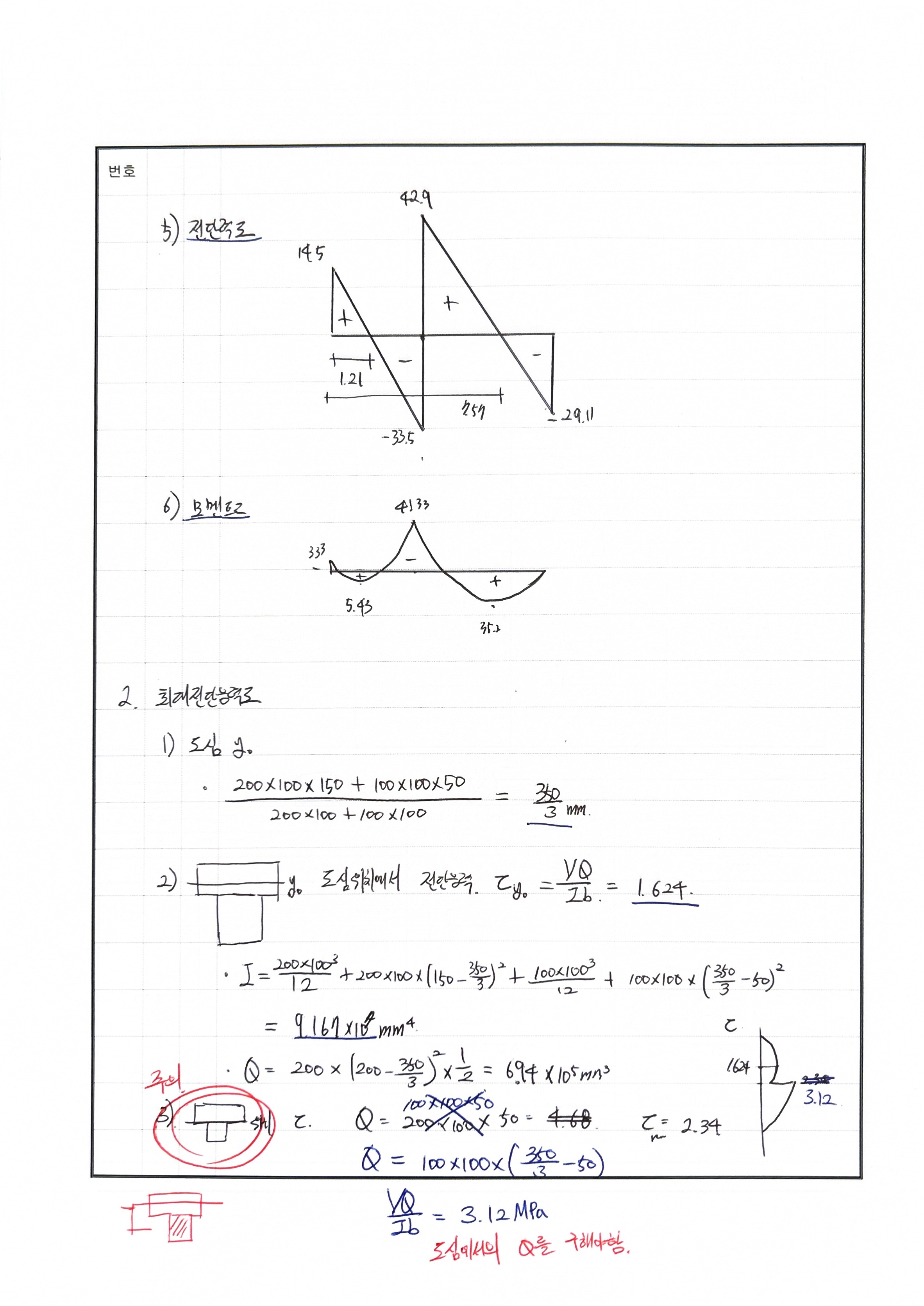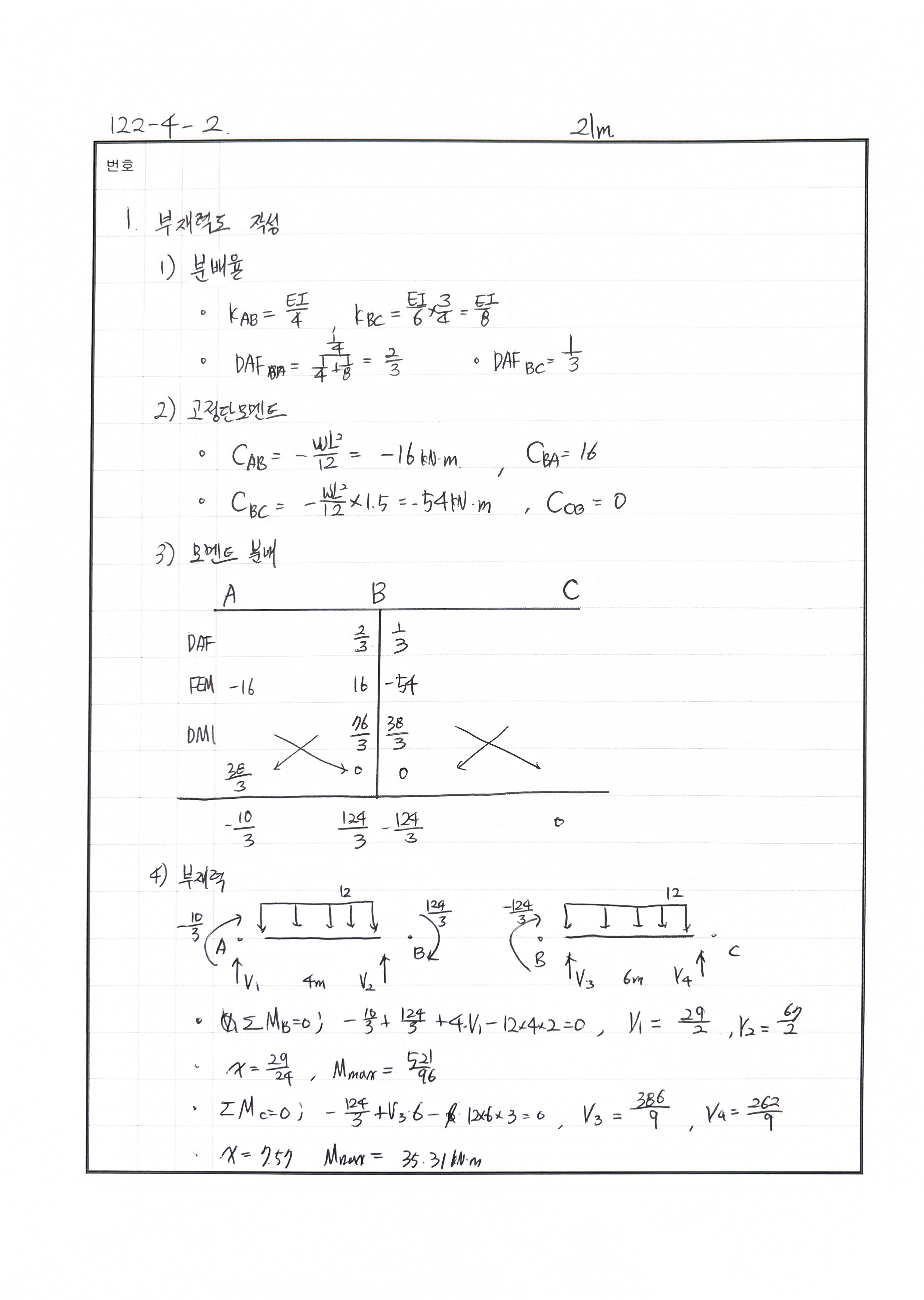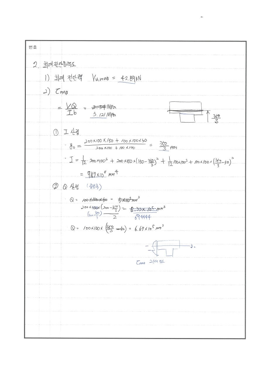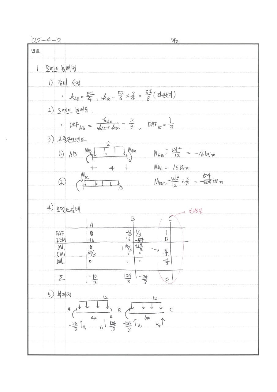 풀이 모멘트 분배법 : 힌지 전단응력도 산정시 : 도심이 중심이 아닌 경우 240511 △ 푸는 과정은 OK 더 빨리 풀어야함. 20분이내로 분배율 반대로 씀 240429 X 전단응력 산정시 Q값 산정에서 미스