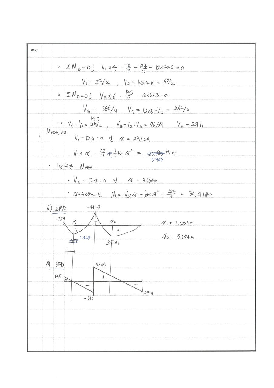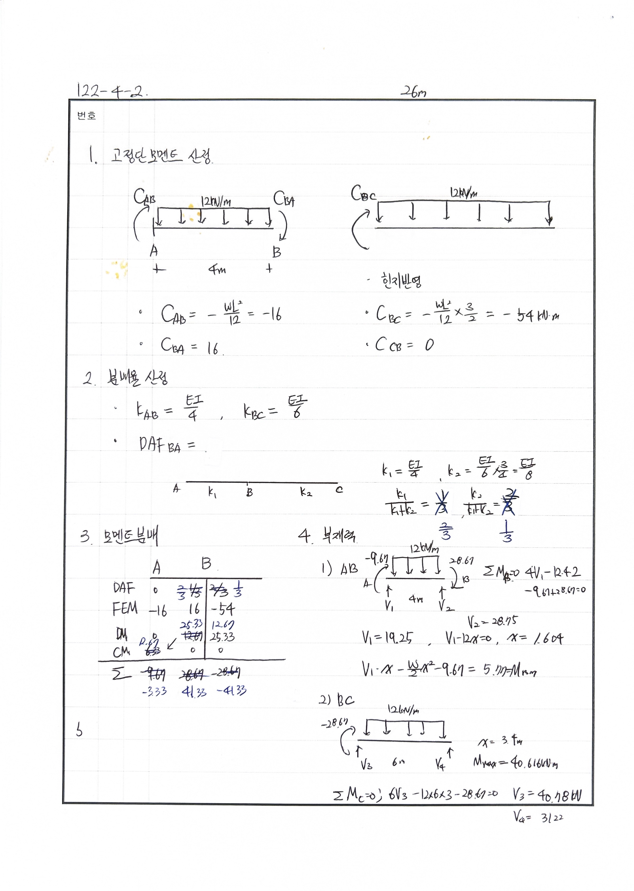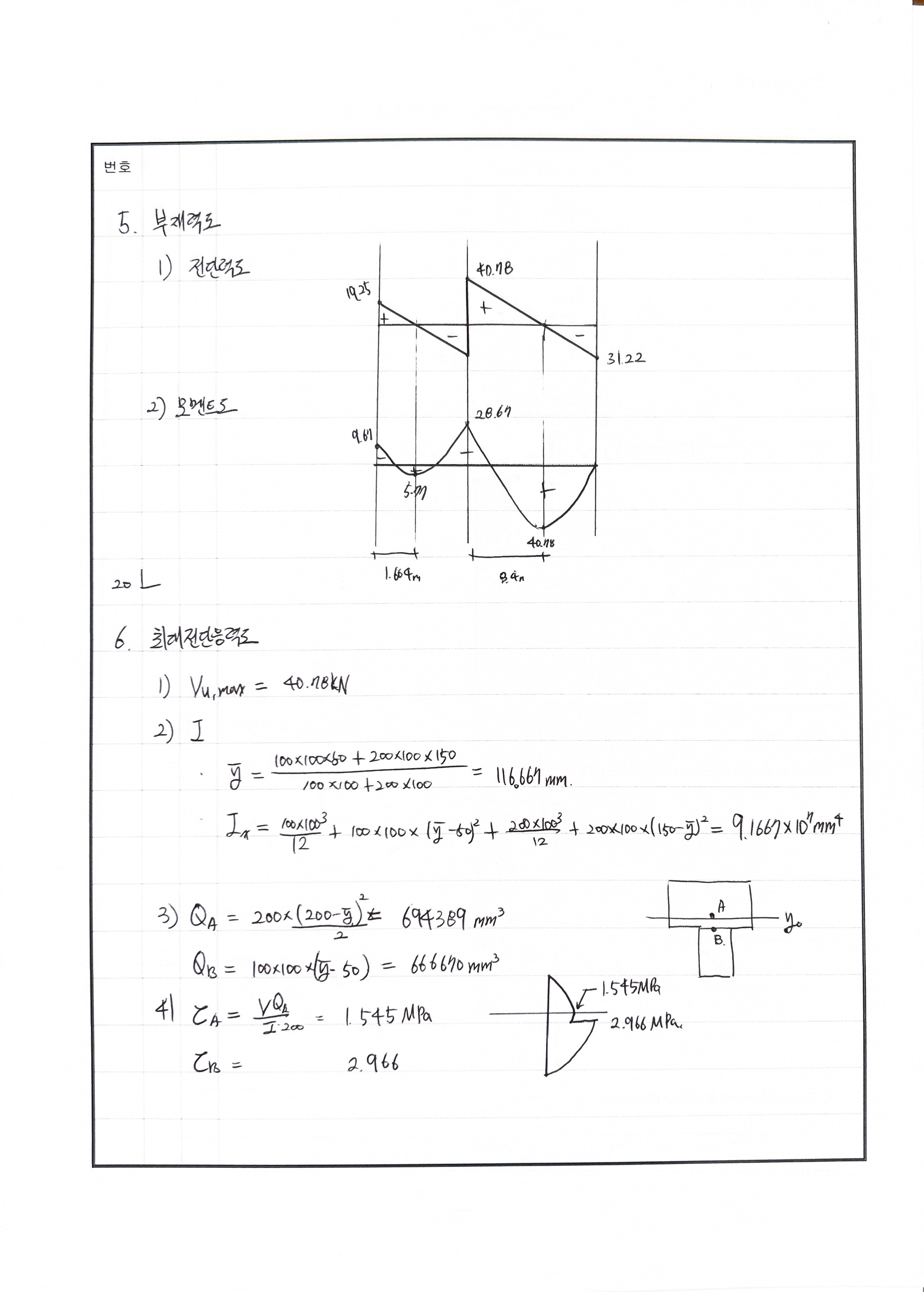 풀이 모멘트 분배법 : 힌지 전단응력도 산정시 : 도심이 중심이 아닌 경우 240511 △ 푸는 과정은 OK 더 빨리 풀어야함. 20분이내로 분배율 반대로 씀 240429 X 전단응력 산정시 Q값 산정에서 미스