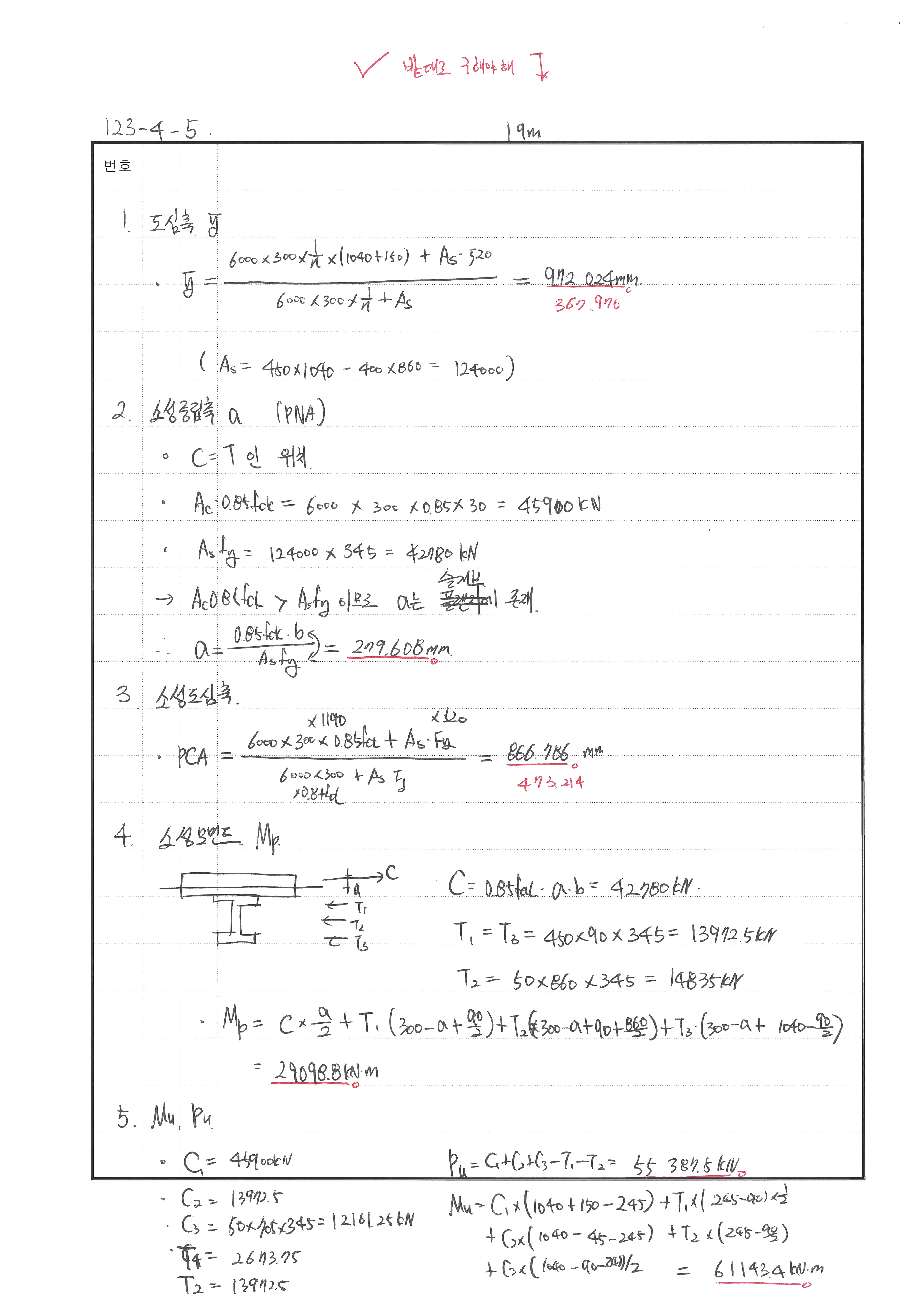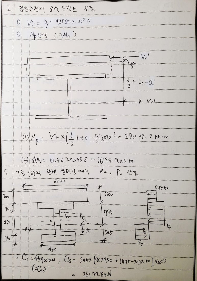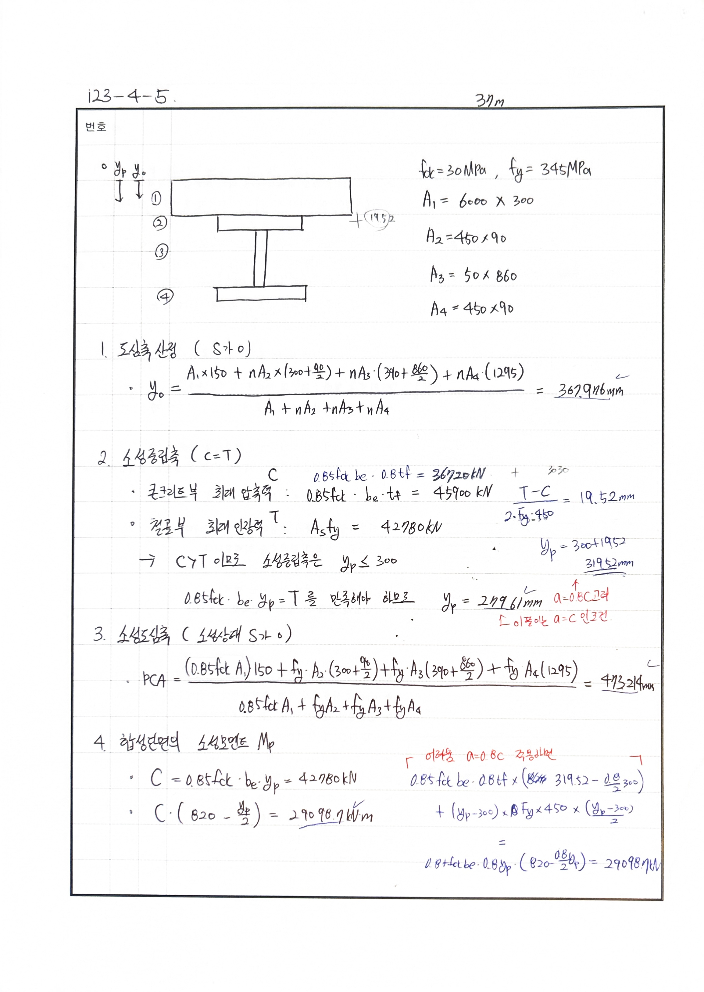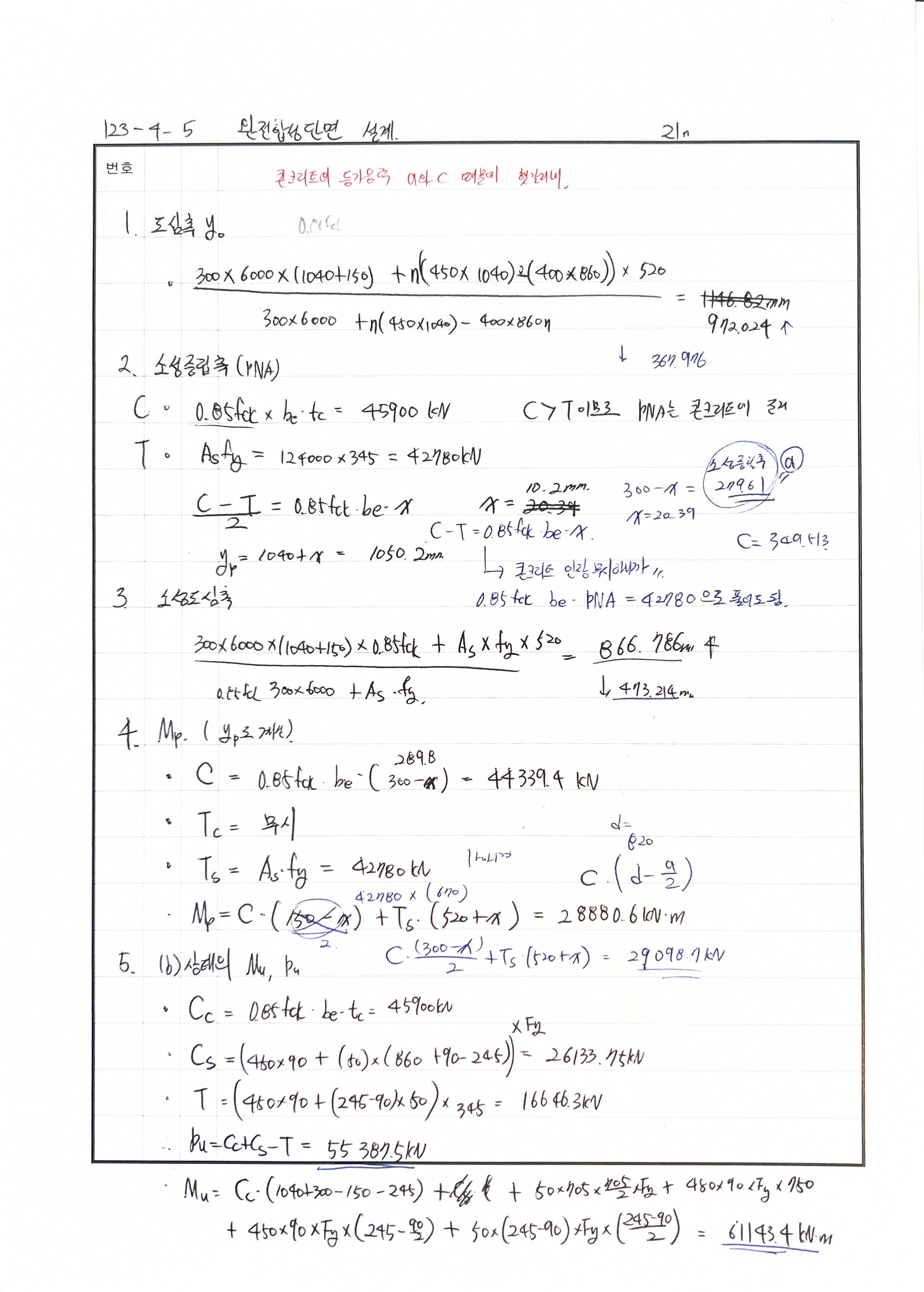 풀이 도심축 n 조심 소성중립축 C=T 소성도심축 (도심축에서 n고려 대신 fck Fy 고려) 소성모멘트 : 노출형합성보 모멘트 산정처럼 a 구해야함 최대모멘트, 최대축하중 : 강도감소계수 모멘트0.9 축력 0.75 → 강도감소계수 적용하지 않아도 될듯 240621 O 240530 X