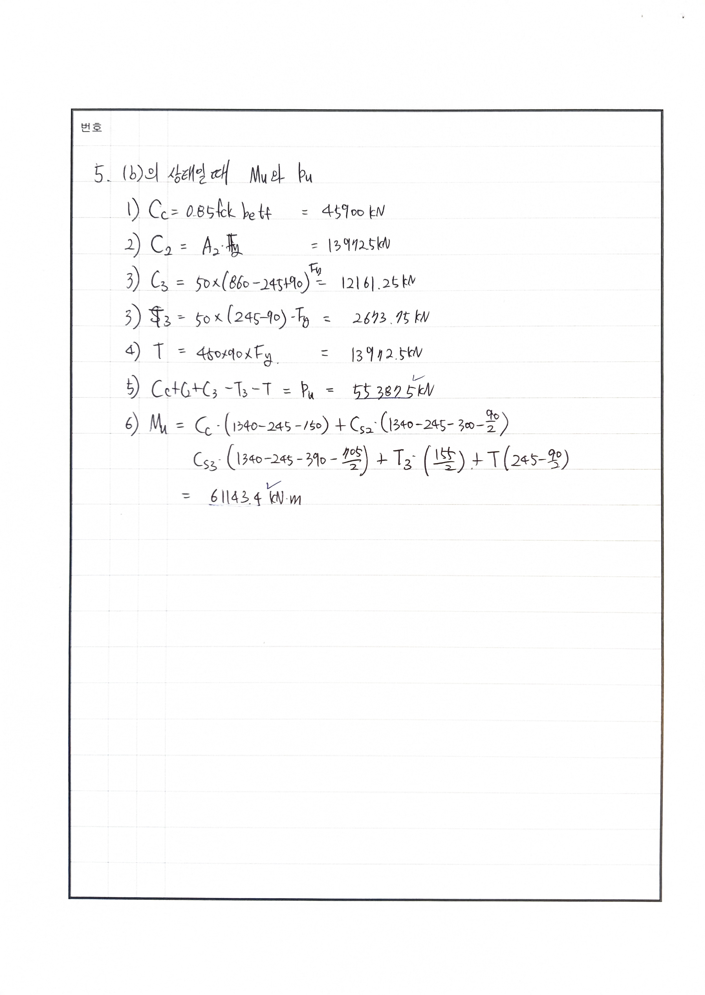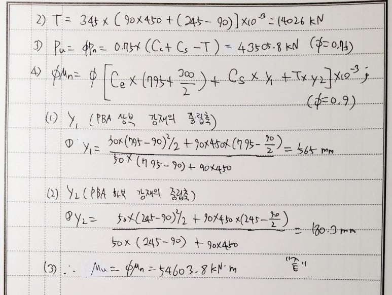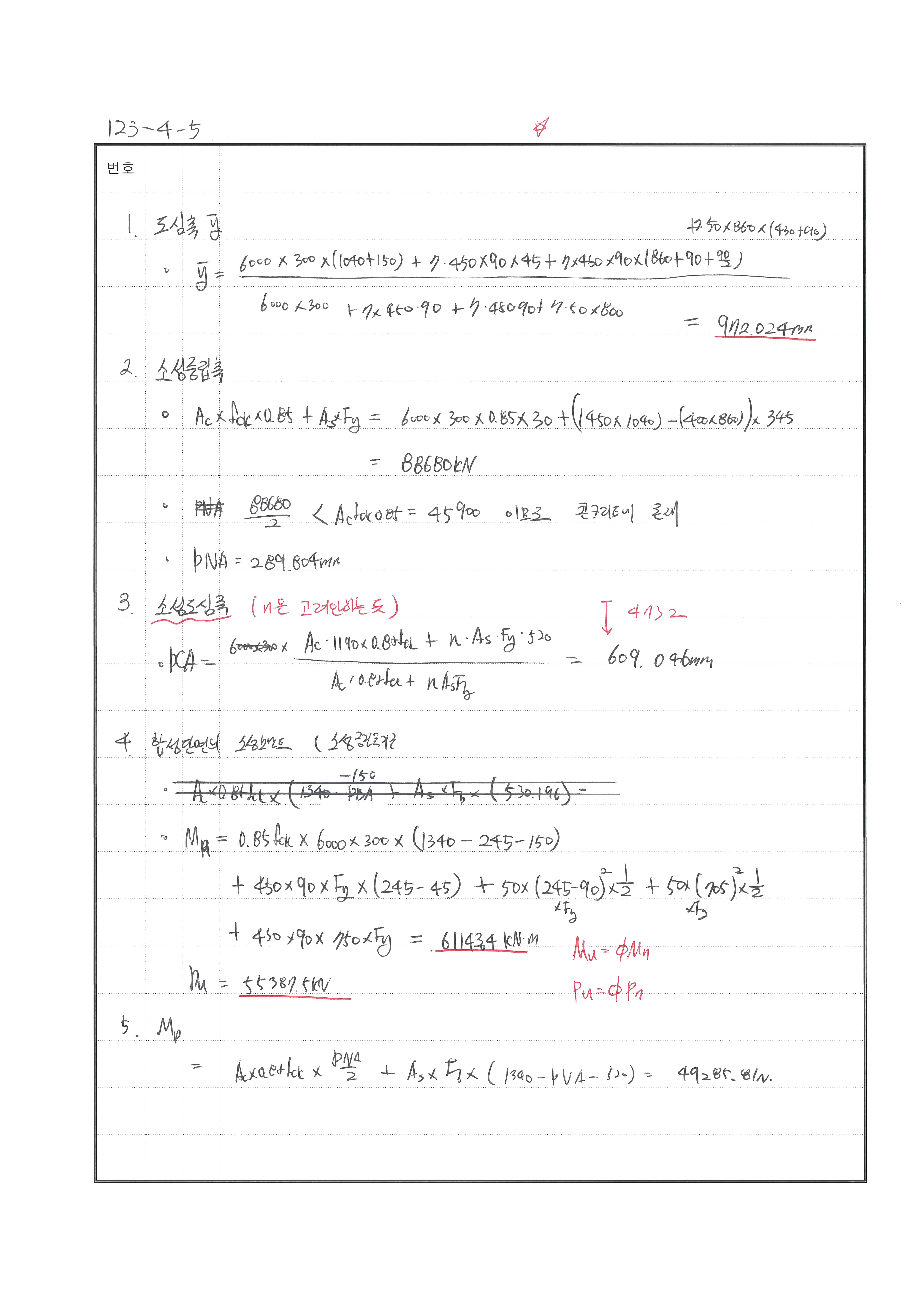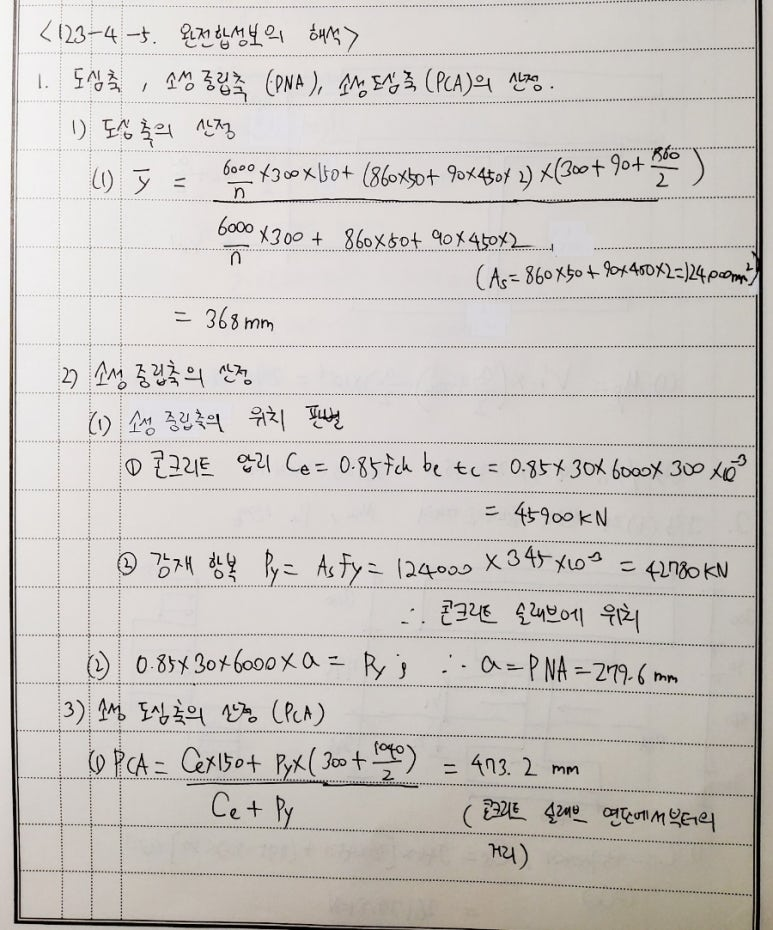 풀이 도심축 n 조심 소성중립축 C=T 소성도심축 (도심축에서 n고려 대신 fck Fy 고려) 소성모멘트 : 노출형합성보 모멘트 산정처럼 a 구해야함 최대모멘트, 최대축하중 : 강도감소계수 모멘트0.9 축력 0.75 → 강도감소계수 적용하지 않아도 될듯 240621 O 240530 X