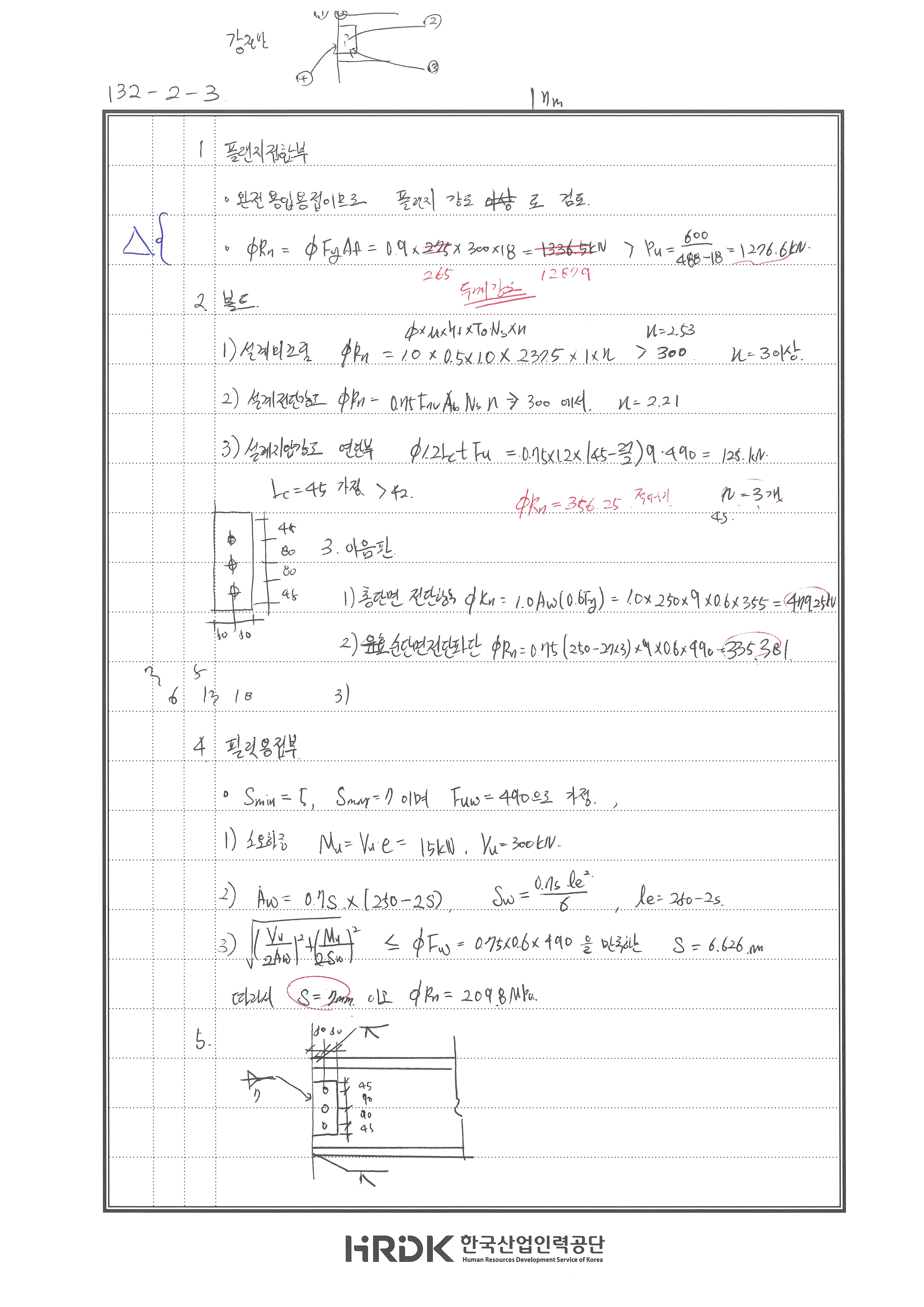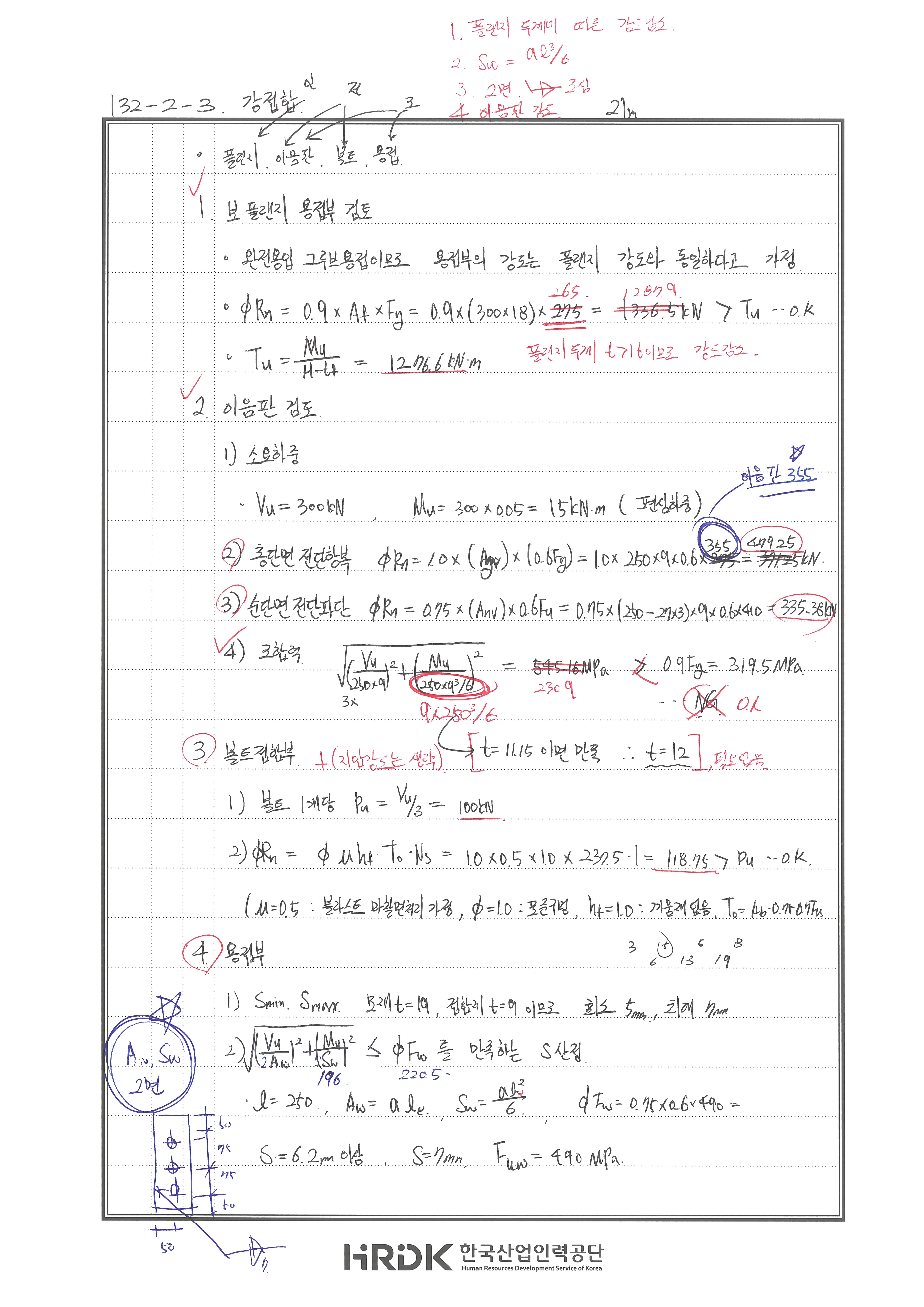 - 웨브이음 : 전단항복(479.25, 전단파단(335.281) 조합응력(280.951)
