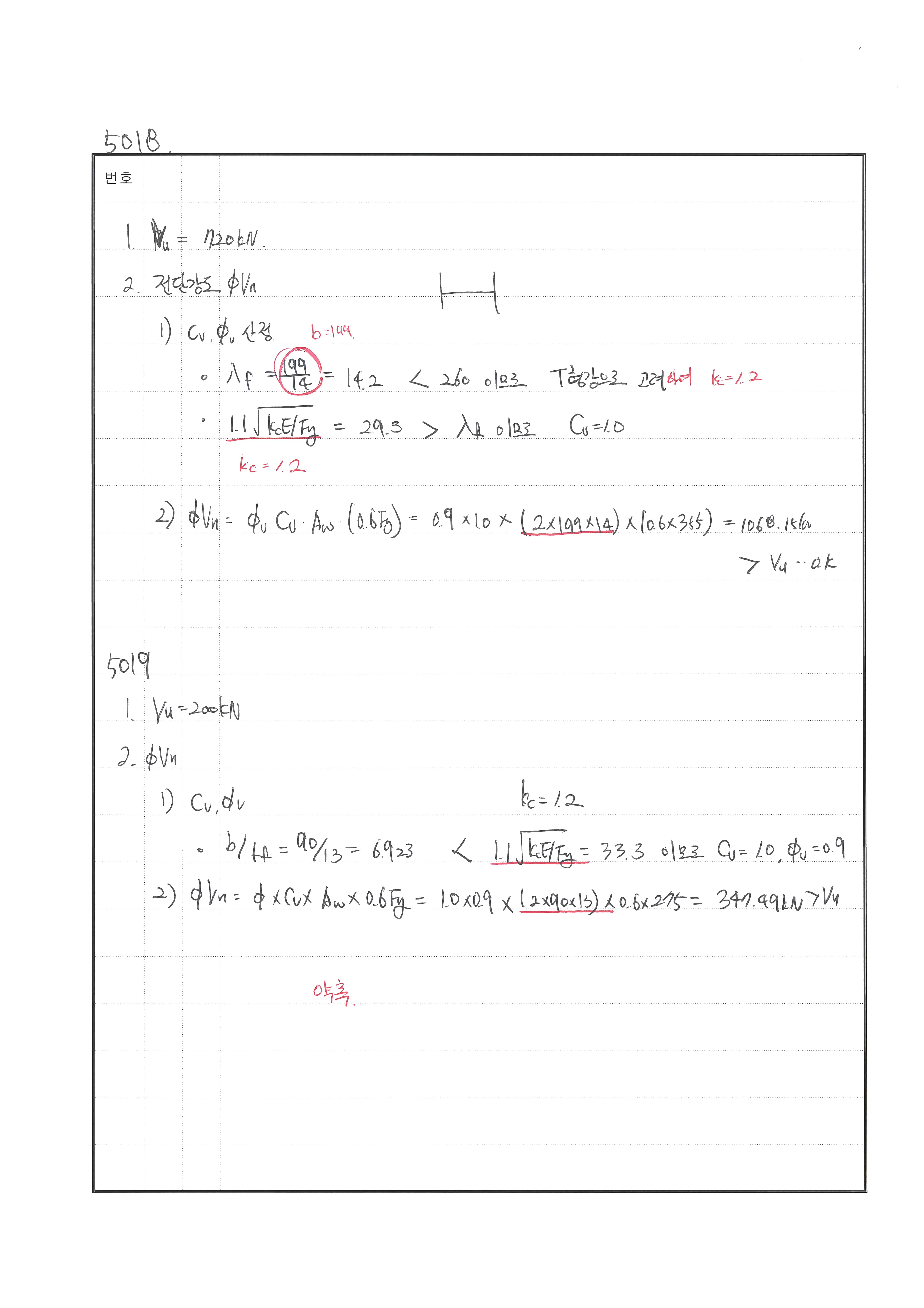 풀이 폭두께비 구할 때 b/2 해야 하는거 아닌가? 답이 틀리거 같아 플랜지 폭두께비 산정시 λf=(b/2)/tf 240717 X 전단 1.1FykvE 240708 O 240611 X X