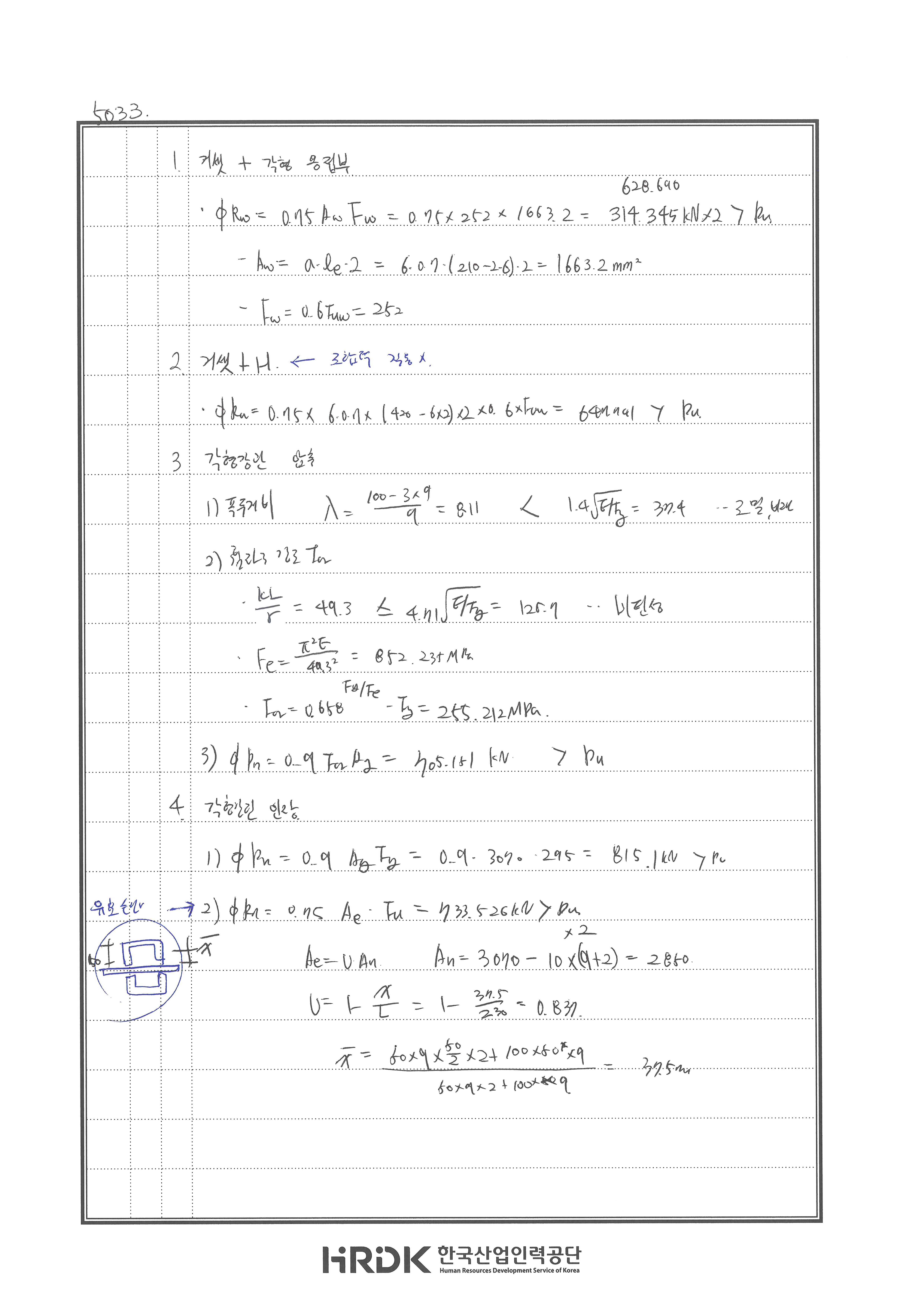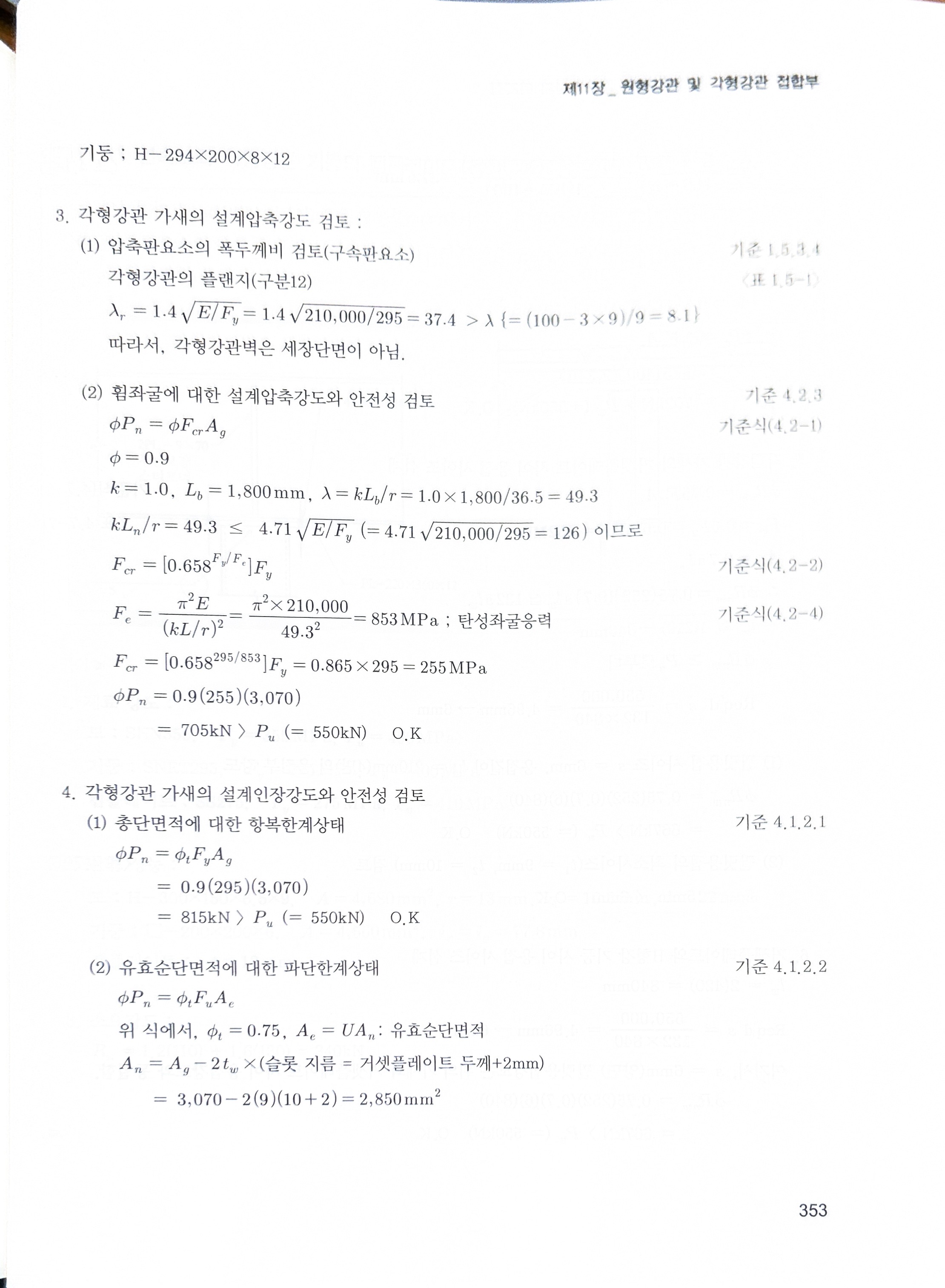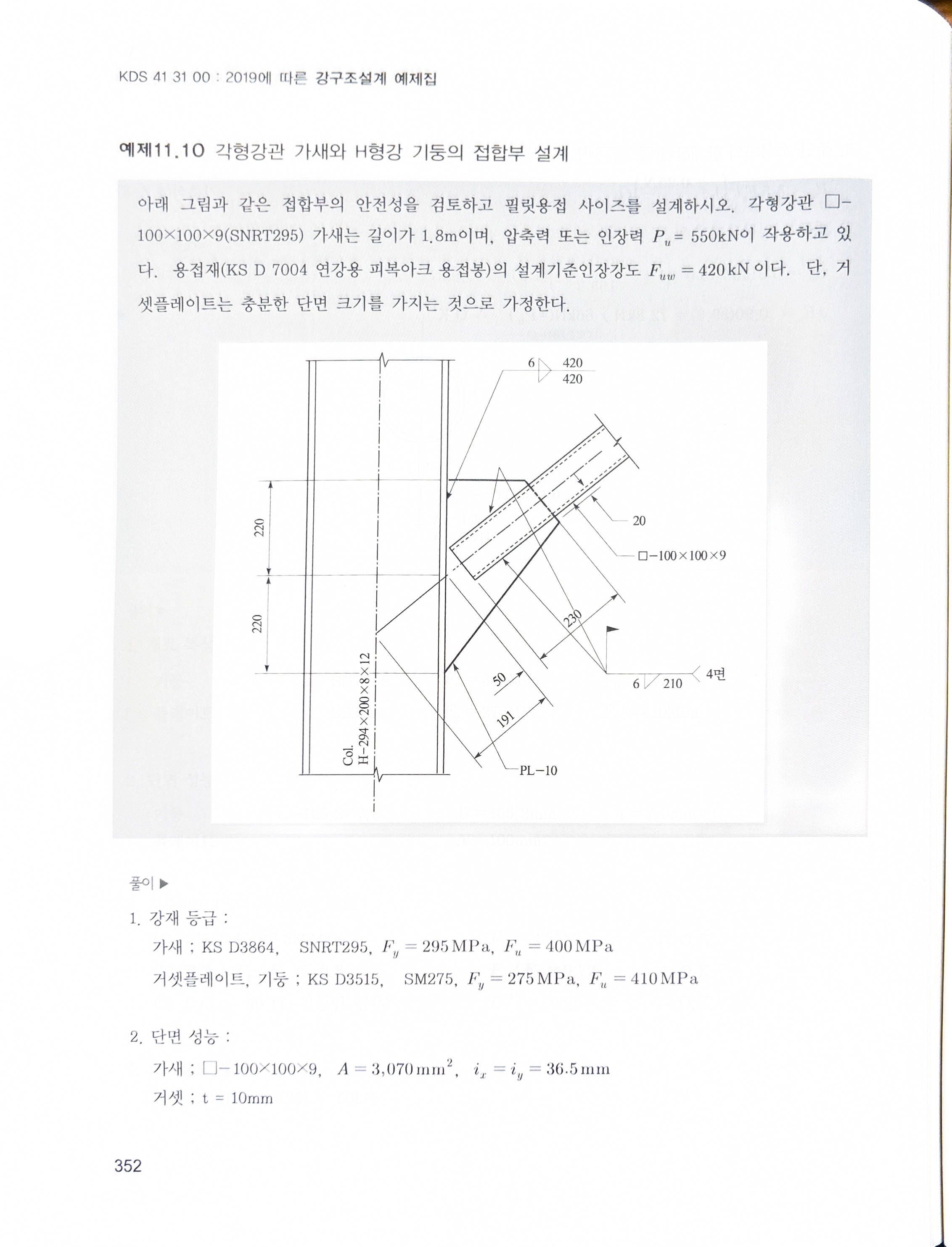 각형강관의 압축강도 검토 각형강관 + 가재 접합 인장강도 검토 각형강관 + 가재 접합 필릿용접부 검토 가새 + H형강 필릿용접부 검토 → 볼트로 1바꿔서 나올 수도