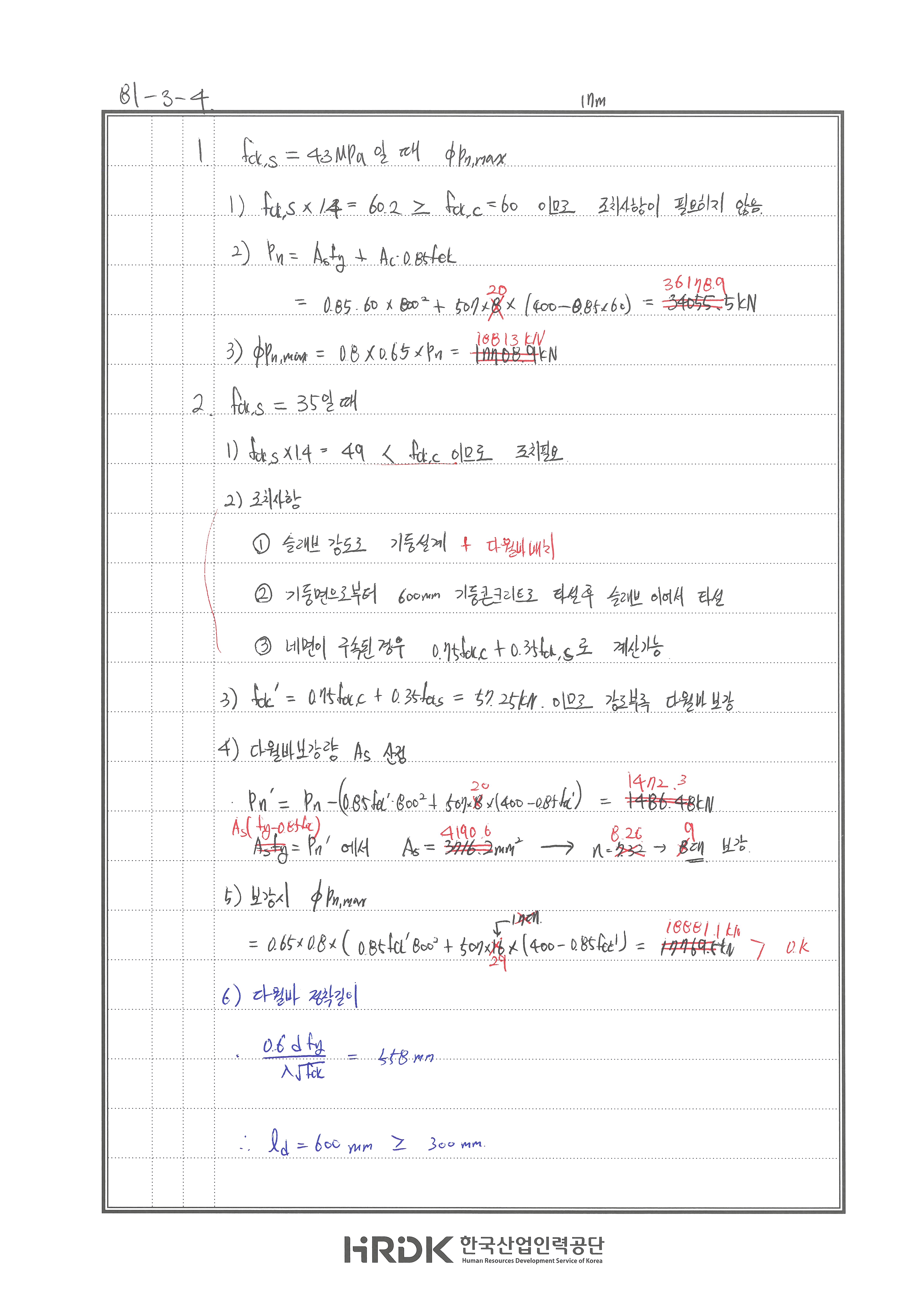 풀이 특별할거 없는 문제인줄 알았는데 어렵네.. 240703 X 정착길이 누락, 철근 갯수 실수, 보강시 철근강도 체크 240527 X 0.8미스, 최소철근비 없고, 정착길이 미산정, 검토해주면 좋겠네
