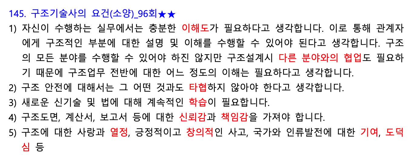 예상질문이고, 구조기술사 윤리강령에 나온 사항을 중점으로 그대로 읇지않고.. 실무시 간접적으로 발생한 안전사고 사례를 들어서 설명함. 결국은 사명감과 책임감이죠~ ㅎ