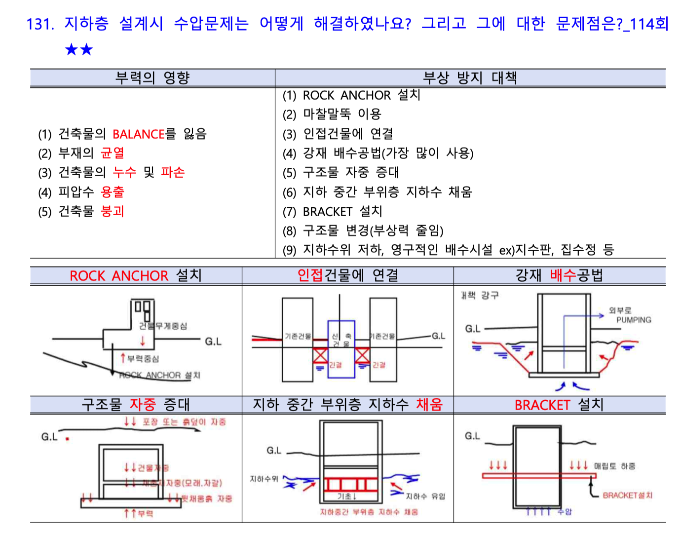 건축구조기술사 면접 시 “지하층 설계 시 지하수압 해결 방안” 질문에 대한 답변 예시